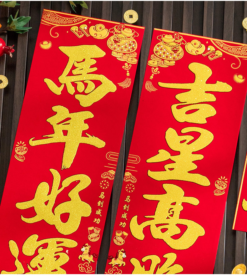 | golden horse sending blessing flannel couplet (with adhesive) (this option does not have fu character)(金马送福绒布对联(自带背胶)(此选项没有福字)) | USD $5.45 | 990 piece available |