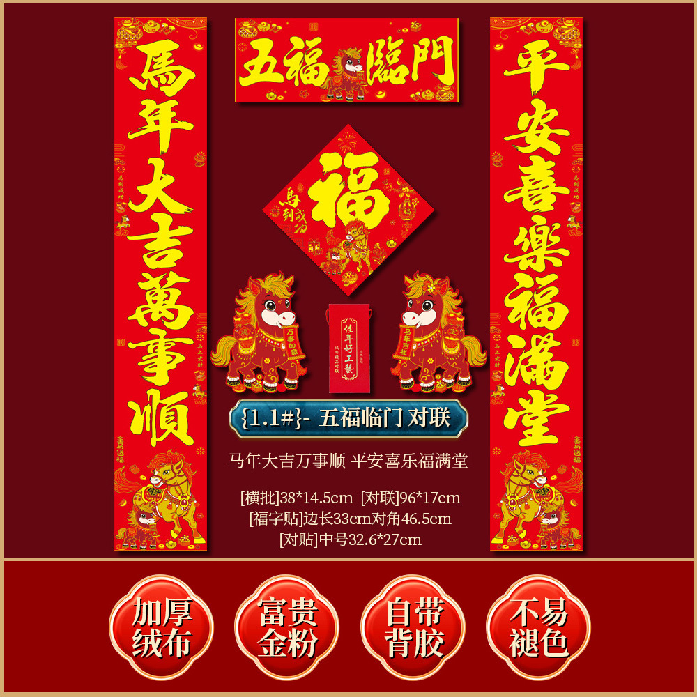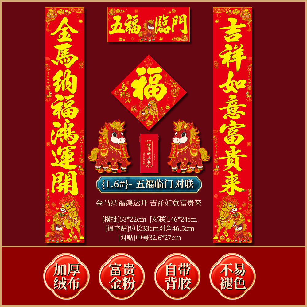 | golden horse sending blessing flannel couplet (with adhesive) (a piece of jiafu word)(金马送福绒布对联(自带背胶)(加福字一张)) | USD $1.41 | 1000 piece available |