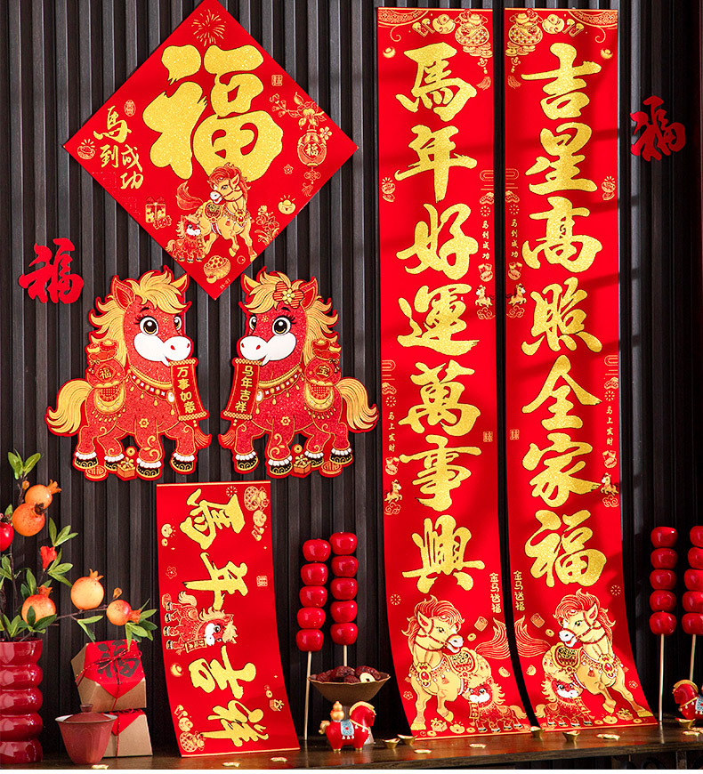 | golden horse sending blessing flannel couplet (with adhesive) (a piece of jiafu word and a pair of stickers)(金马送福绒布对联(自带背胶)(加福字一张和对贴一对)) | USD $1.07 | 1000 piece available |