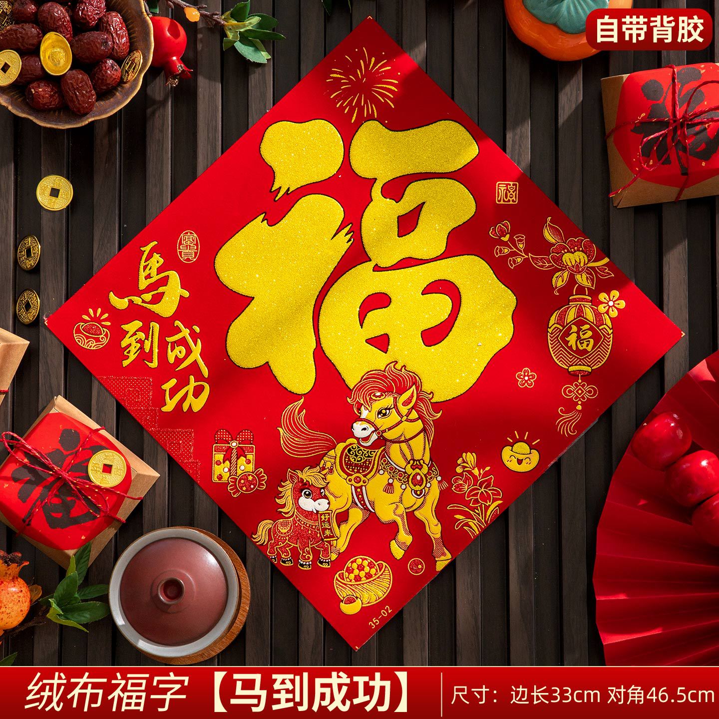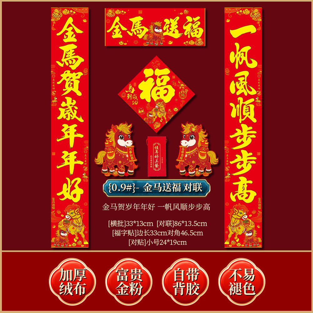 | golden horse sending blessing flannel couplet (with adhesive) (this option does not have fu character)(金马送福绒布对联(自带背胶)(此选项没有福字)) | USD $1.92 | 978 piece available |