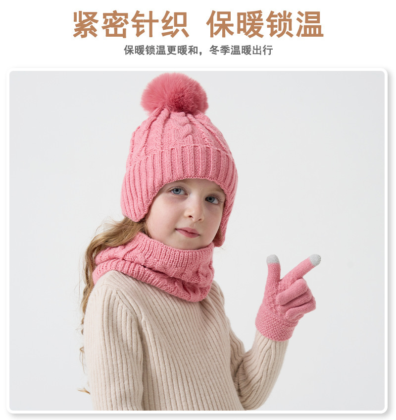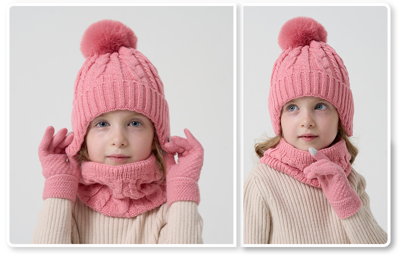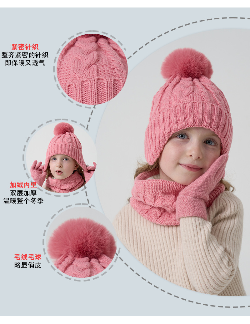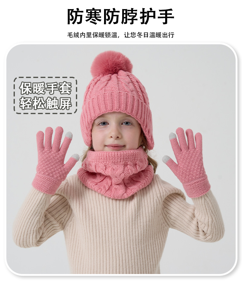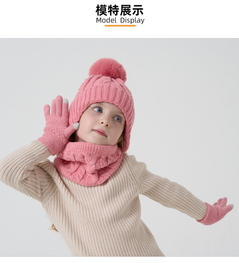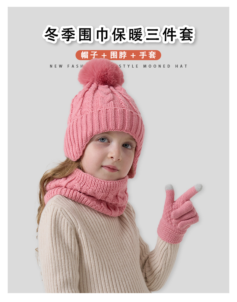 跨境新款欧美儿童帽子围巾手套三件套秋冬加绒加厚单球宝宝帽子