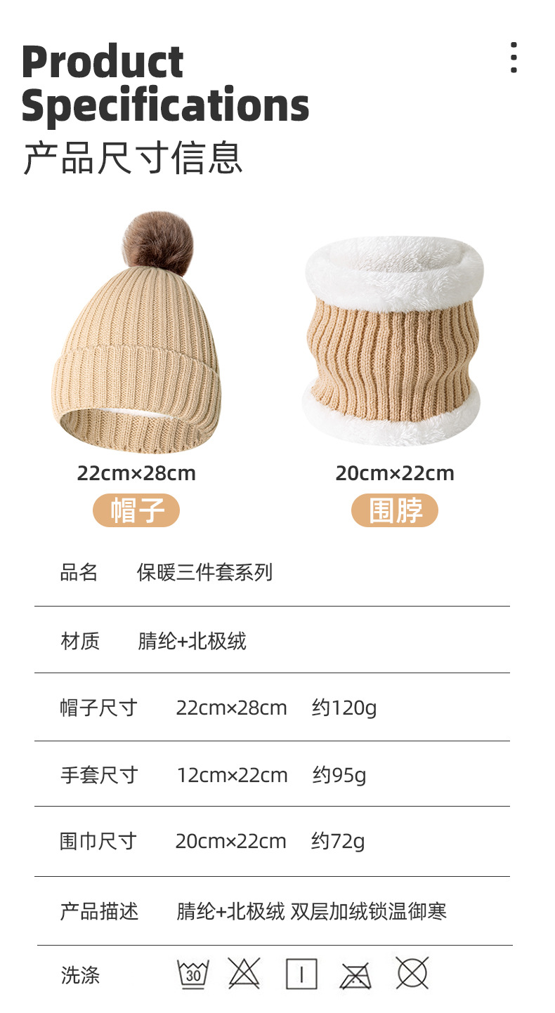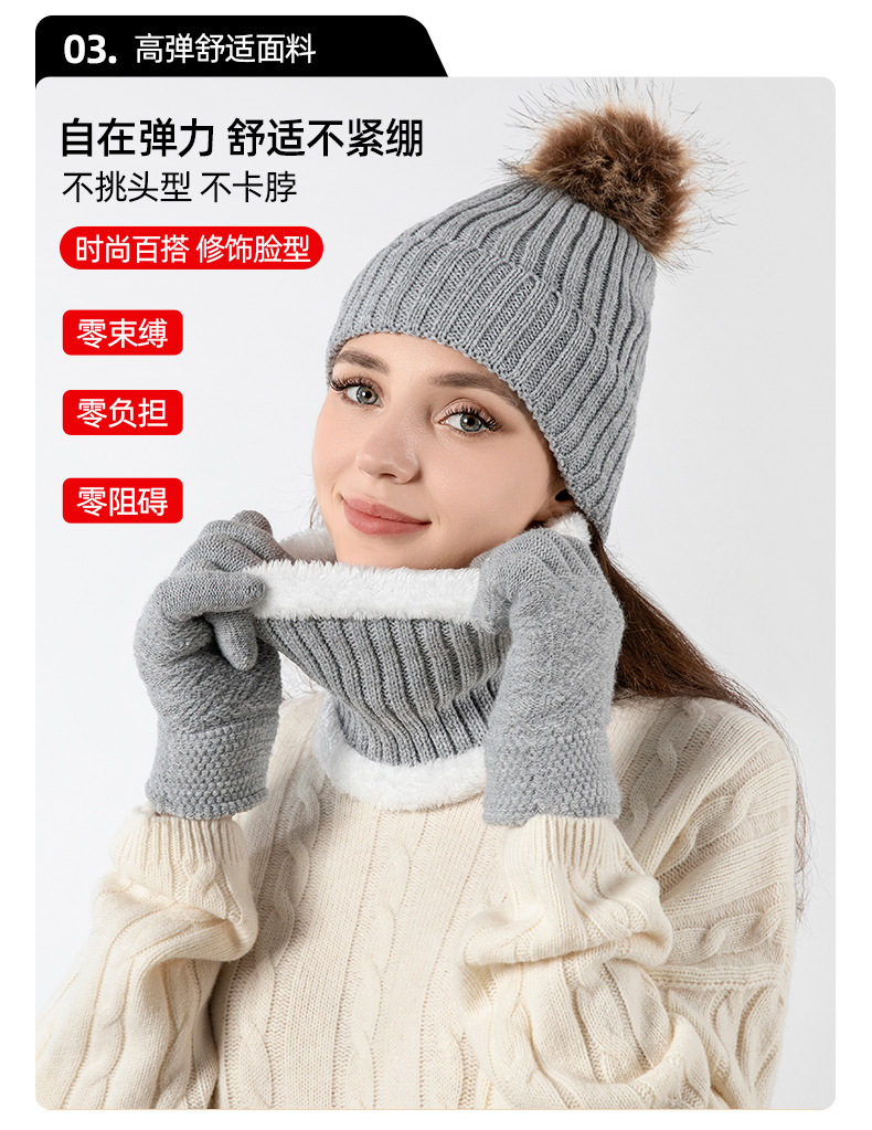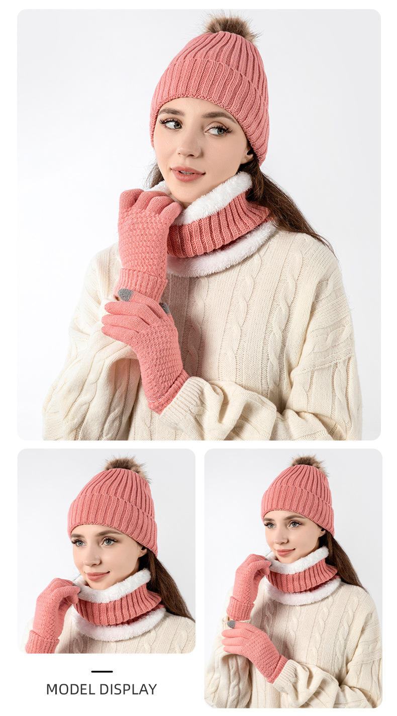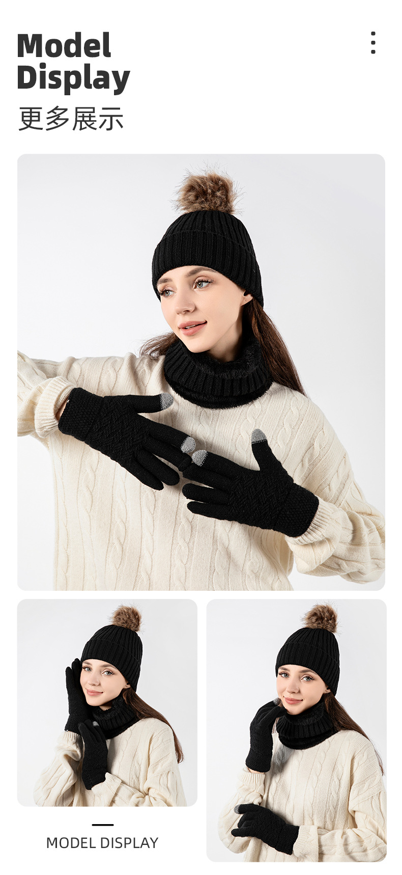 跨境外贸冬季针织帽子加绒保暖套装帽子围脖触屏手套三件套批发