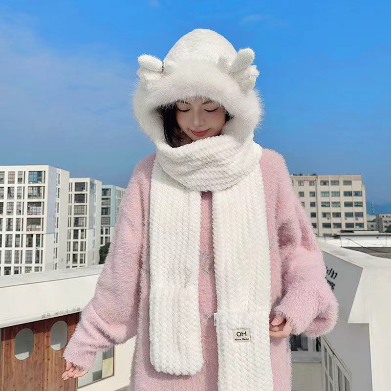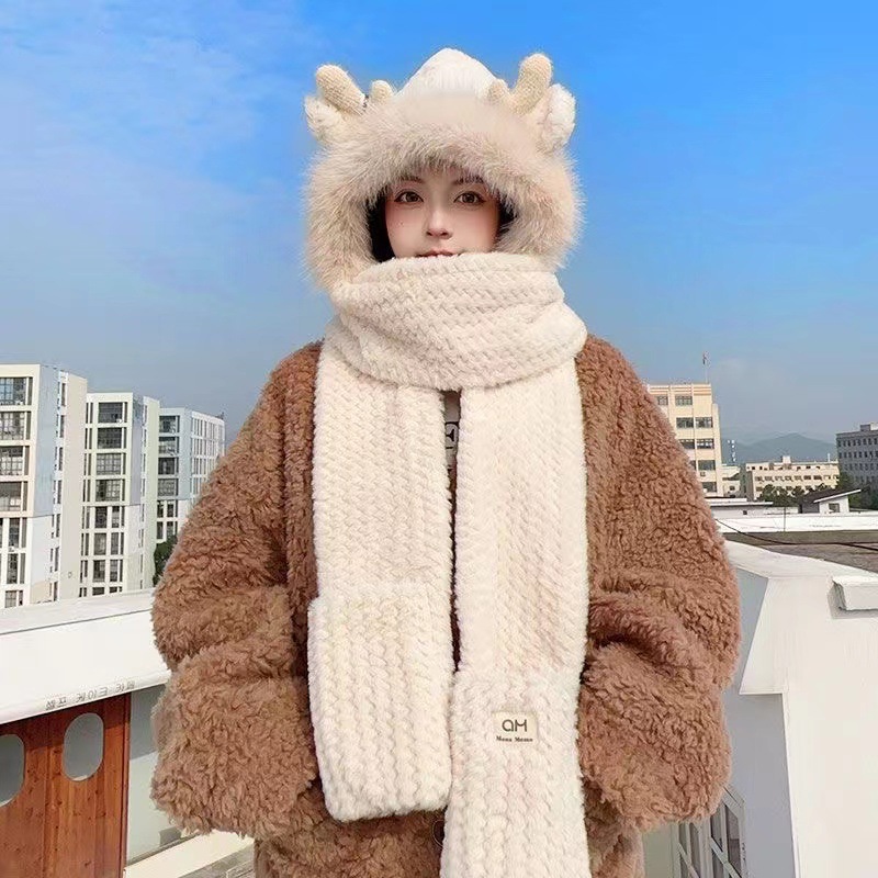 可爱冬天小鹿角毛茸茸保暖护耳三件套双层加厚围巾手套一体帽子女