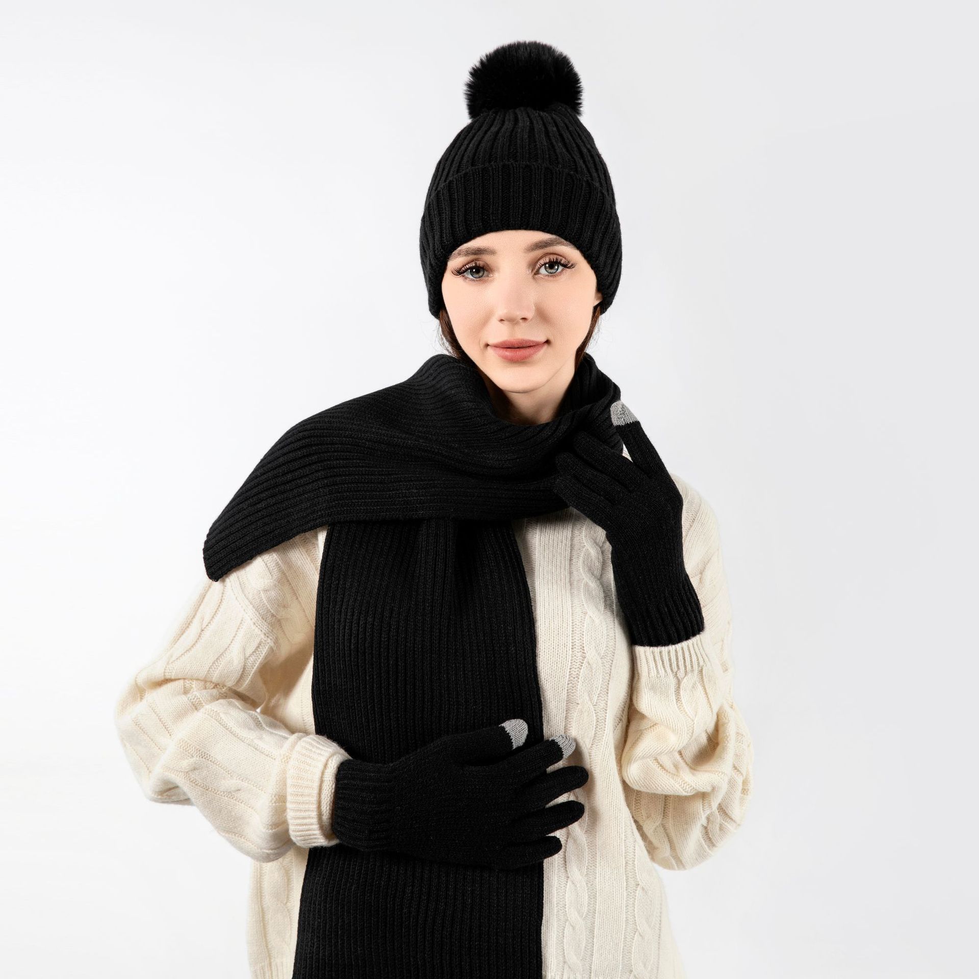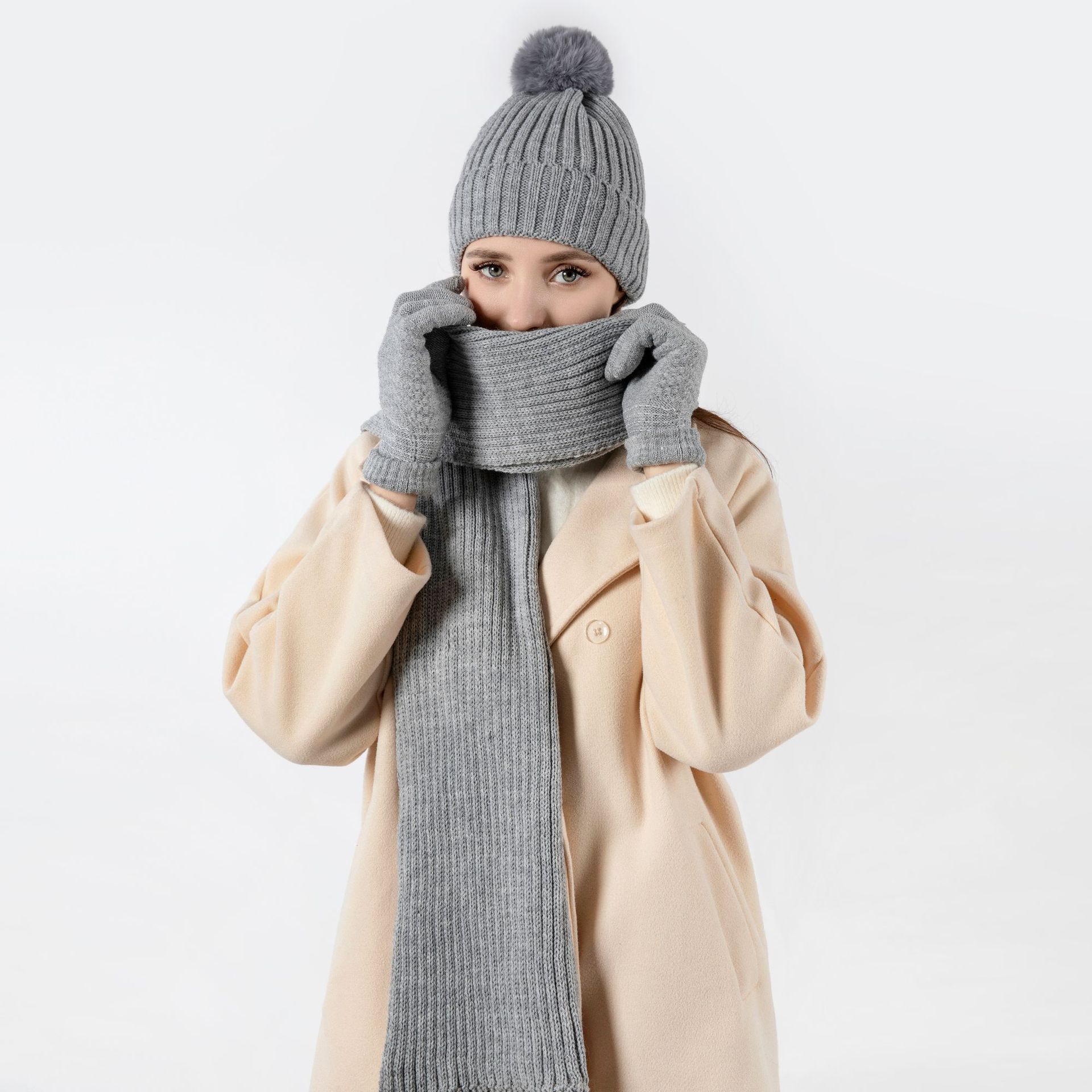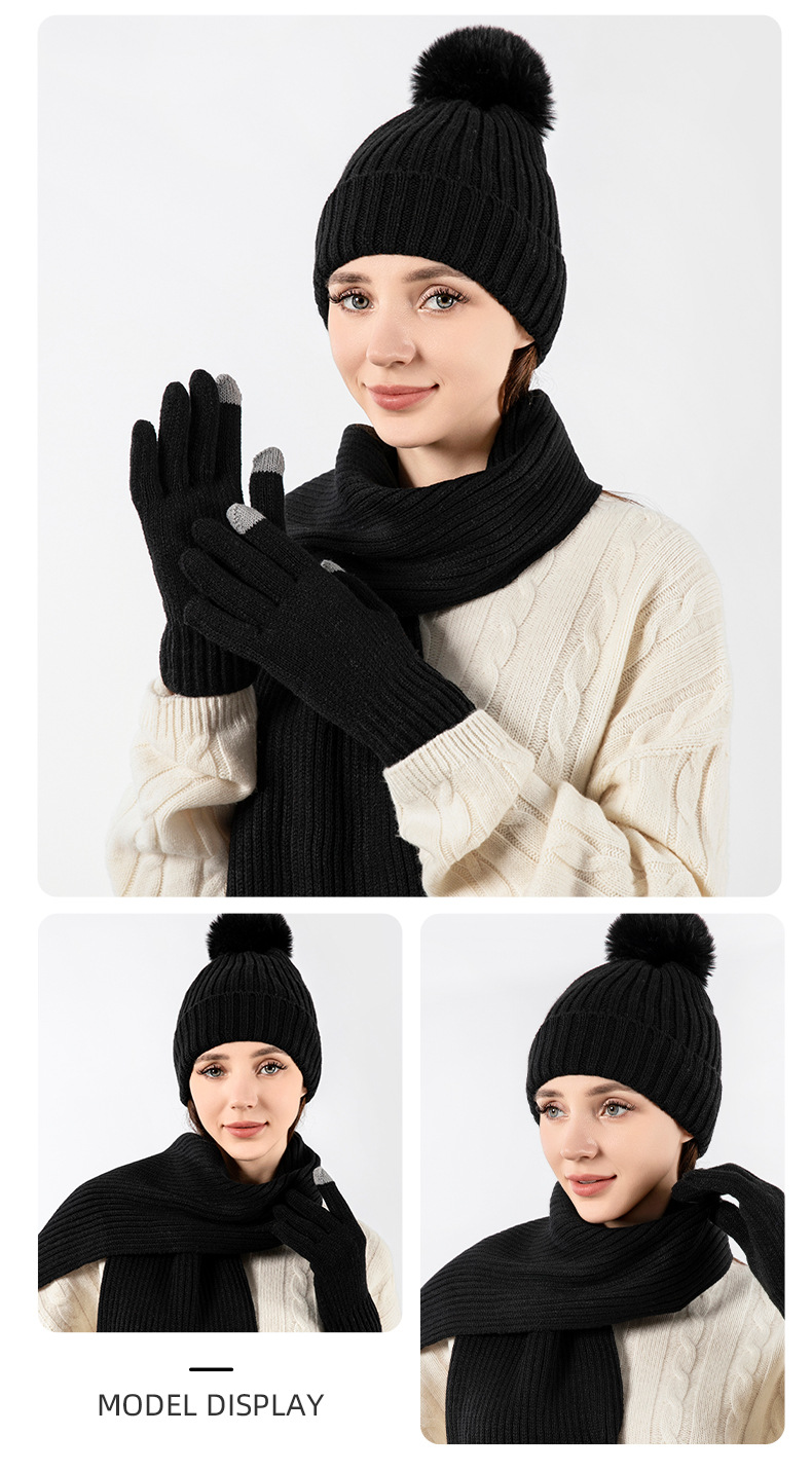 2024新款跨境冬季保暖针织毛线加绒加厚手套帽子围巾三件套批发