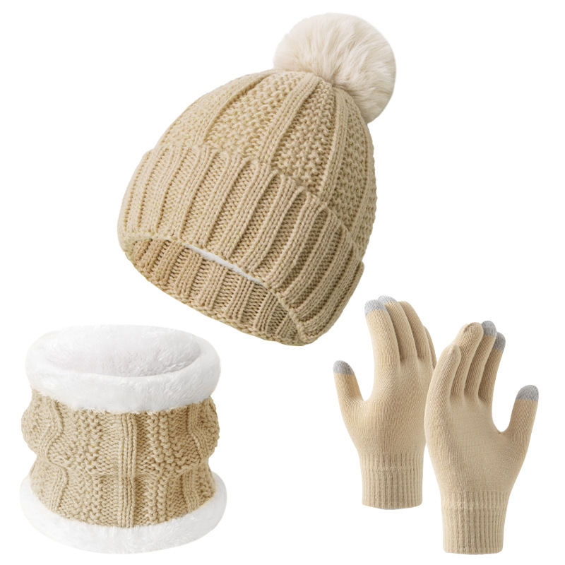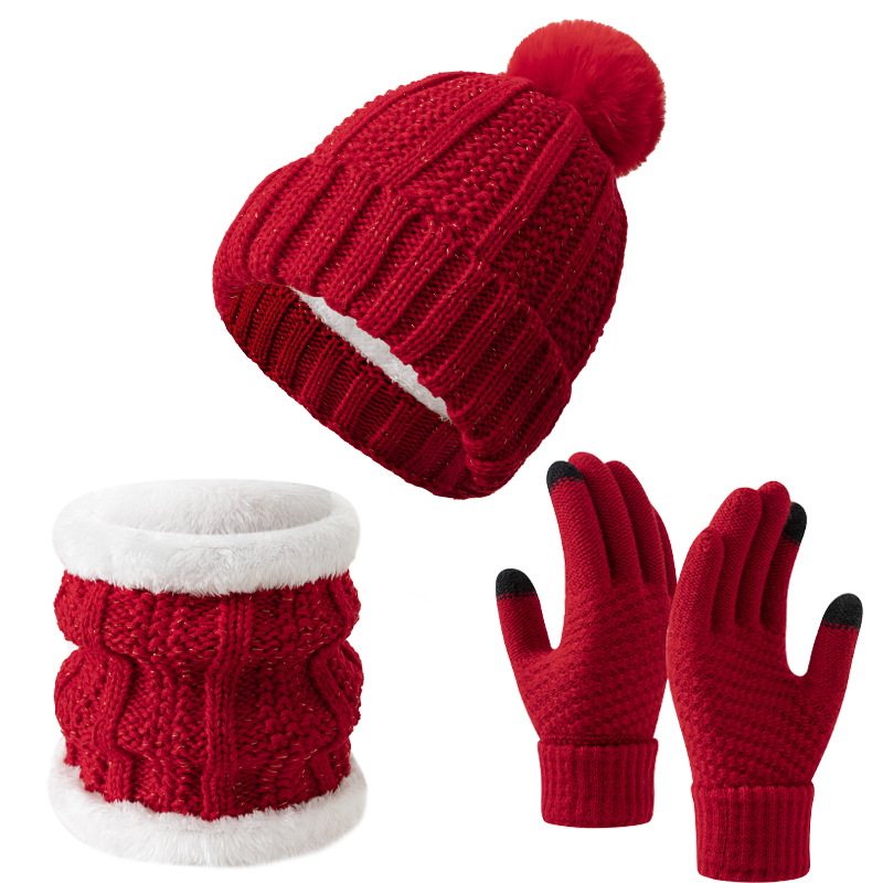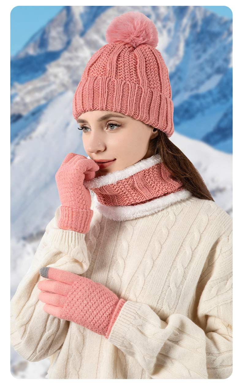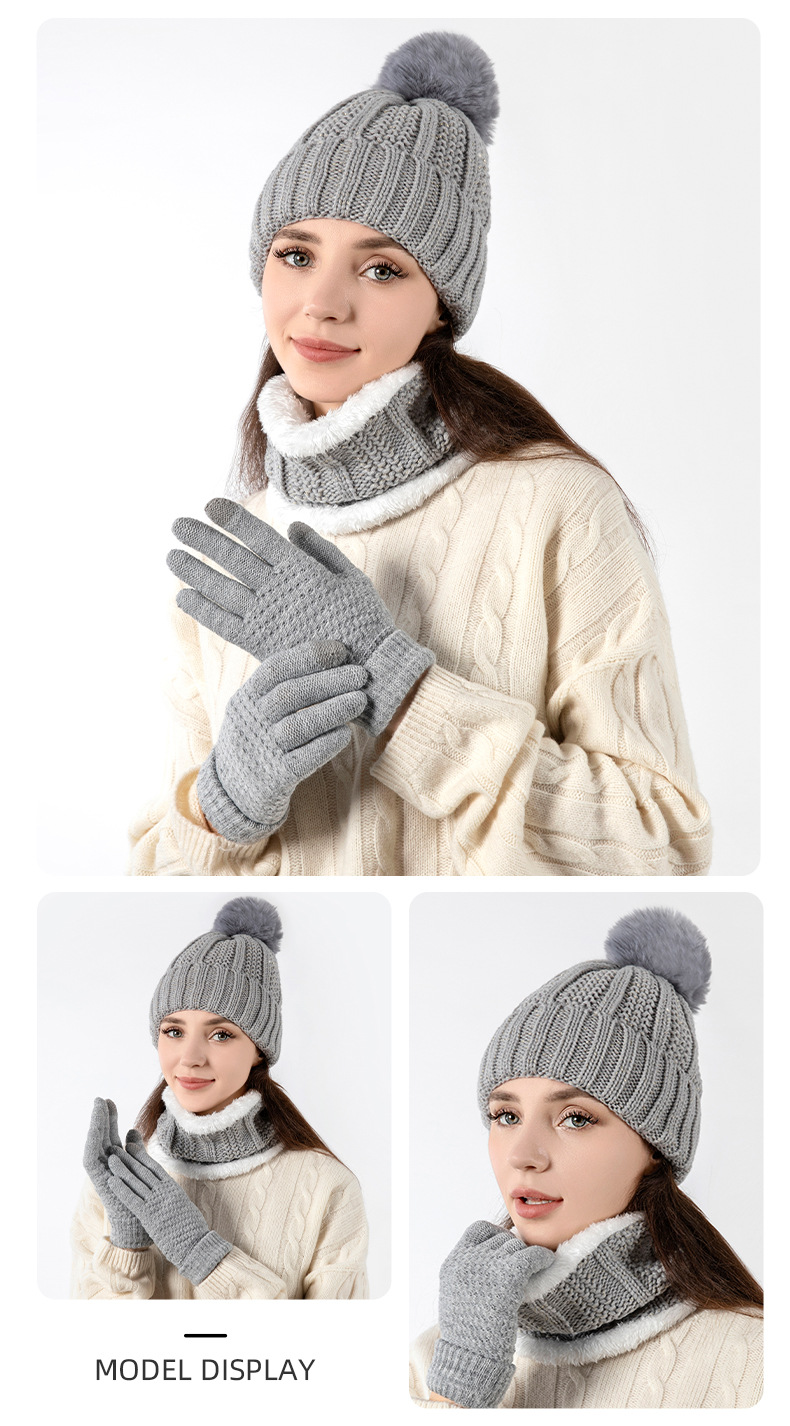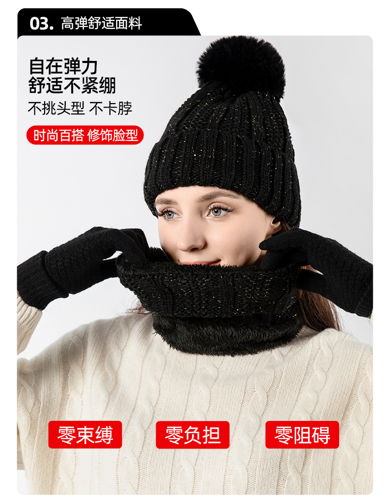 跨境爆款保暖帽子围脖围巾三件套加绒冬季触屏户外运动针织帽子