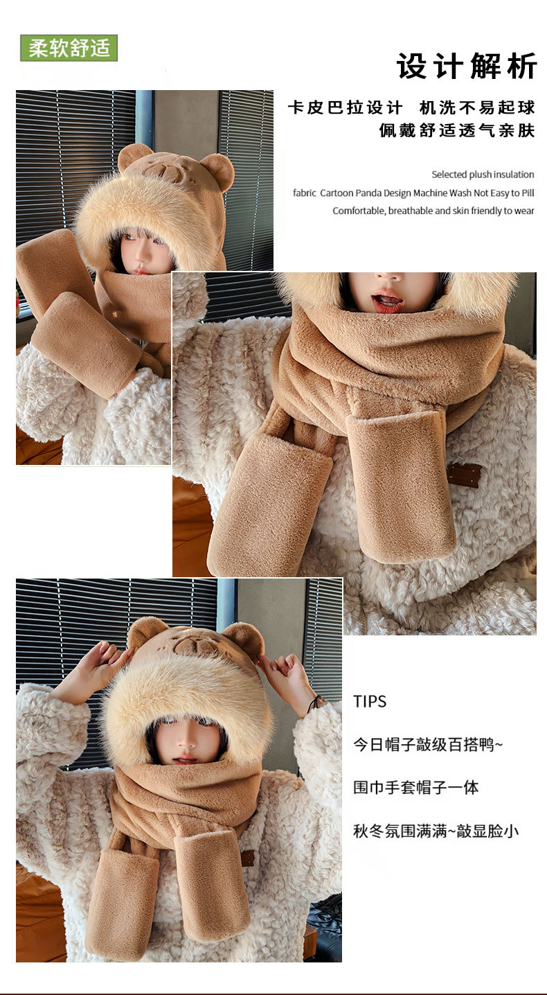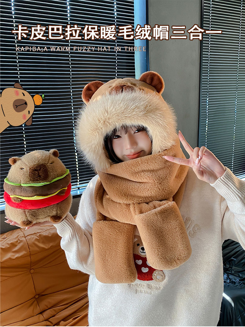 可爱卡皮巴拉帽子围巾三件套女秋冬卡通毛绒水豚保暖防风围脖一体