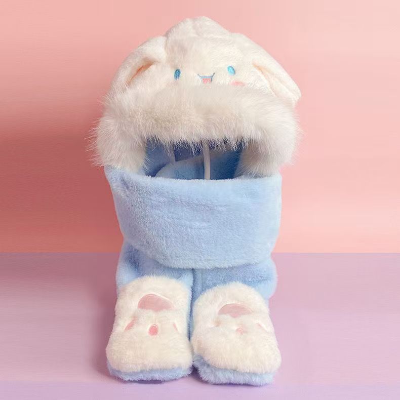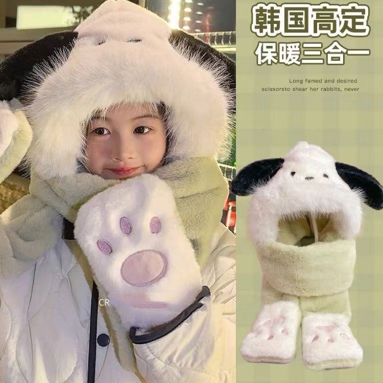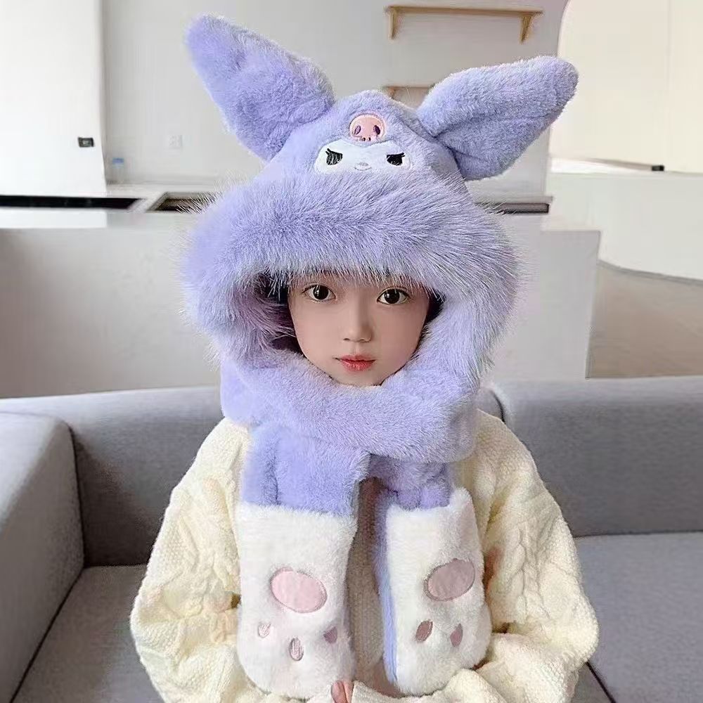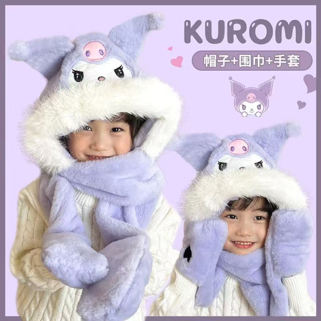 新款三丽鸥库洛米儿童冬季加厚三件套围巾气囊帽子一体耳朵会动手