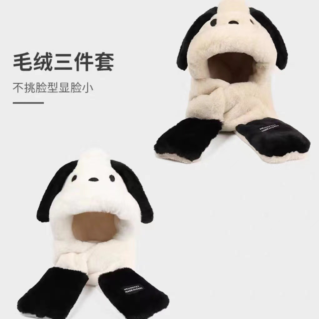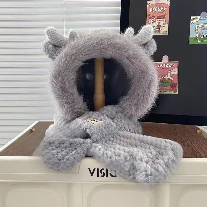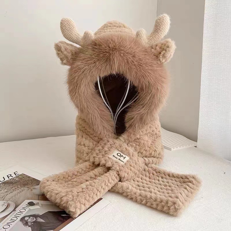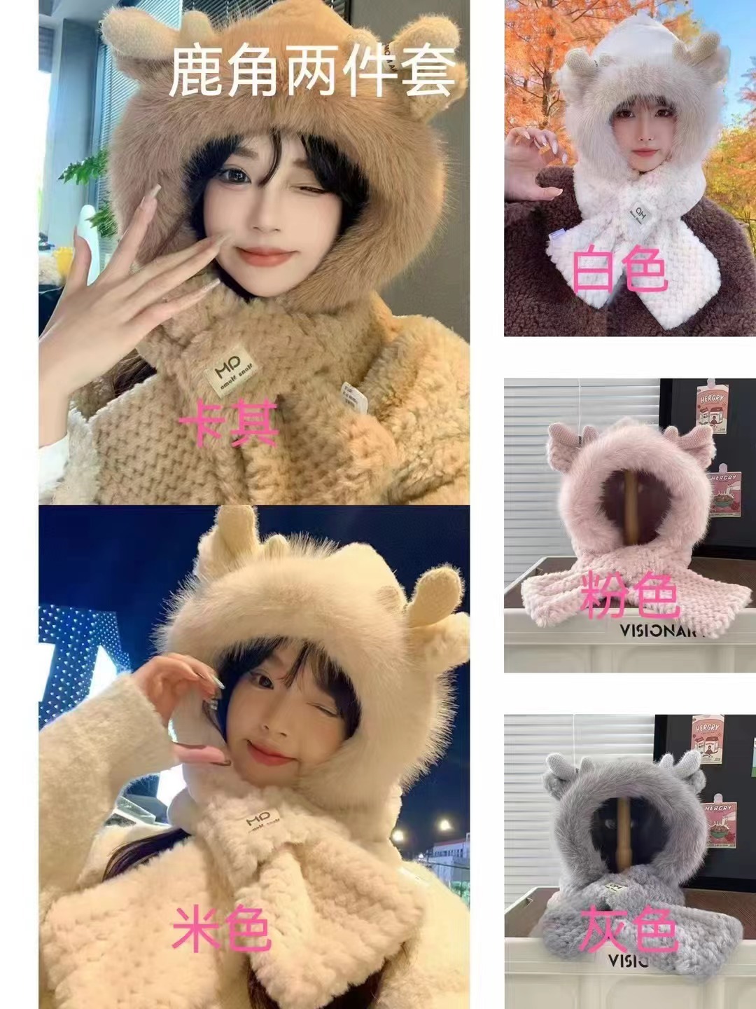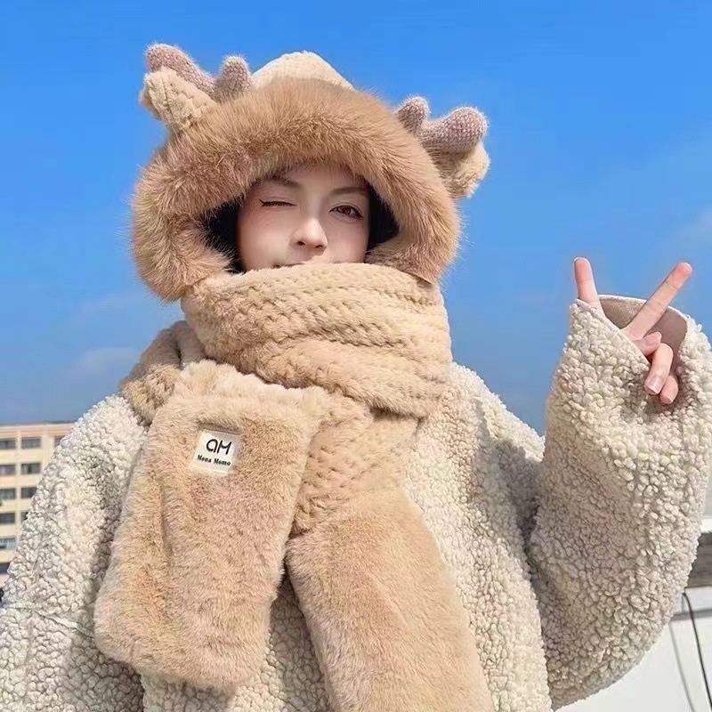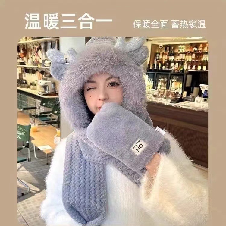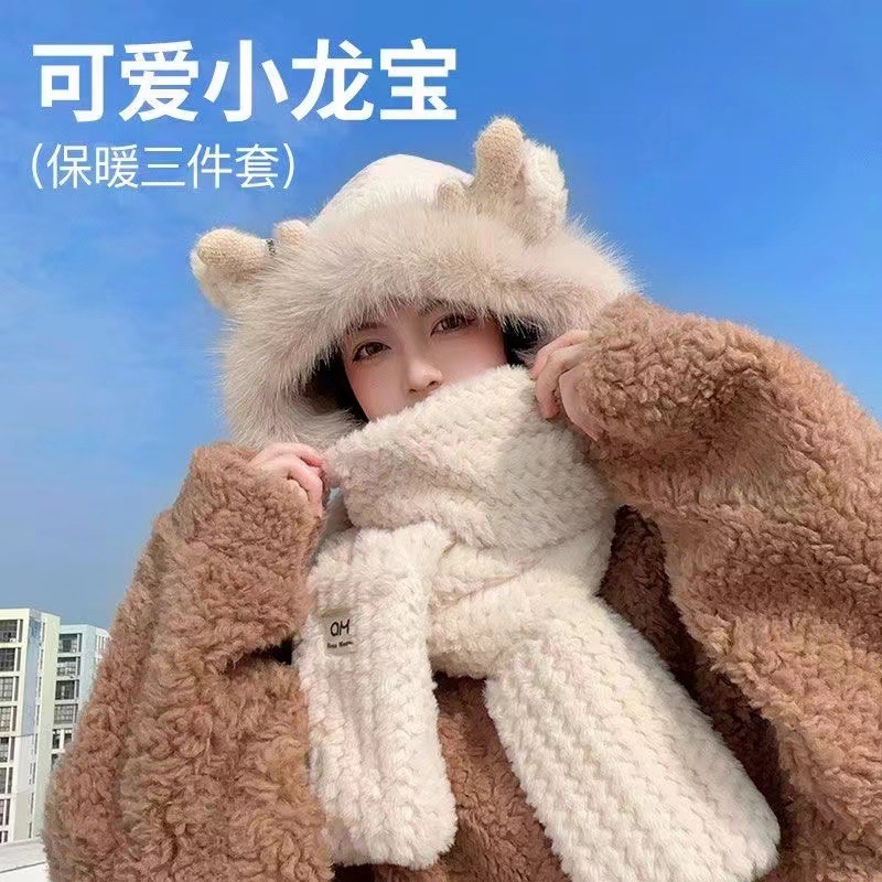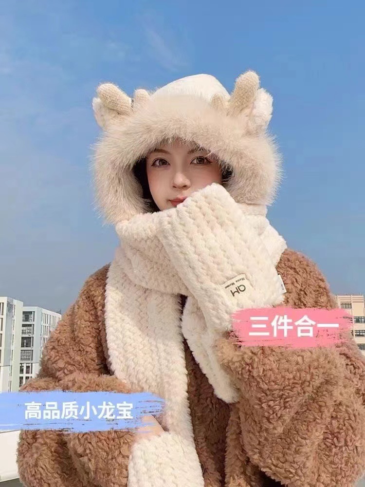 龙宝女鹿角三件套帽子冬手套围巾一体可爱保暖加厚帕恰狗毛绒成人