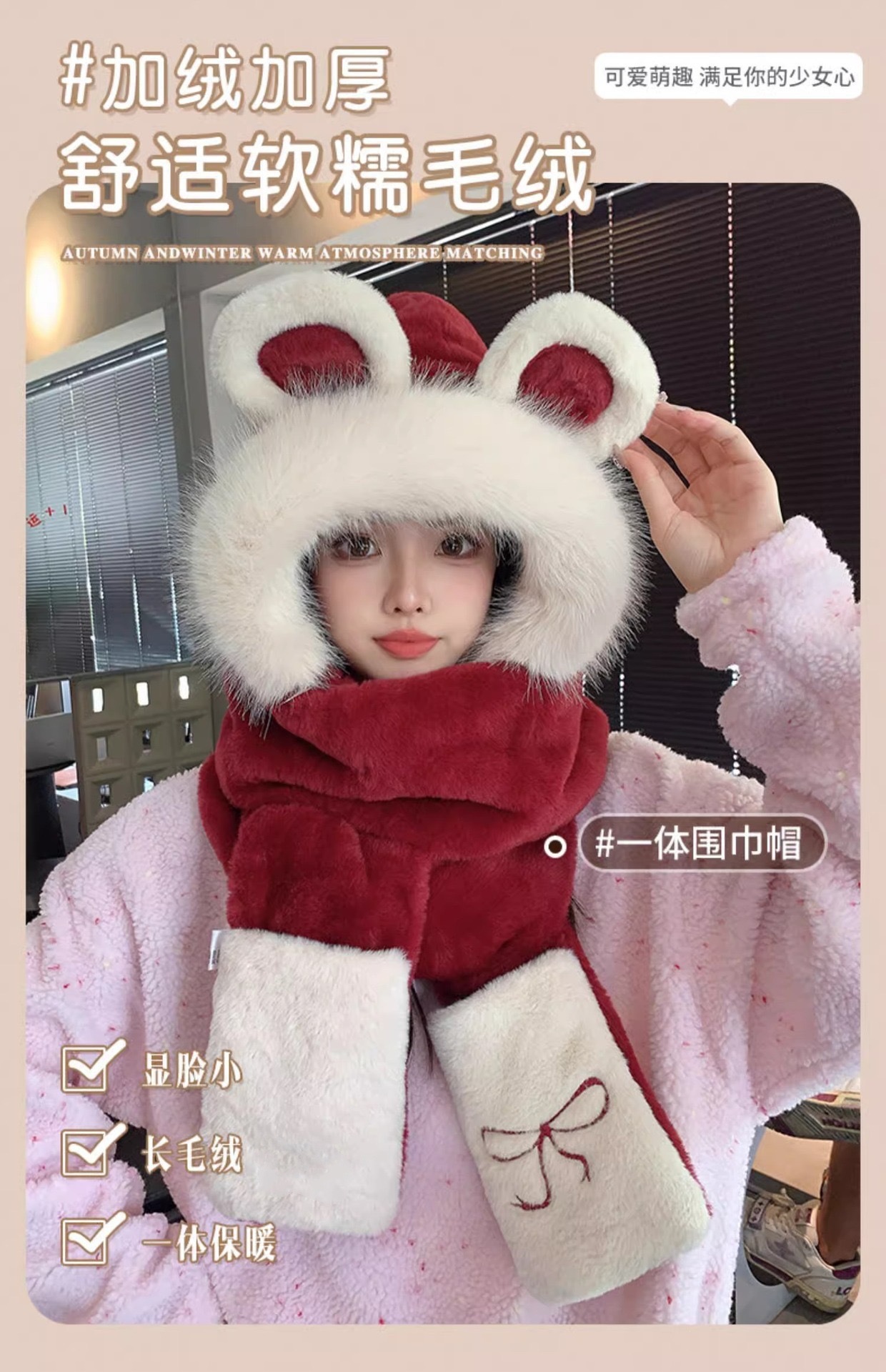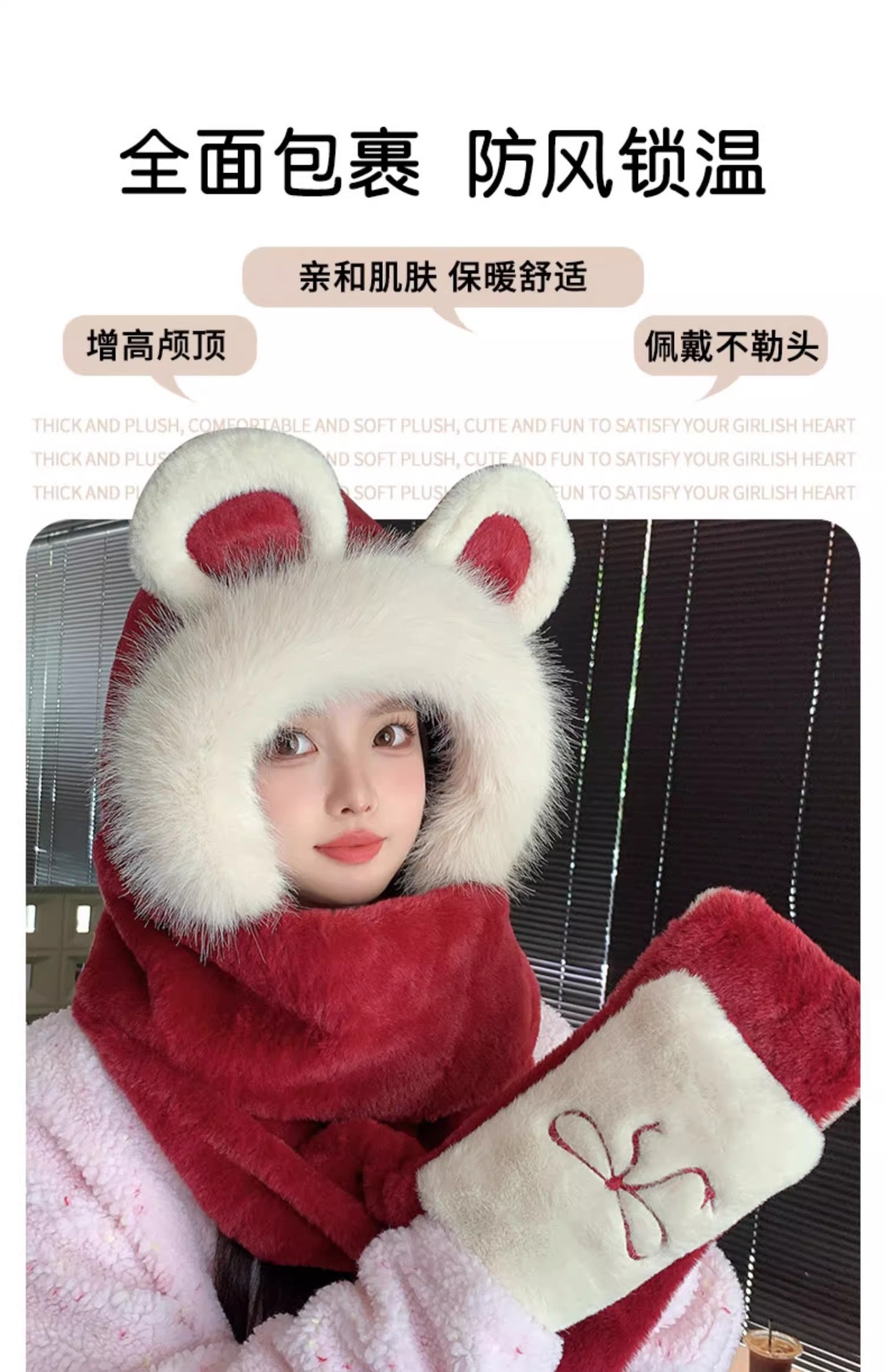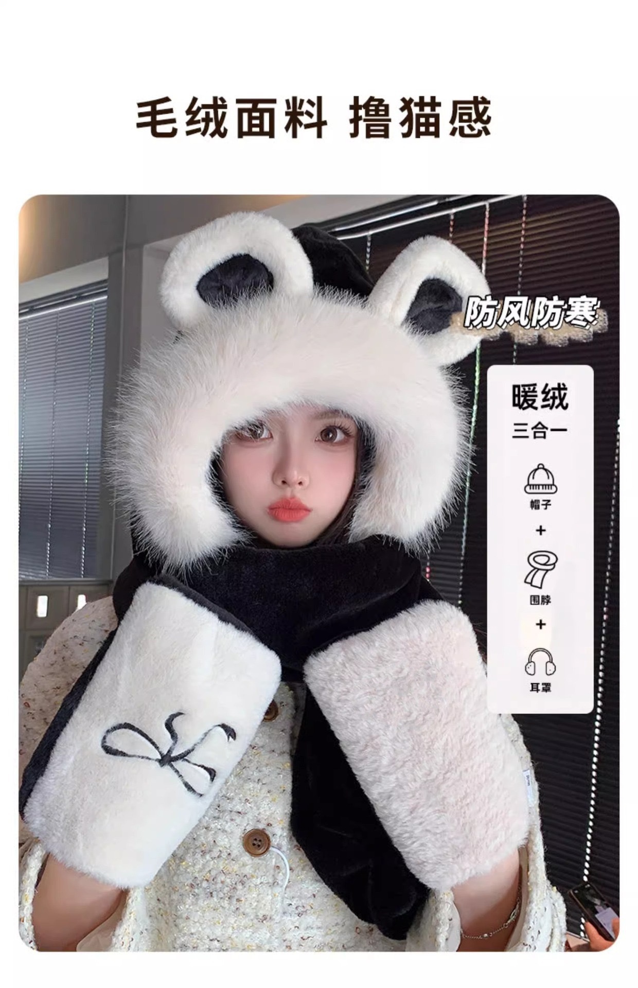 刺绣蝴蝶结小熊毛绒围巾帽子手套三件套女韩版可爱加厚保暖帽子