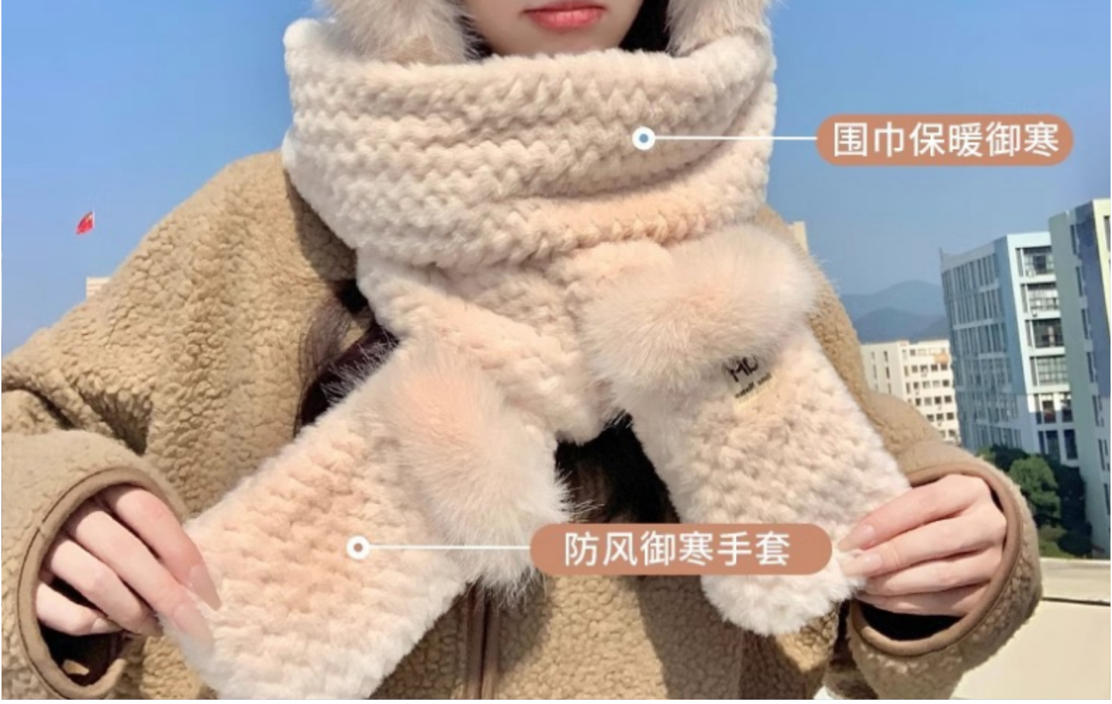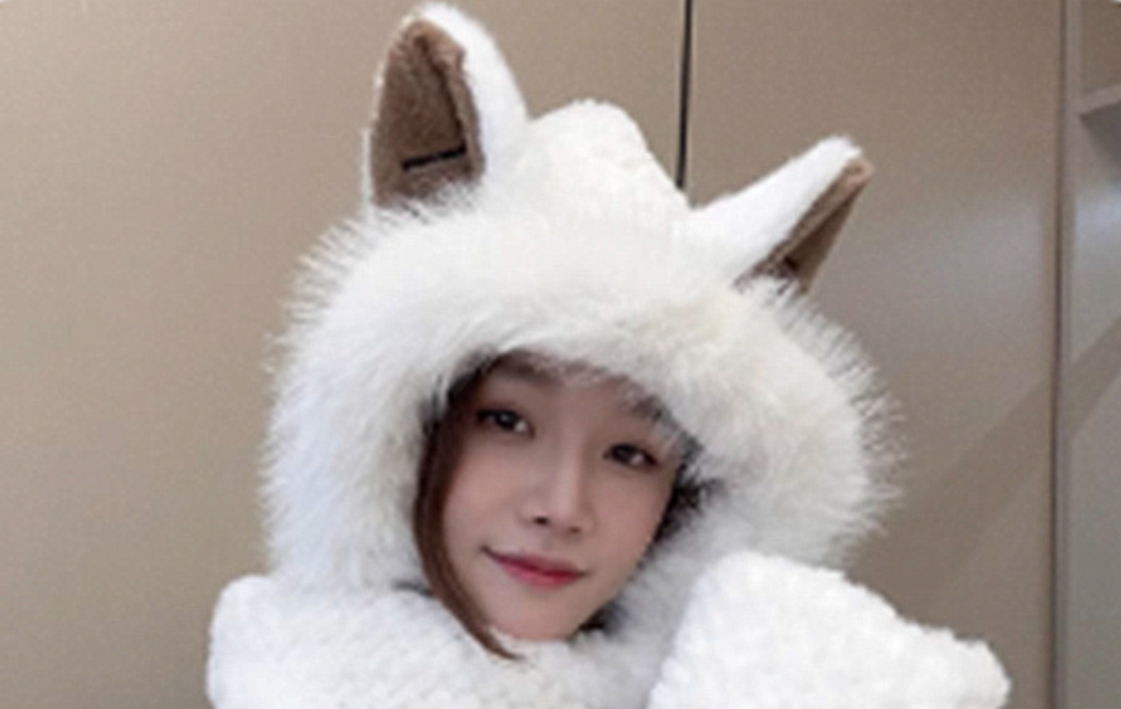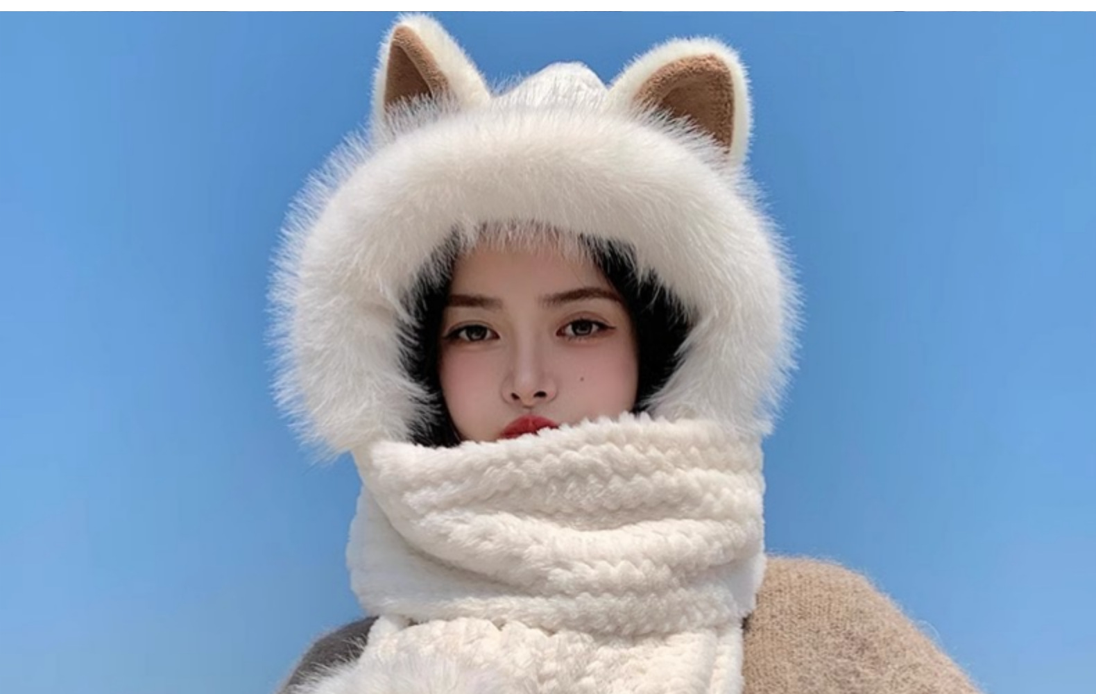 帽子女冬季围巾手套一体帽狐狸耳朵防寒保暖毛绒帽可爱百搭套头帽