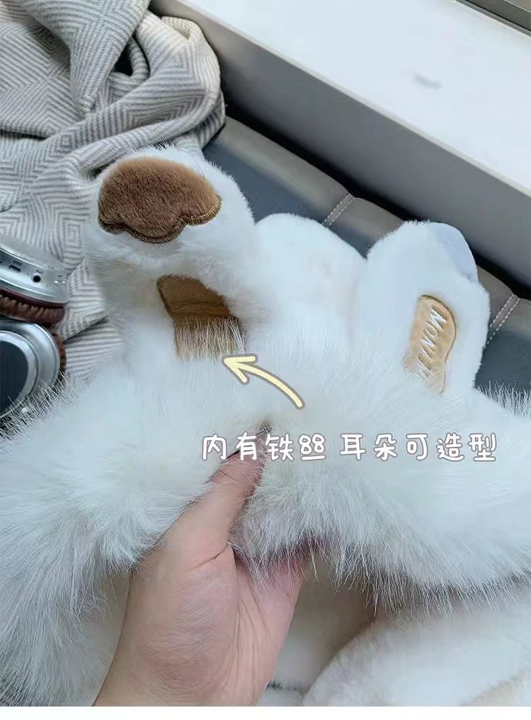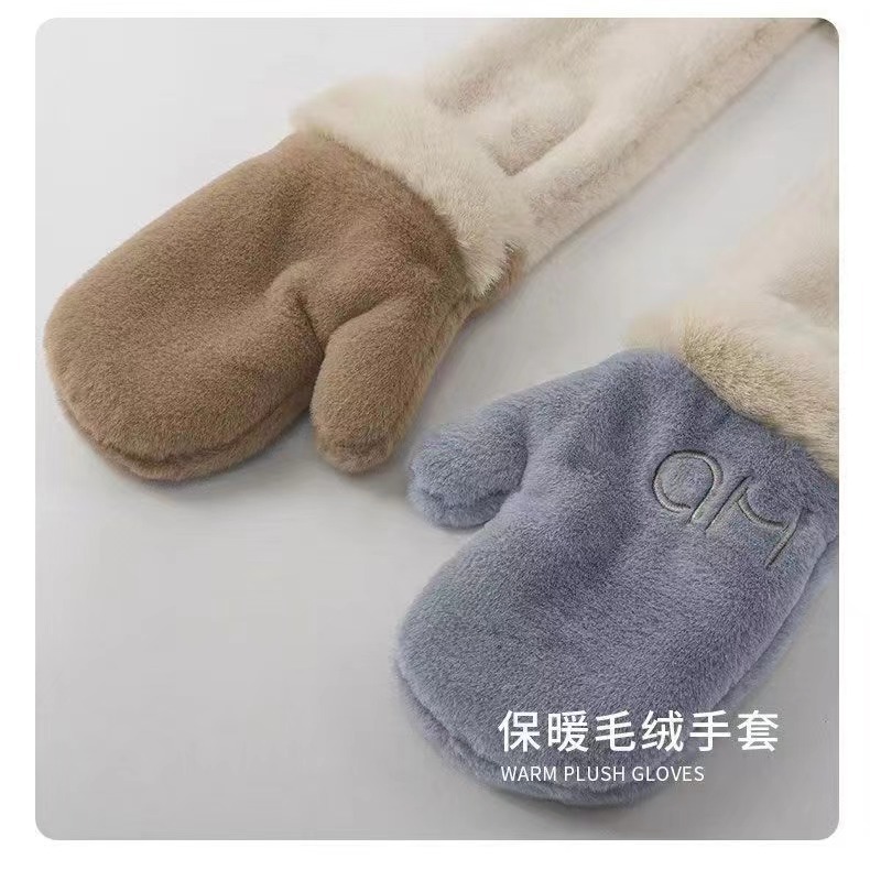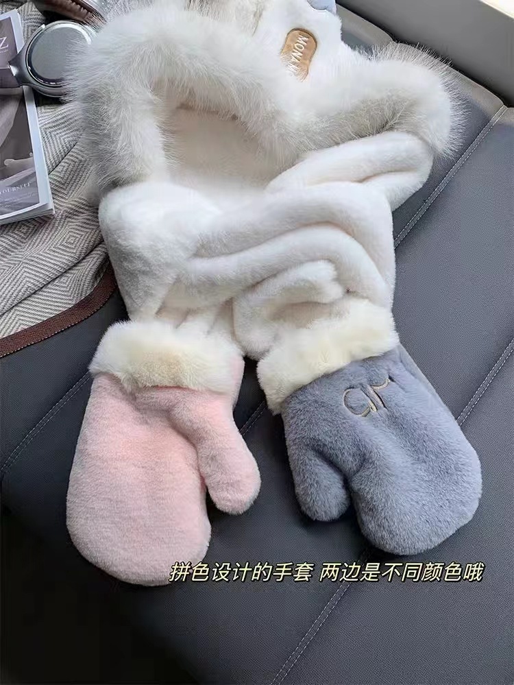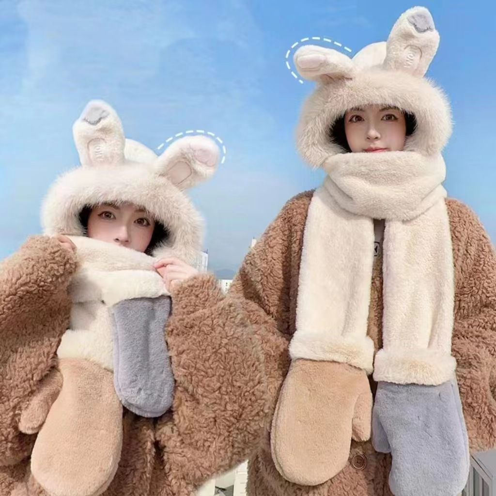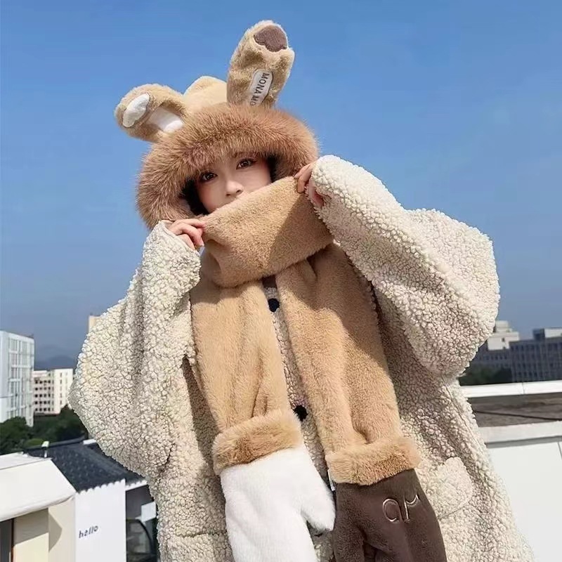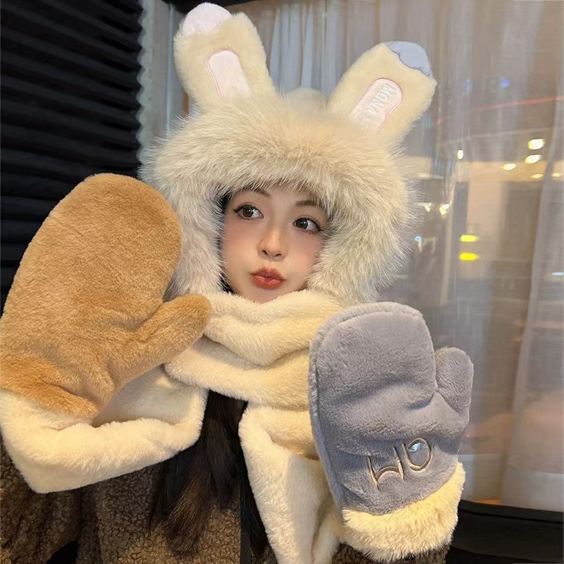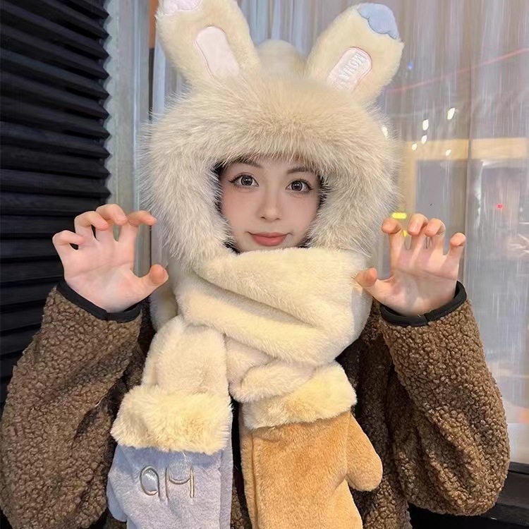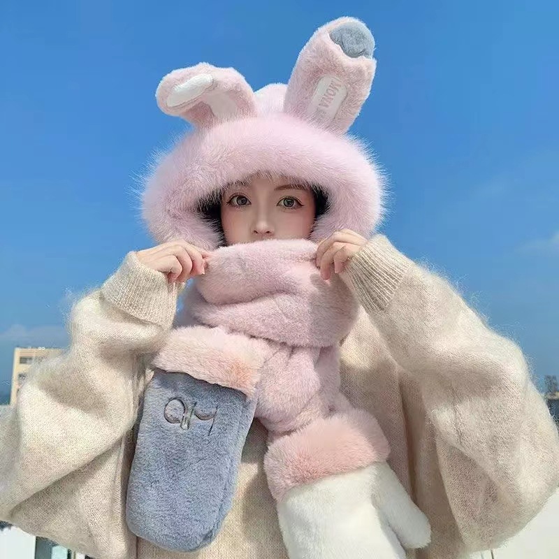 秋冬季新款兔子耳朵女围巾帽子手套一体三件套加绒加厚保暖毛绒帽