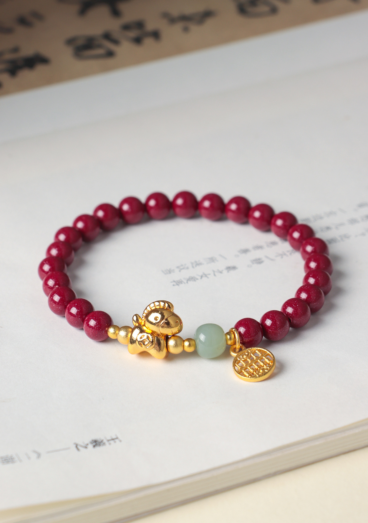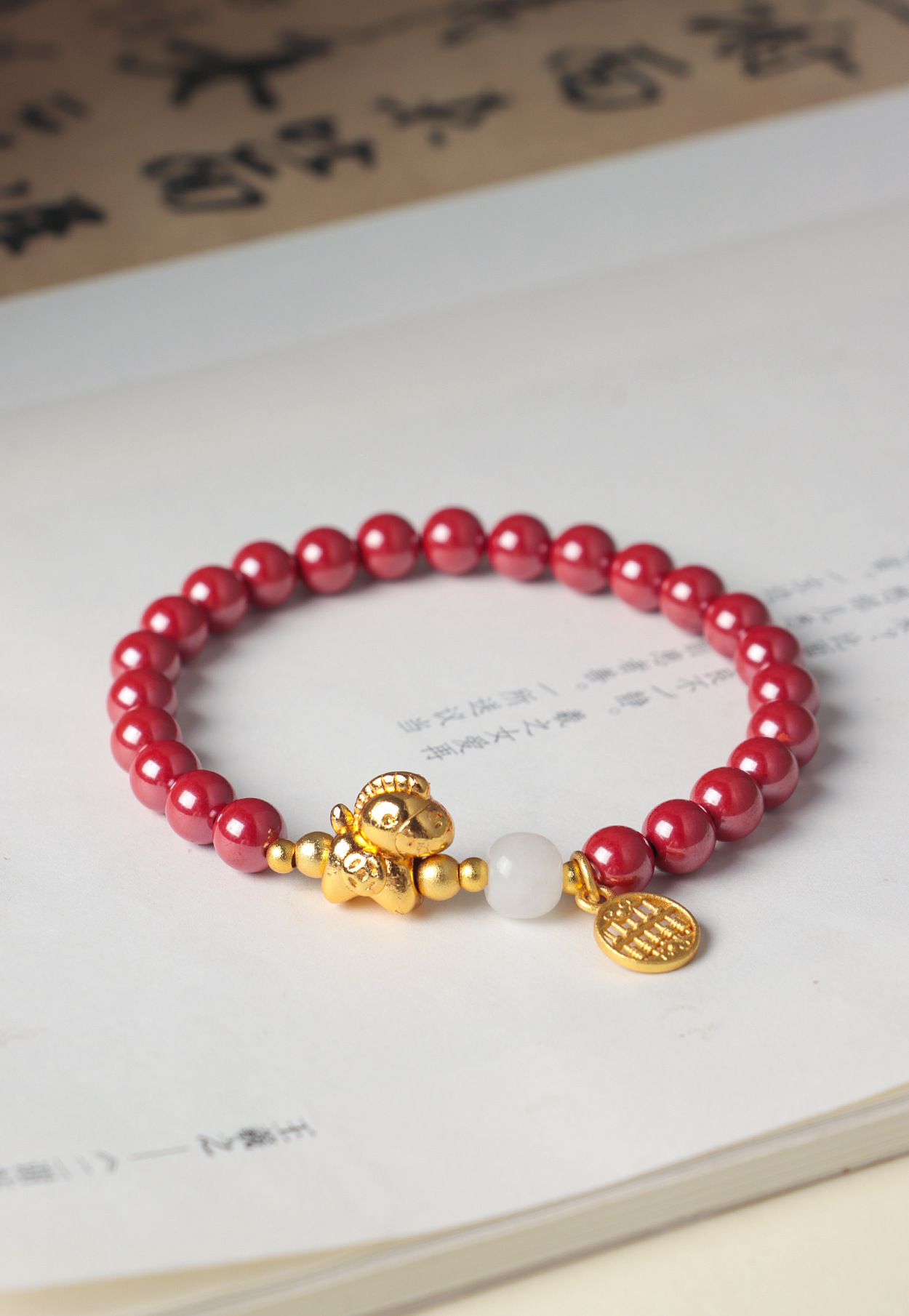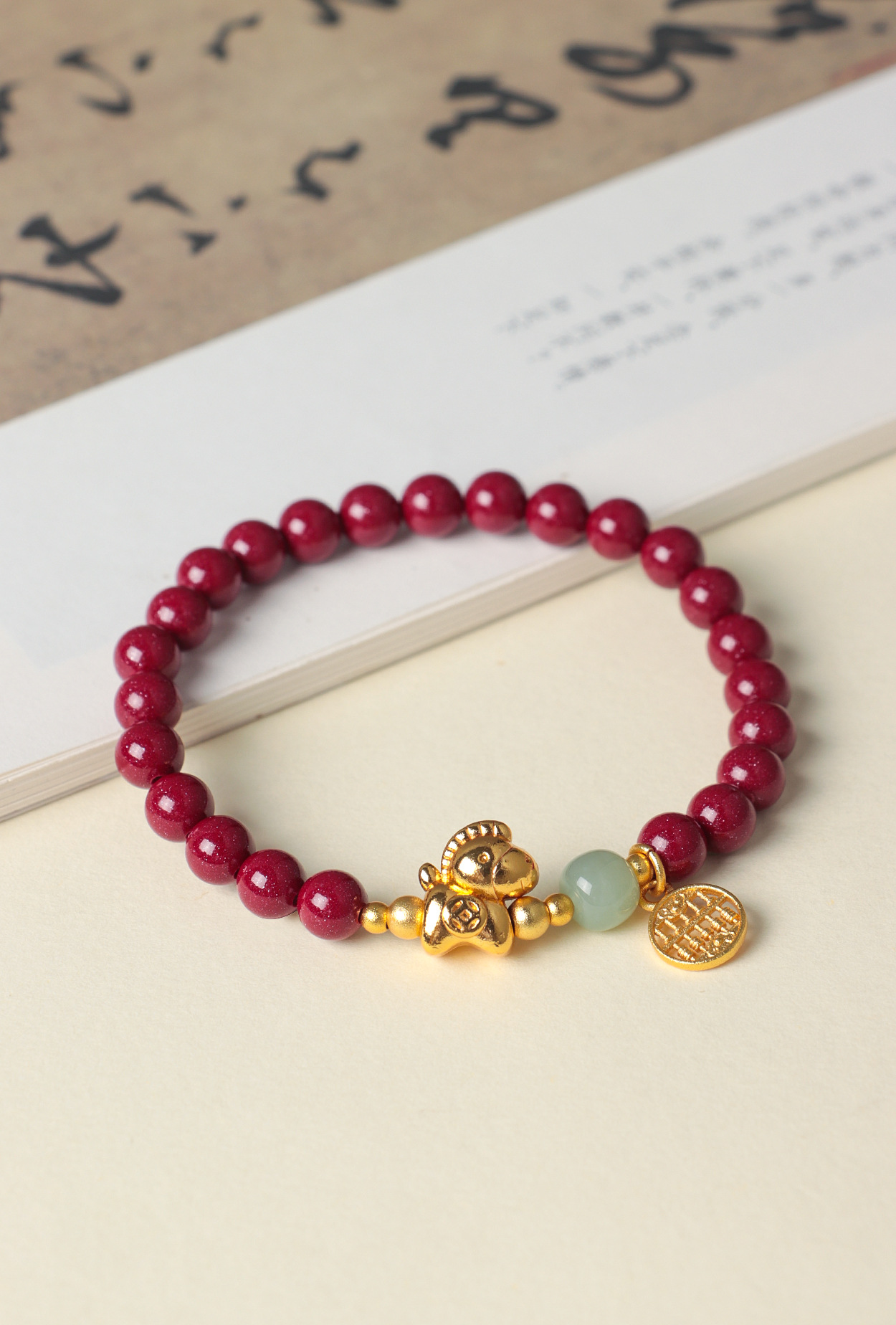 天然朱砂和田玉串珠手链女时尚通勤多财多福金马紫金朱砂手串批发