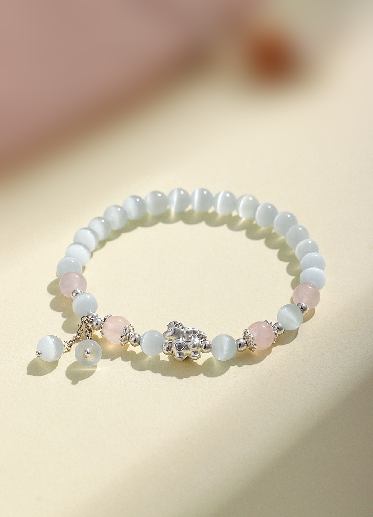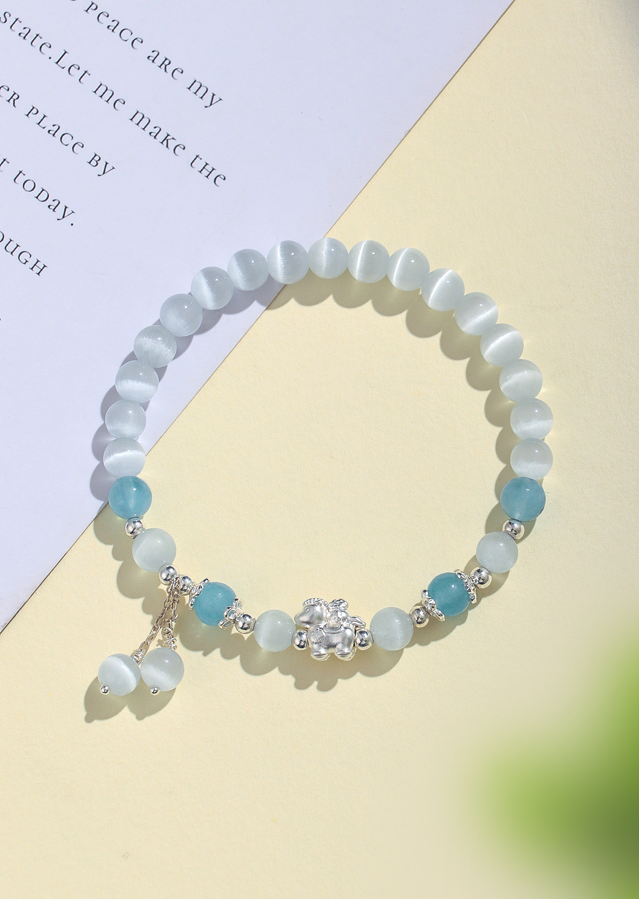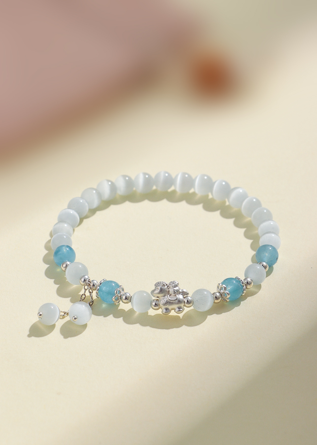 999银天马天然猫眼石粉水晶手链女清新甜美海蓝宝灰月光手串批发