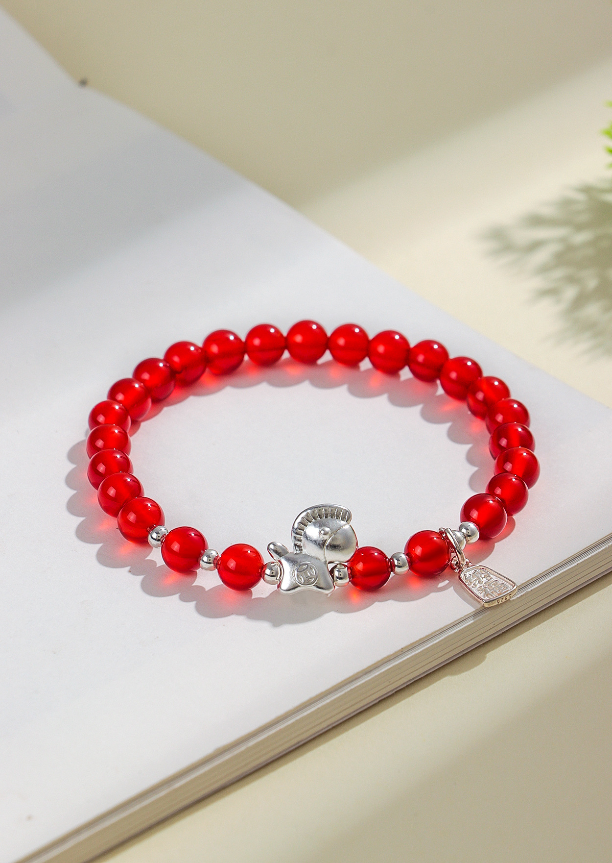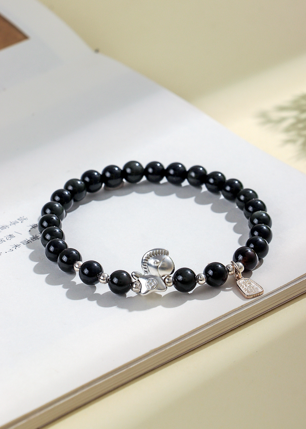 马年生肖马999足银天然粉水晶玛瑙串珠手链女清新甜美黑曜石手串