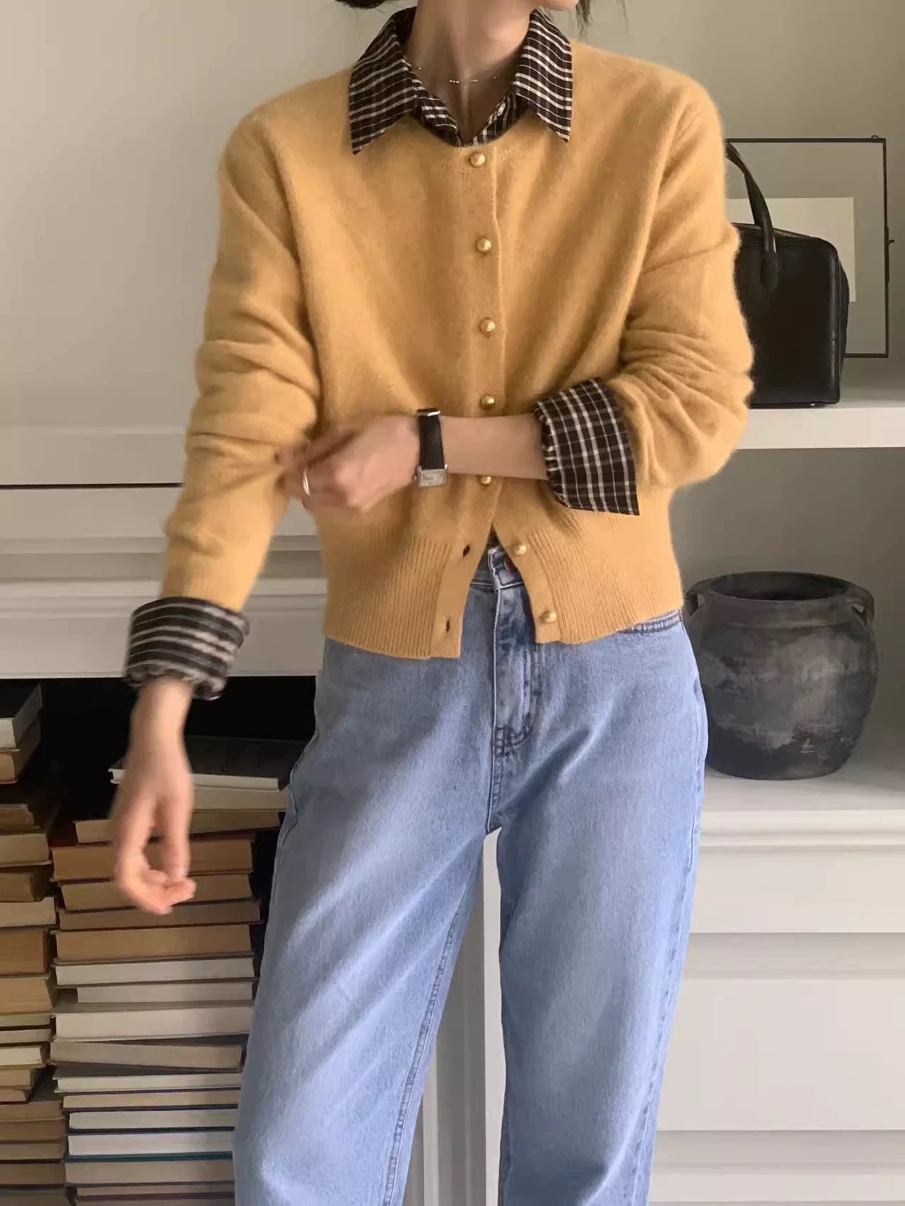 时尚圆领金扣100纯羊毛针织开衫女上衣春秋韩版短款毛衣羊毛外套