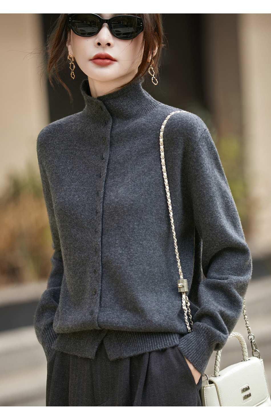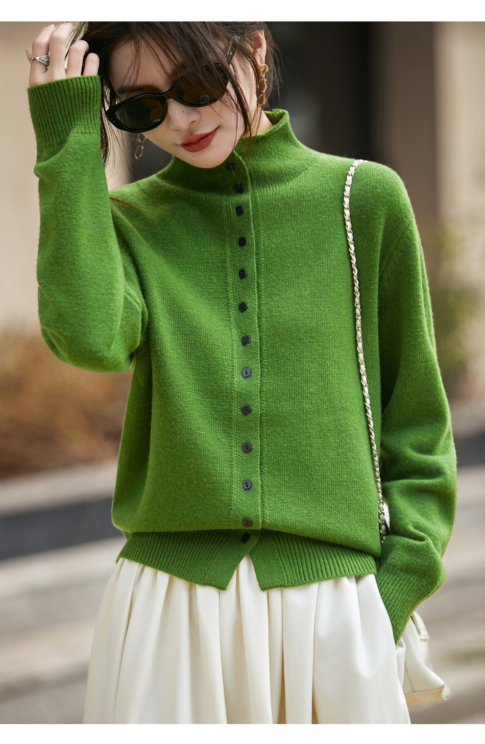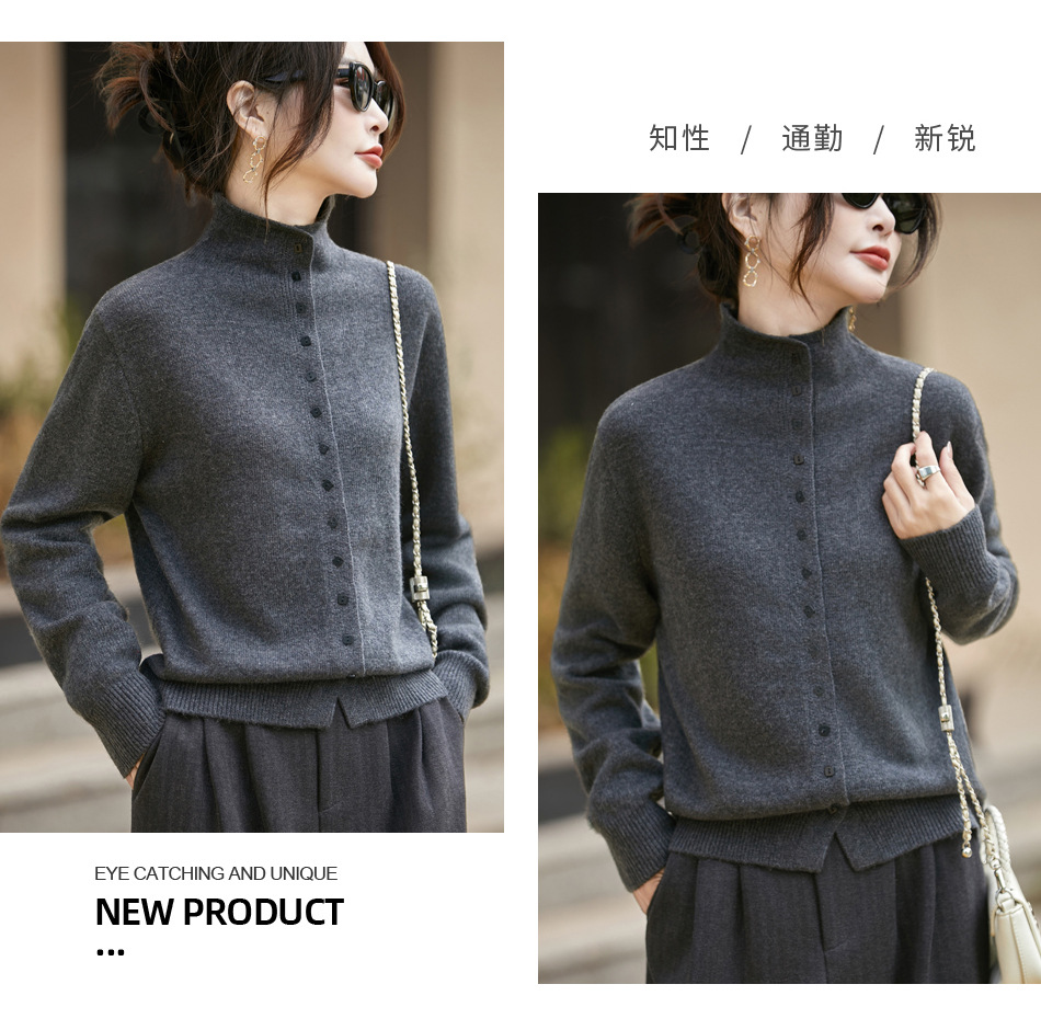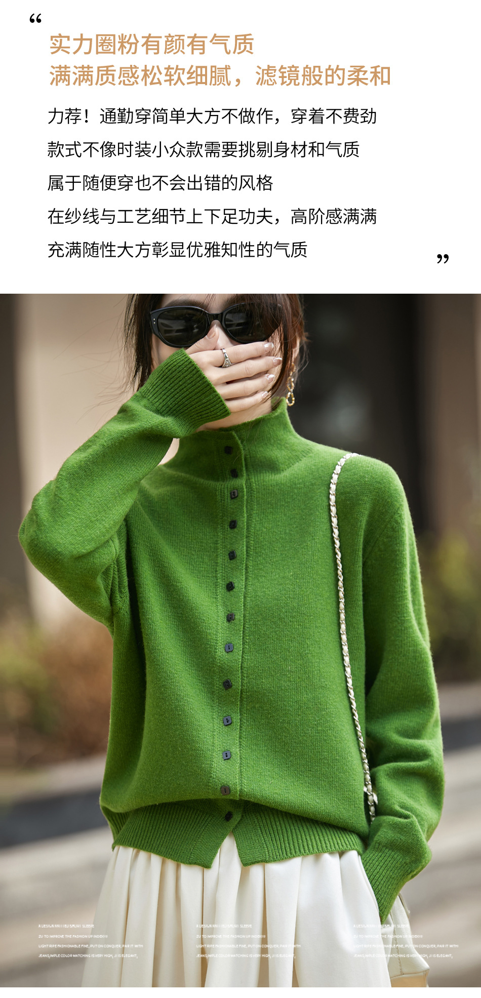 羊毛混纺2025秋冬新款温柔风高领单排扣纯色针织开衫女上衣现货
