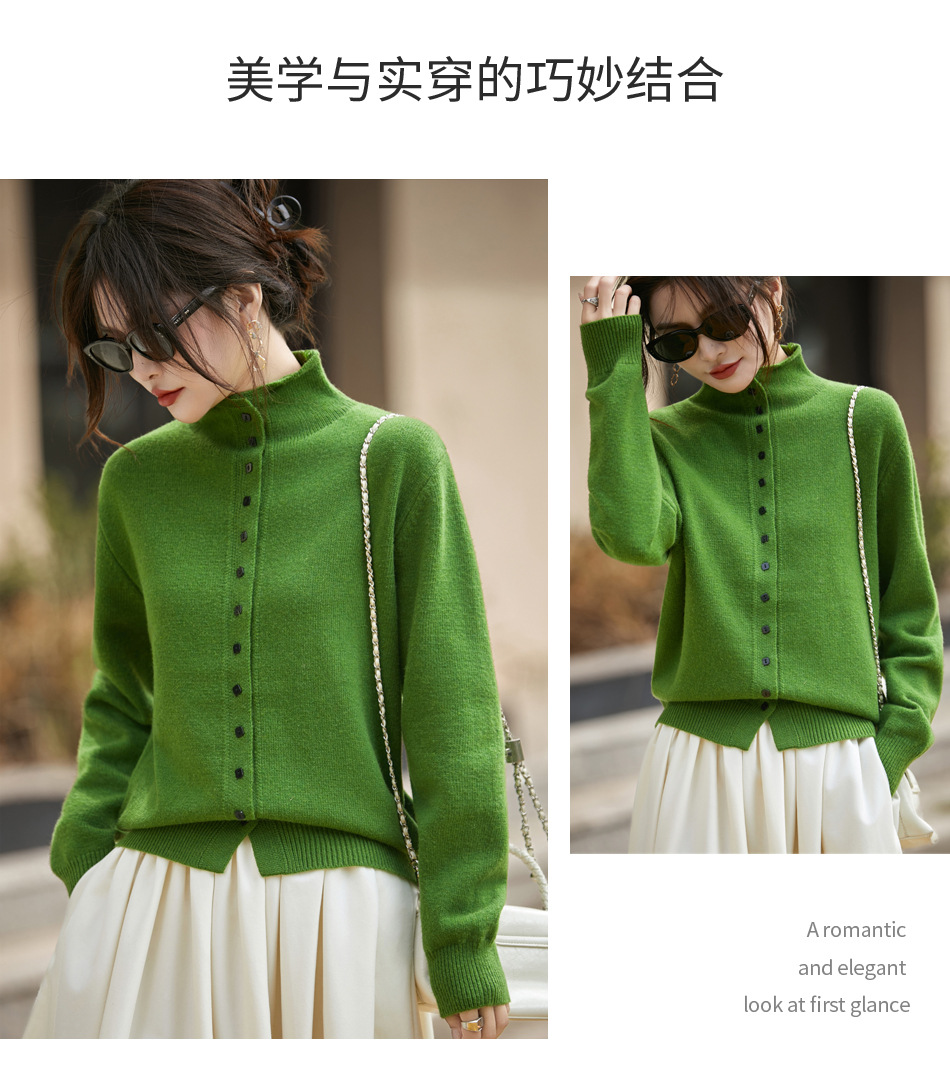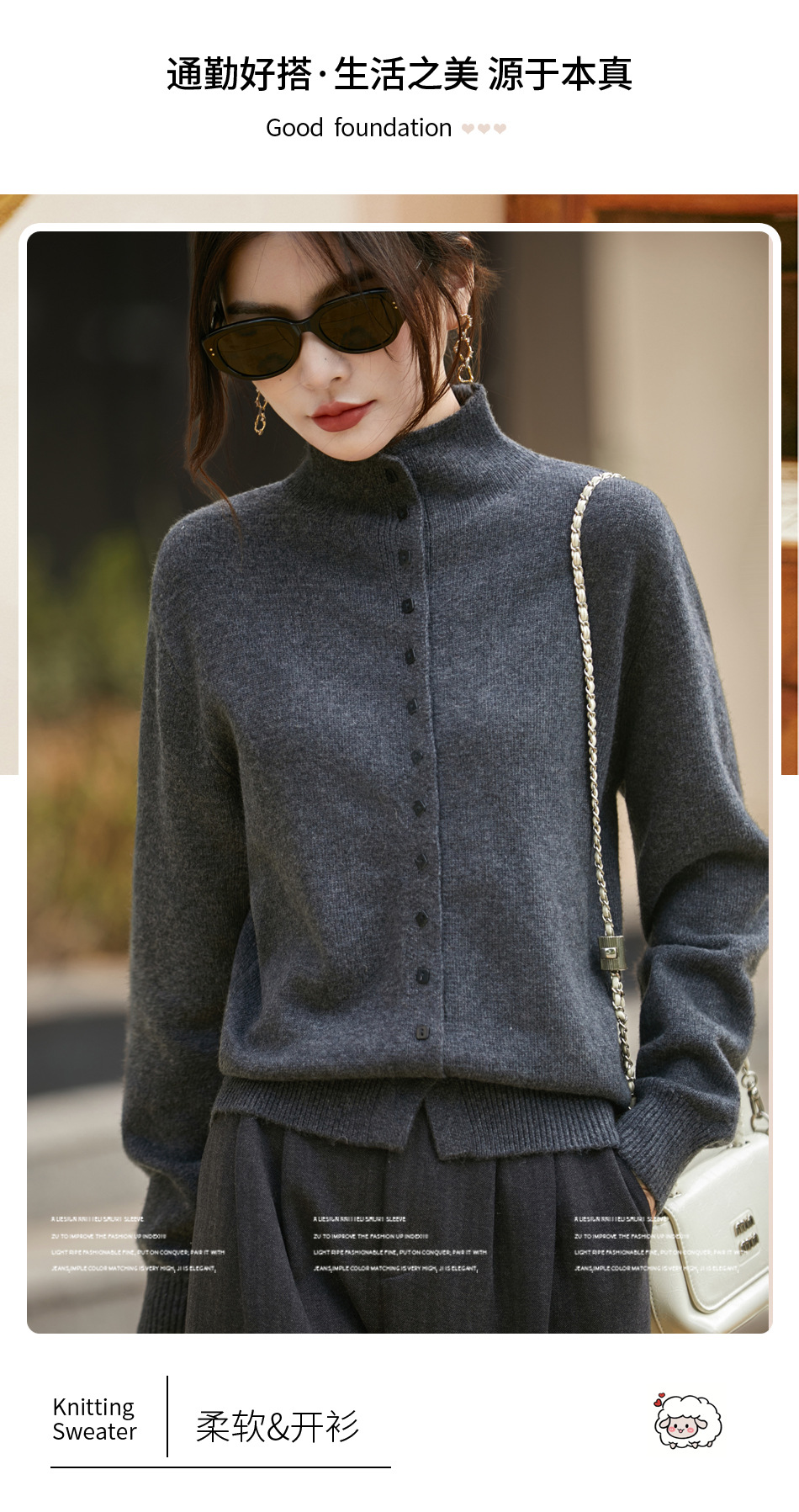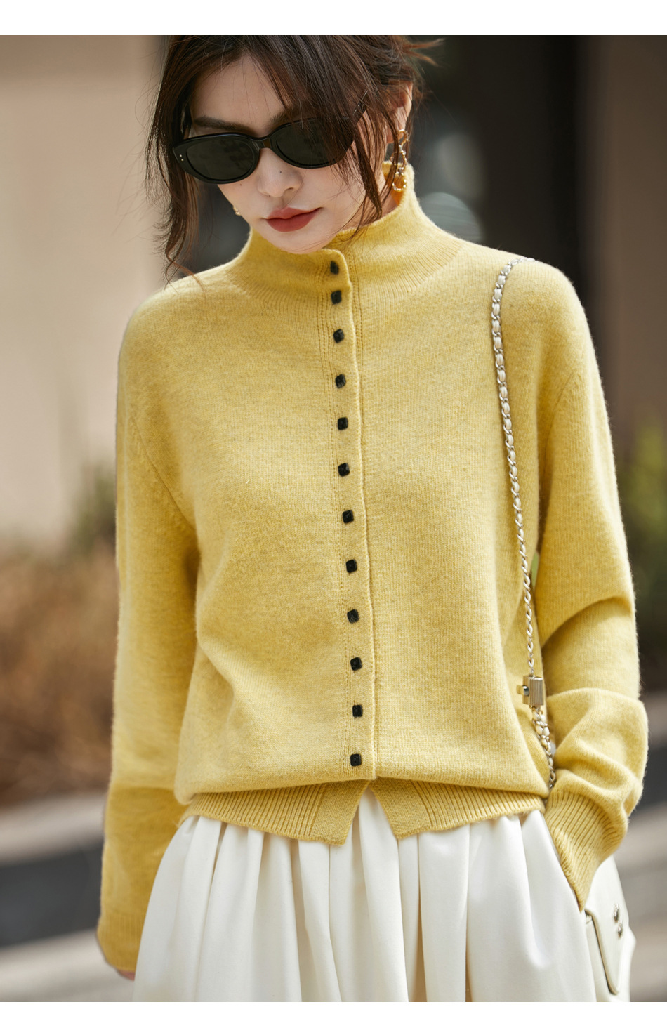 羊毛混纺2025秋冬新款温柔风高领单排扣纯色针织开衫女上衣现货
