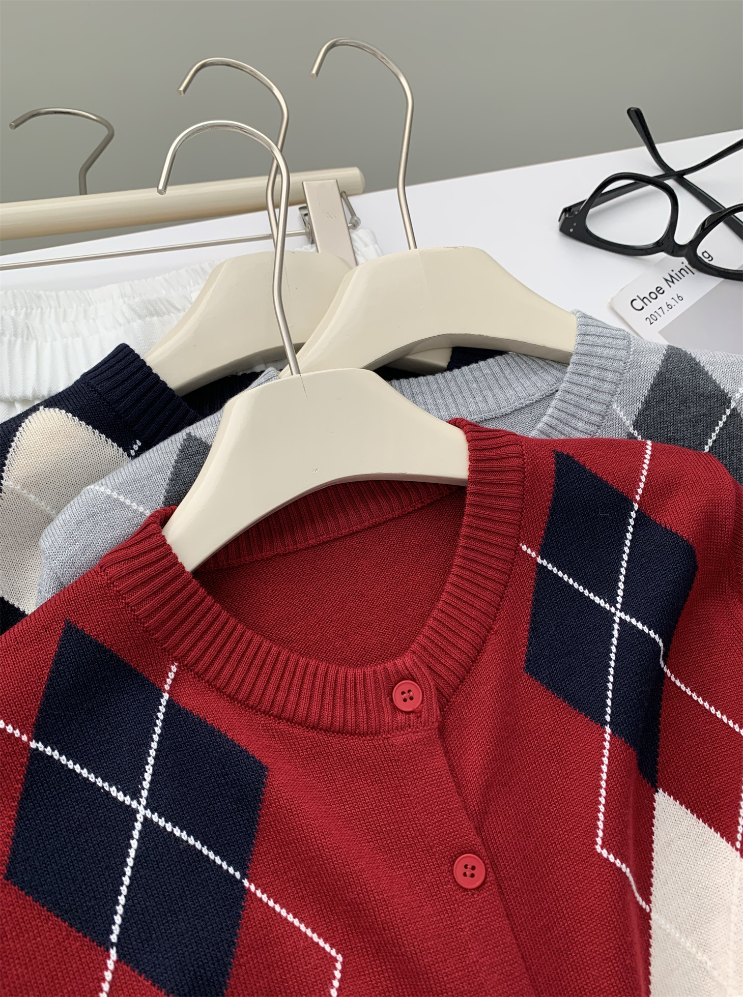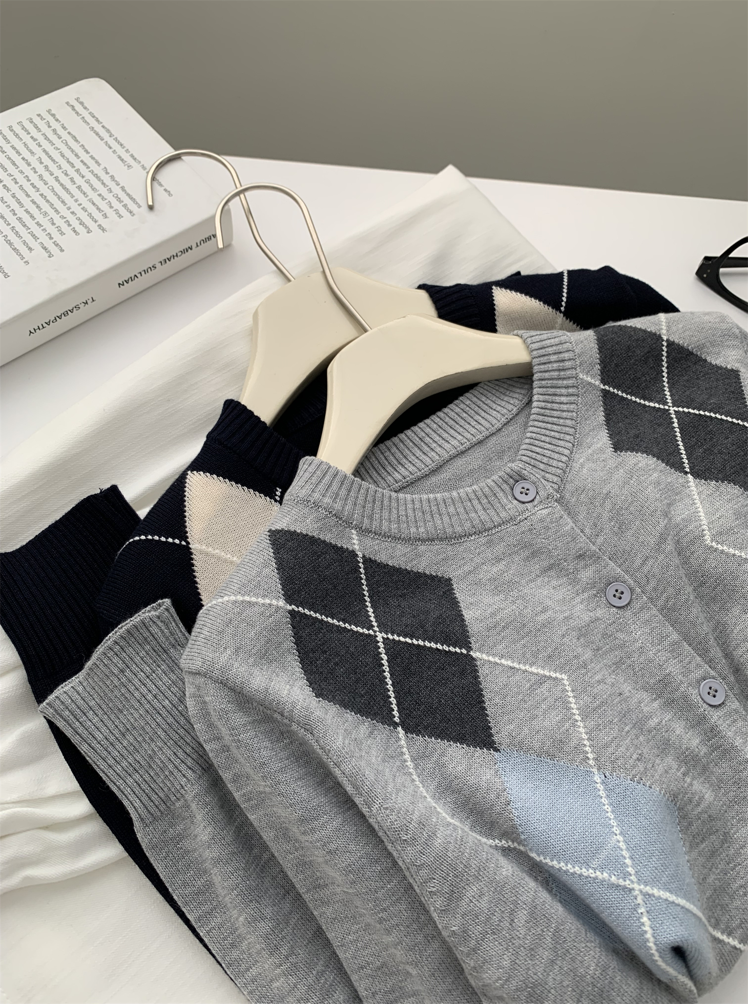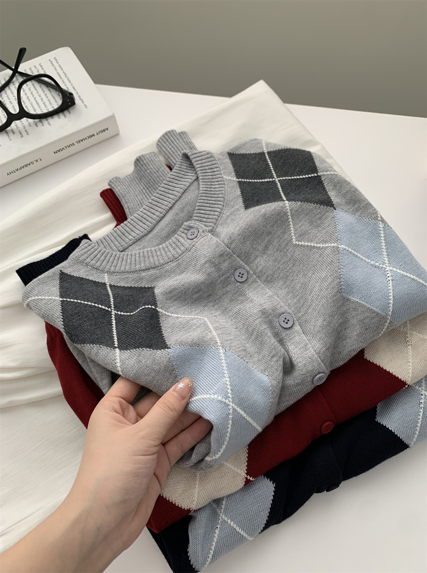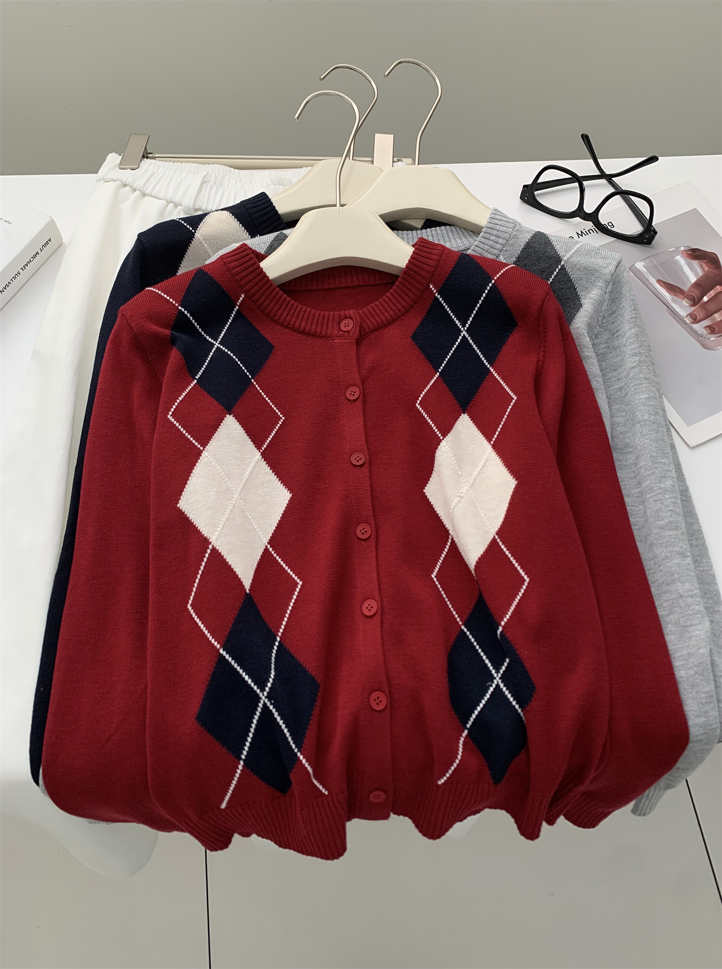 格蕾系复古撞色菱格针织开衫女细腻软糯羊毛圆领薄毛衣外套秋冬款