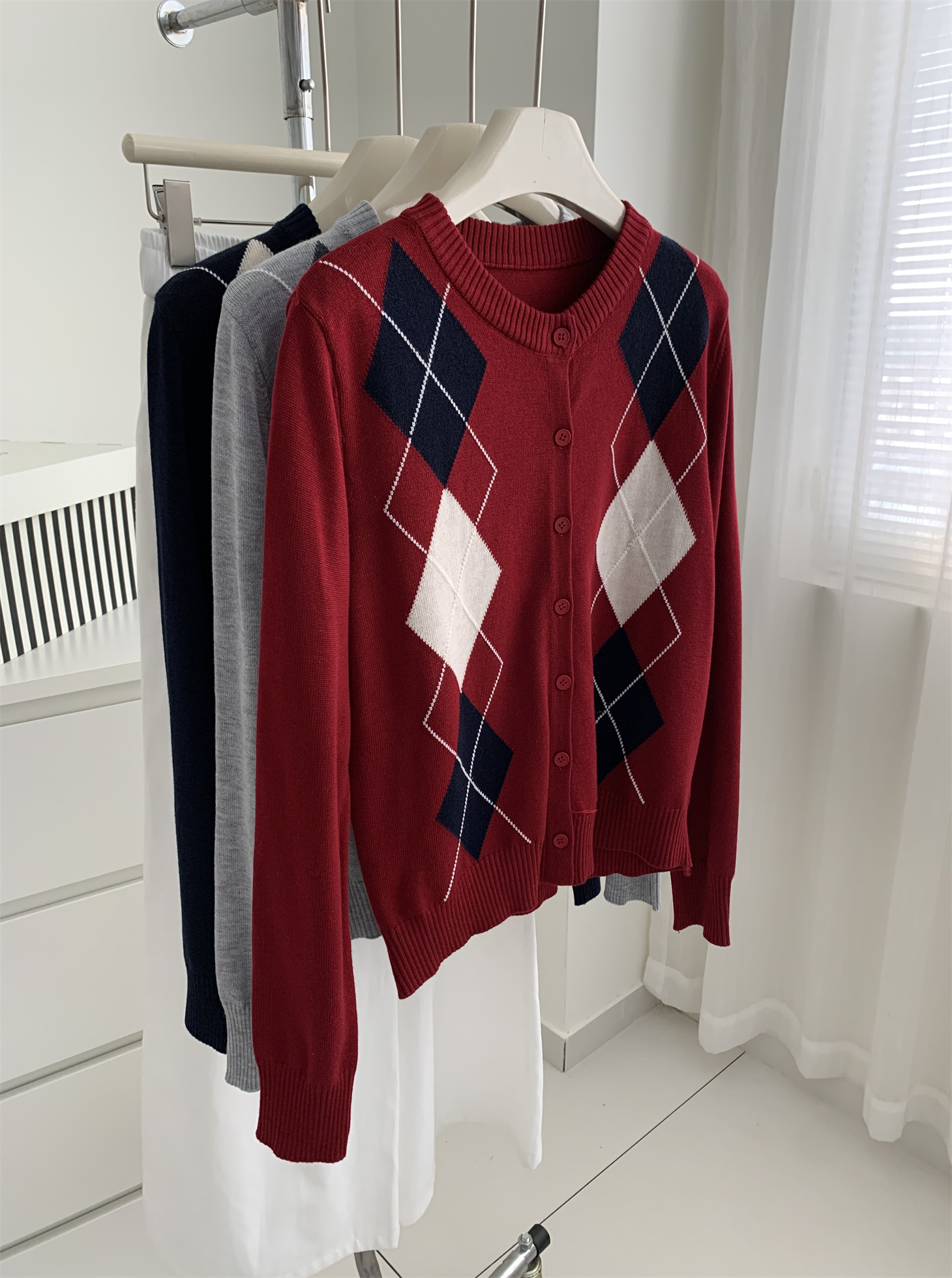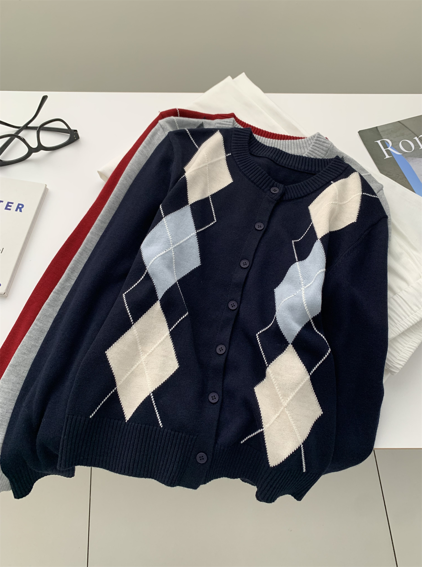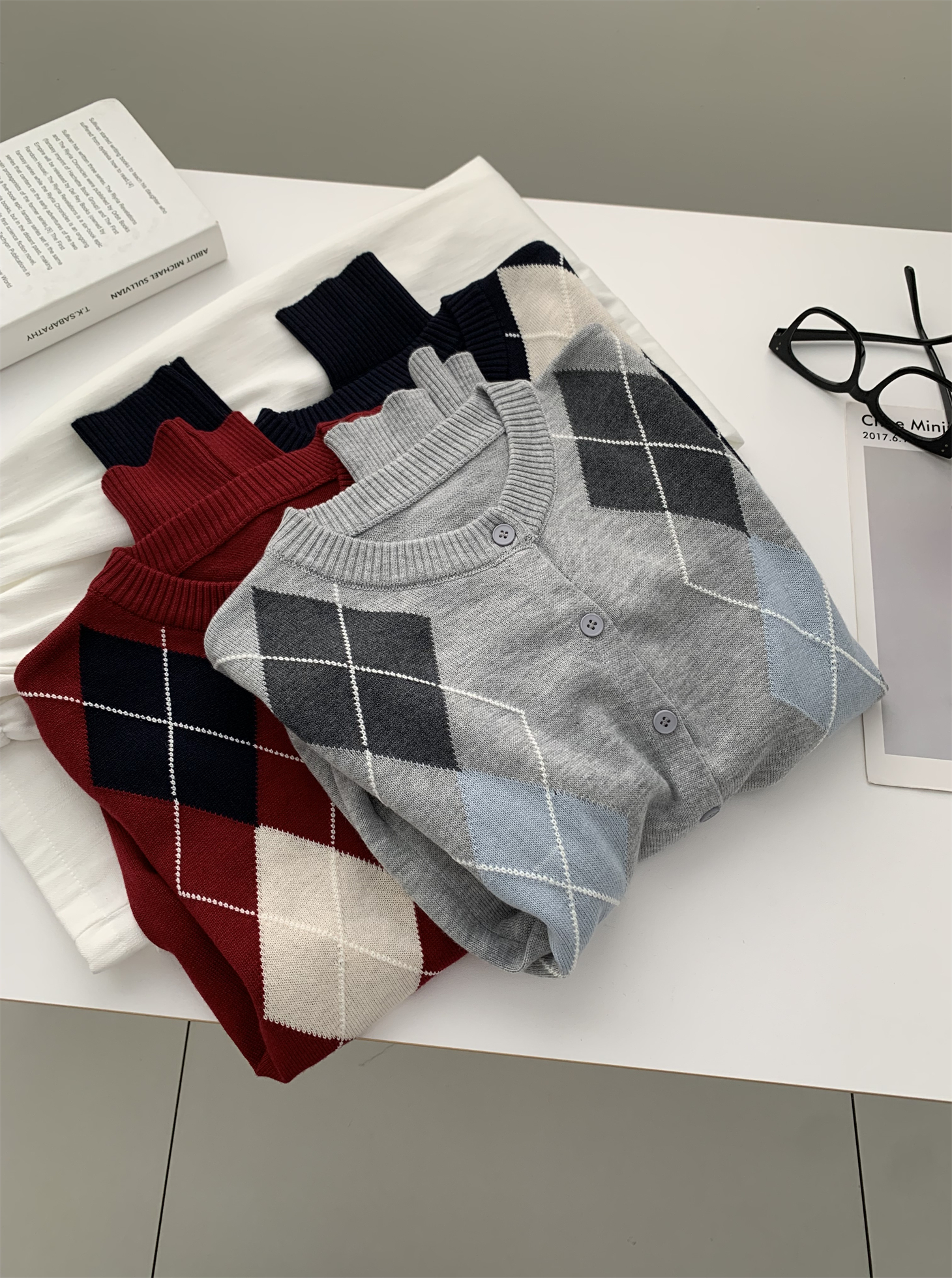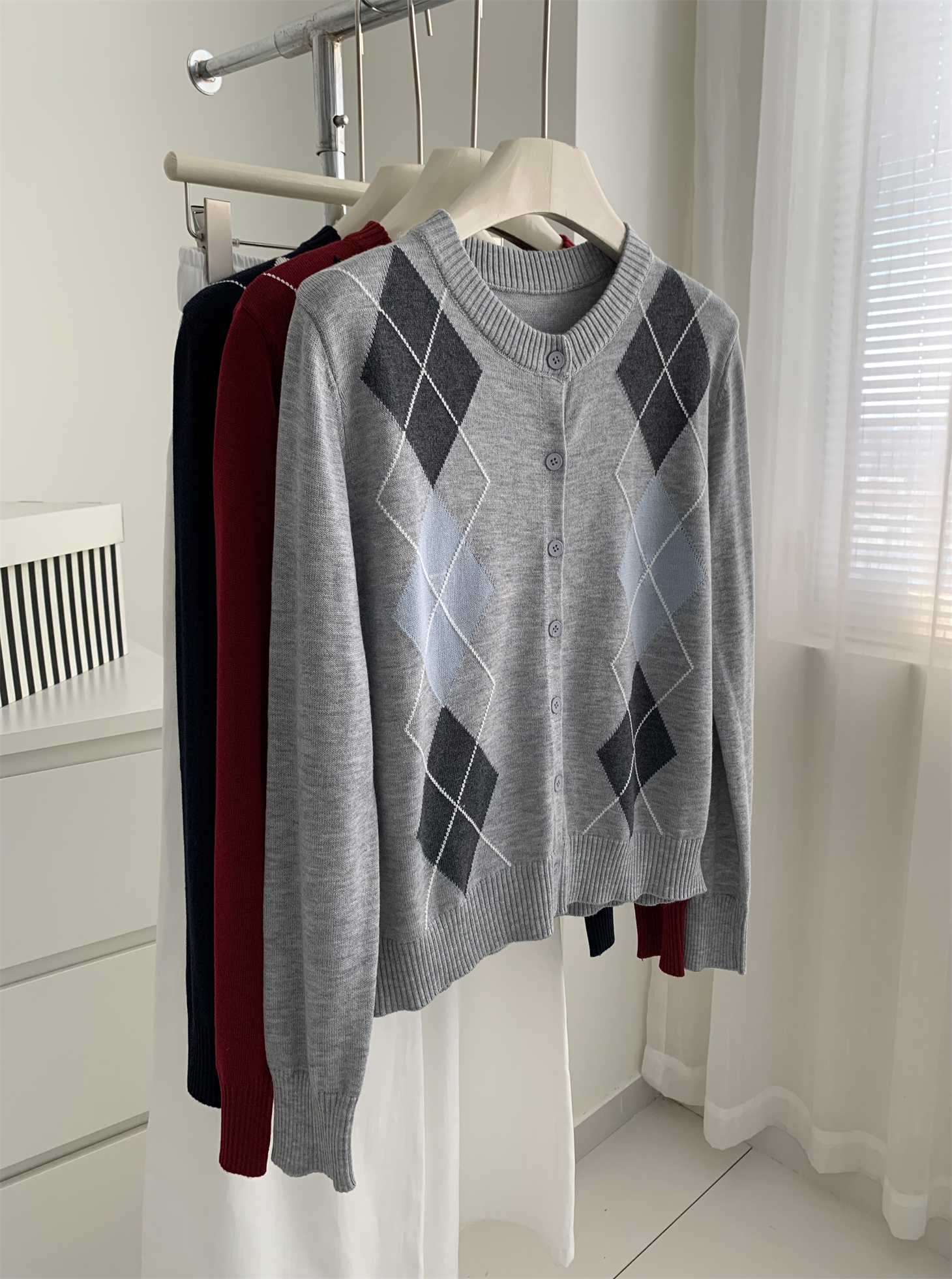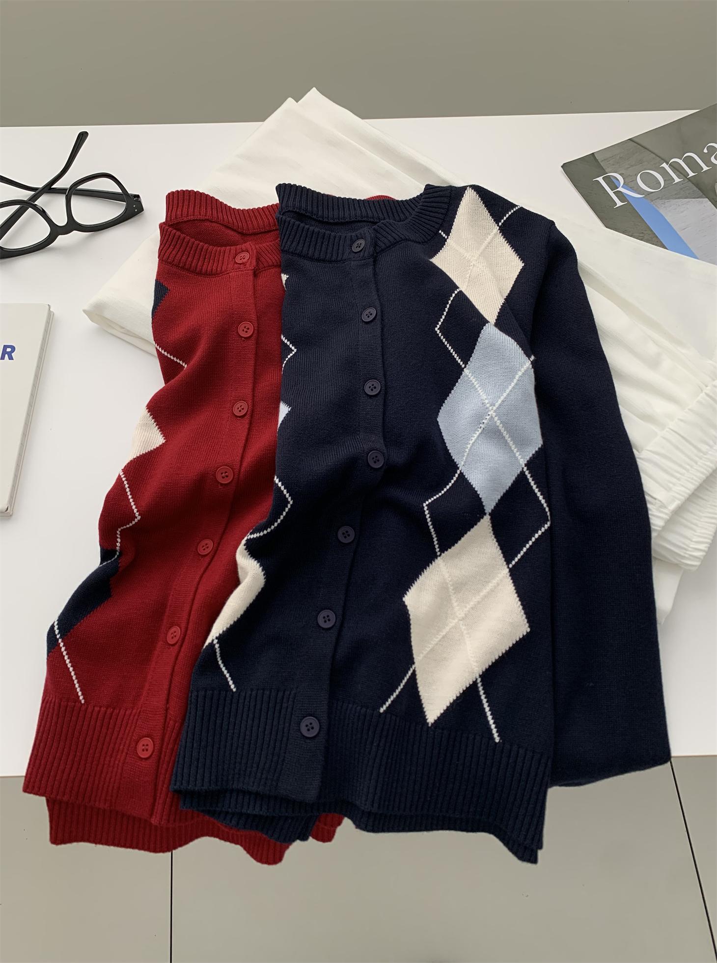 格蕾系复古撞色菱格针织开衫女细腻软糯羊毛圆领薄毛衣外套秋冬款