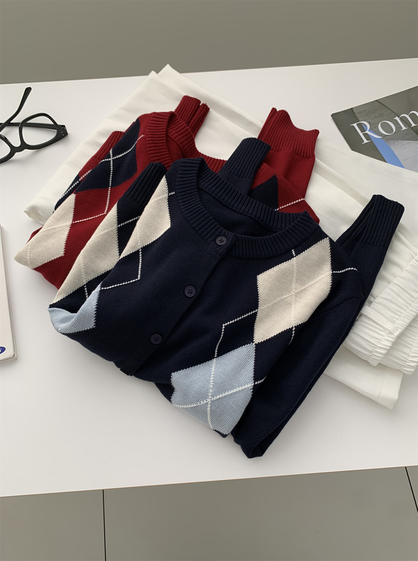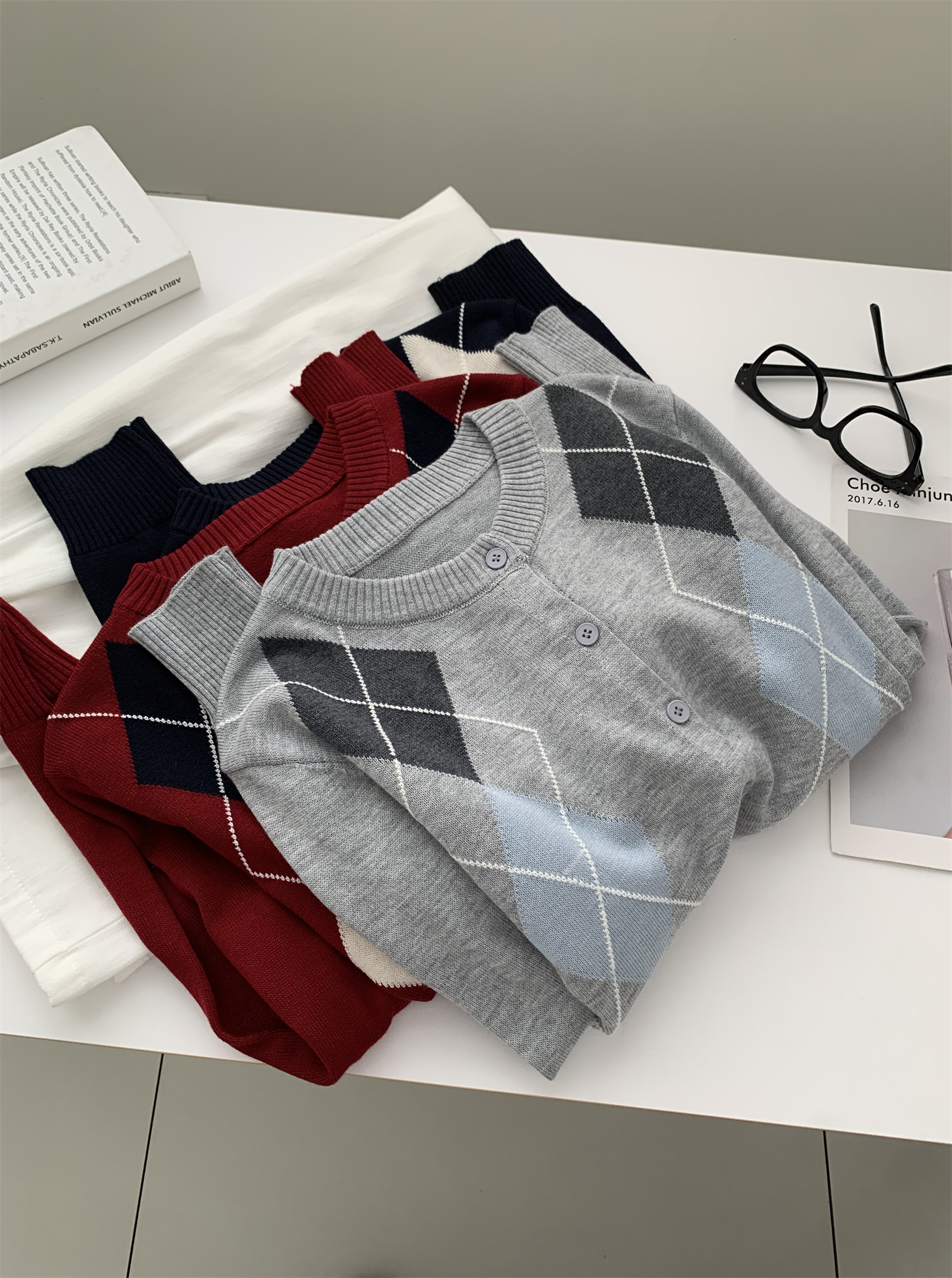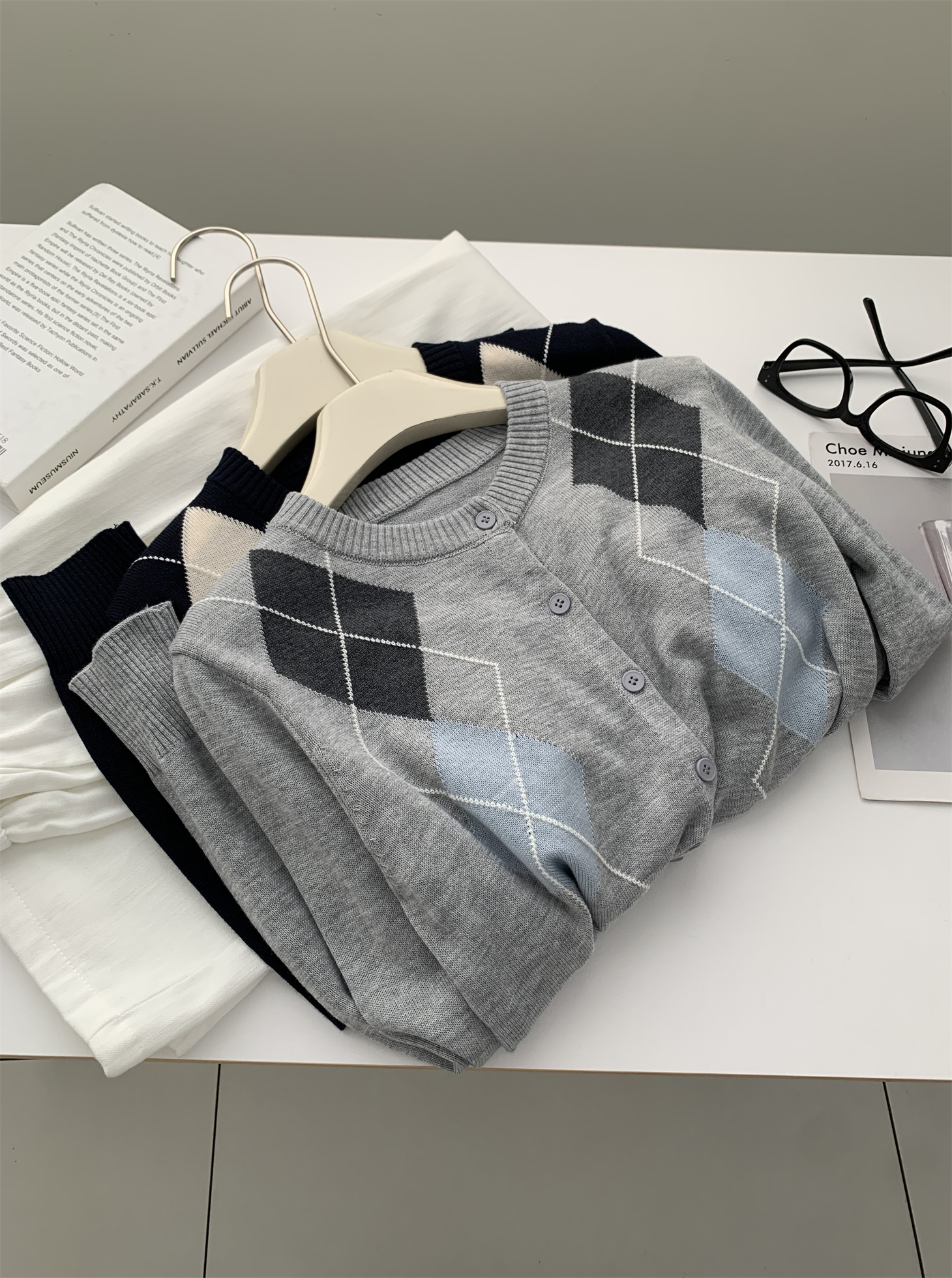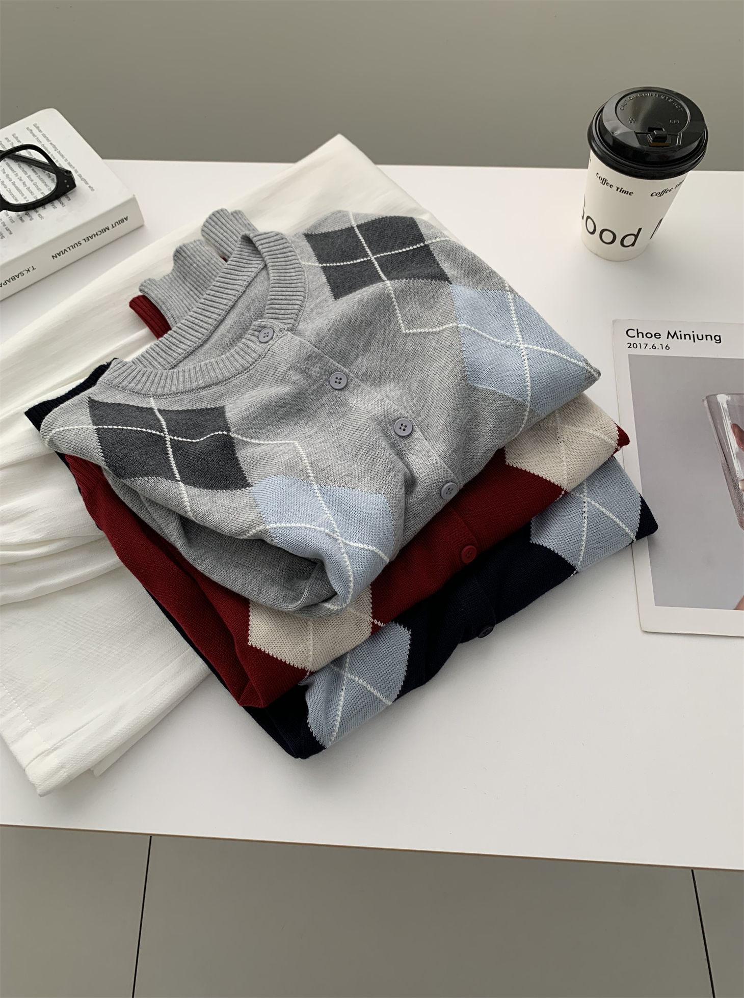 格蕾系复古撞色菱格针织开衫女细腻软糯羊毛圆领薄毛衣外套秋冬款