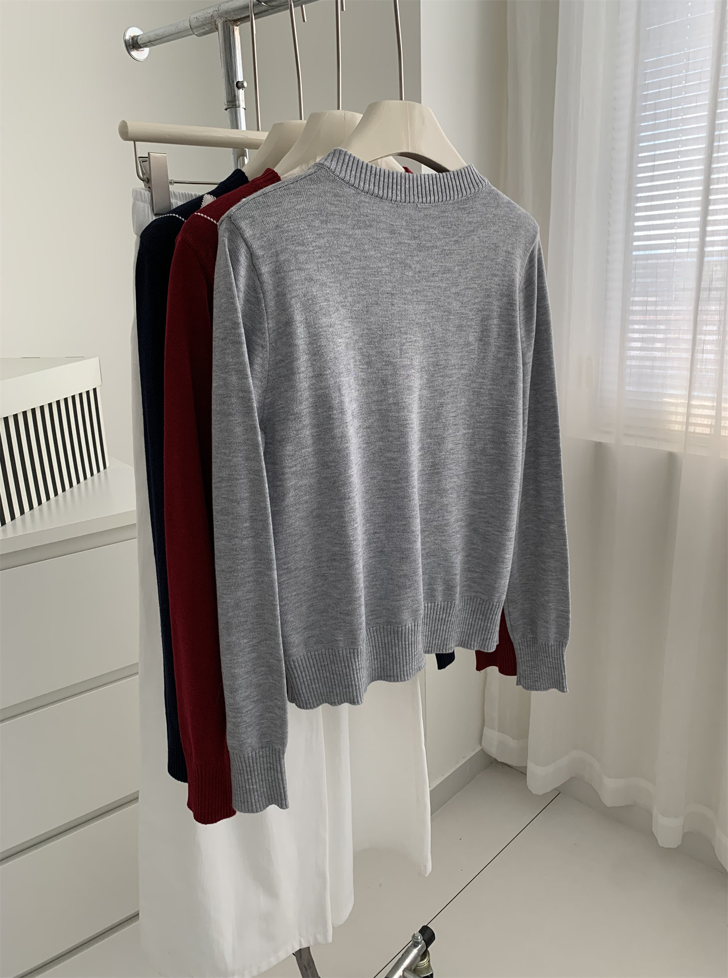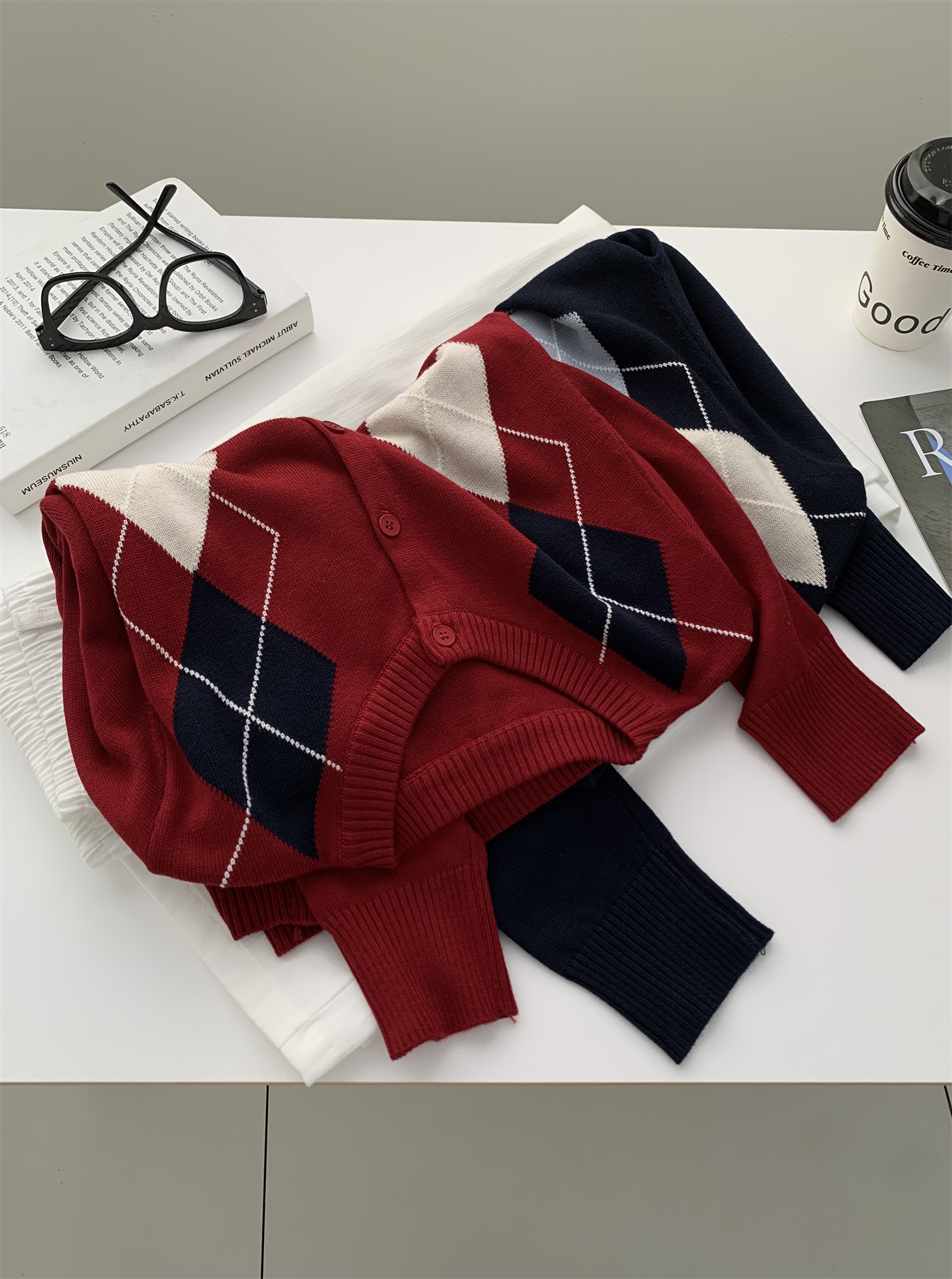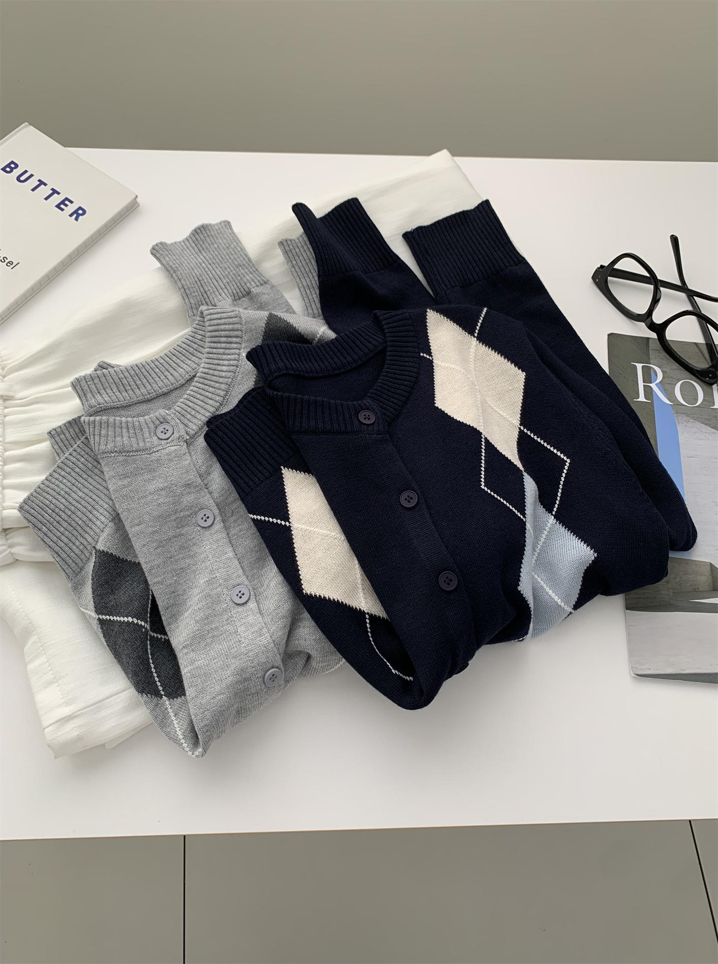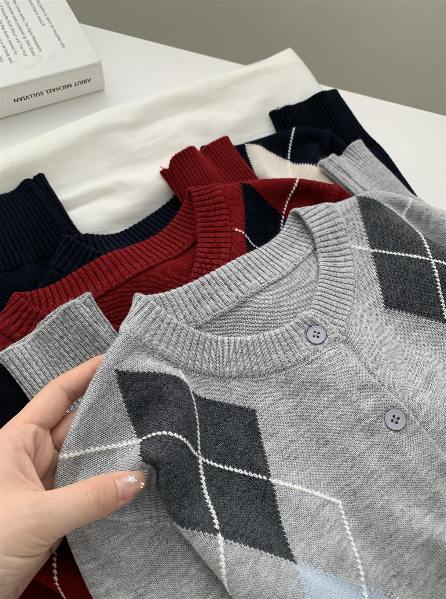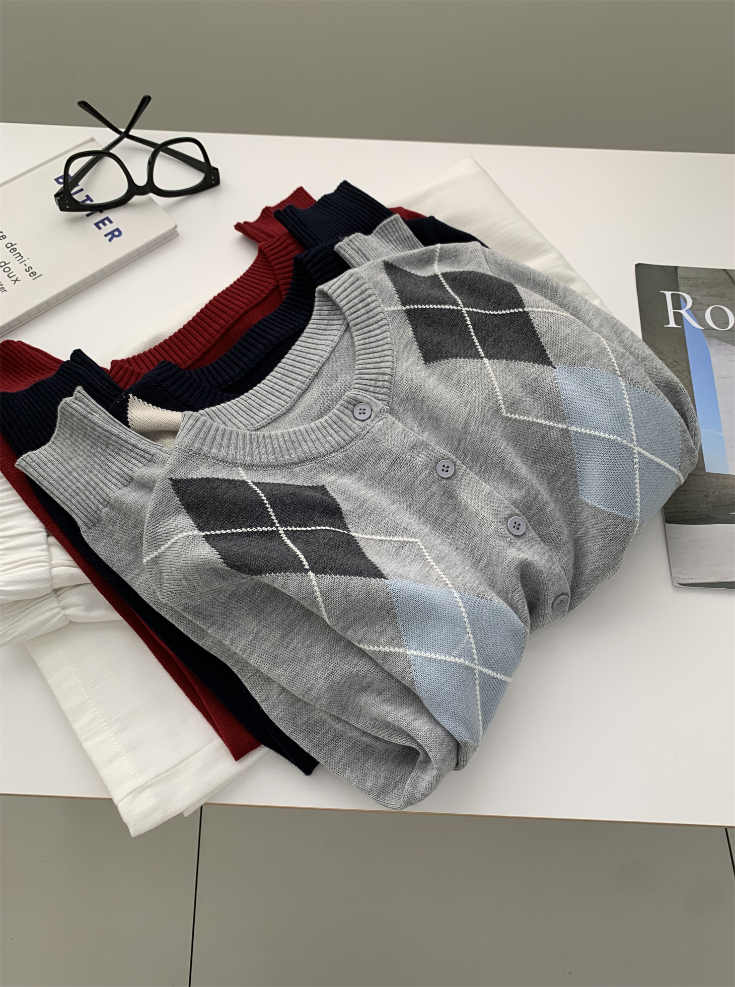格蕾系复古撞色菱格针织开衫女细腻软糯羊毛圆领薄毛衣外套秋冬款