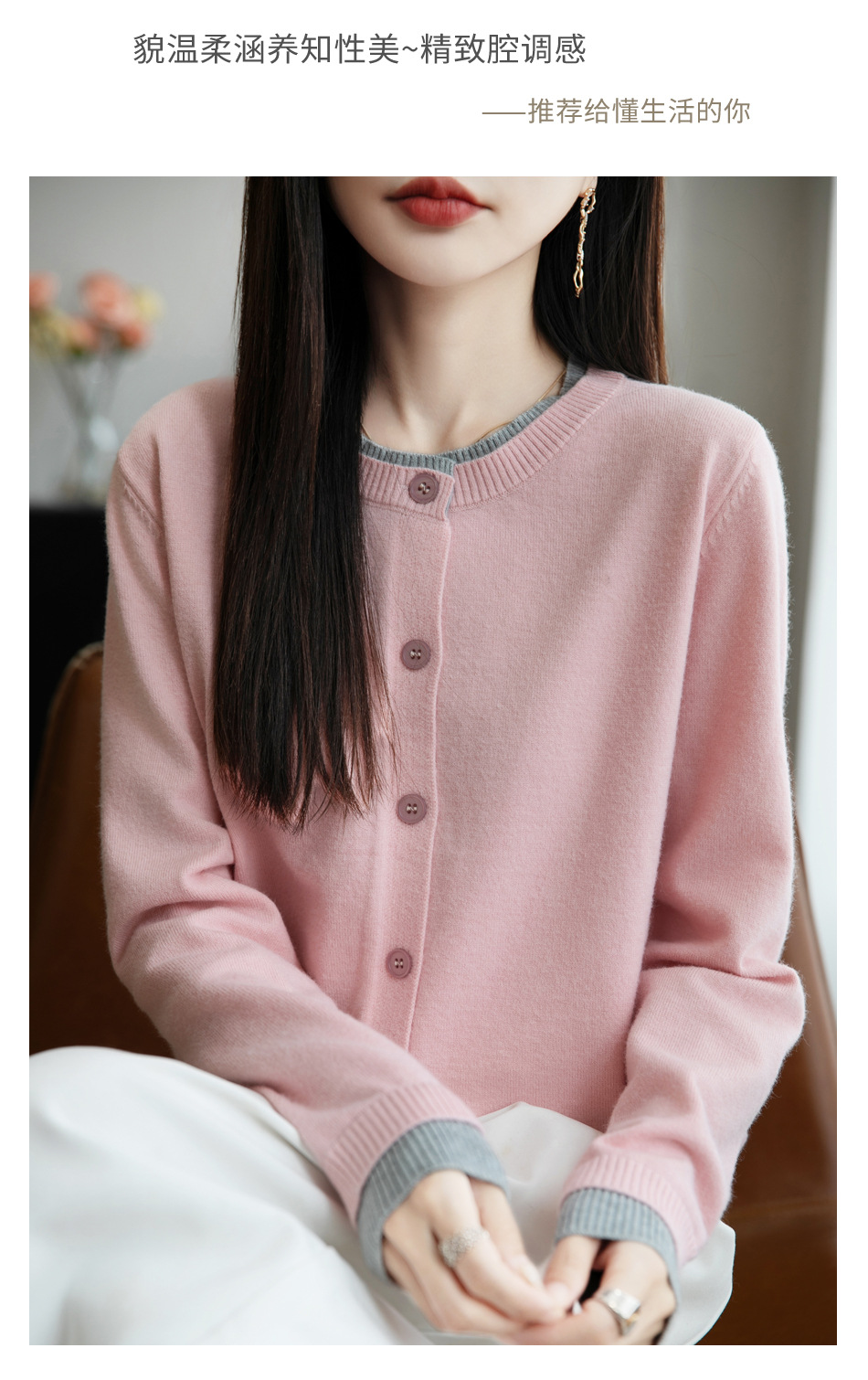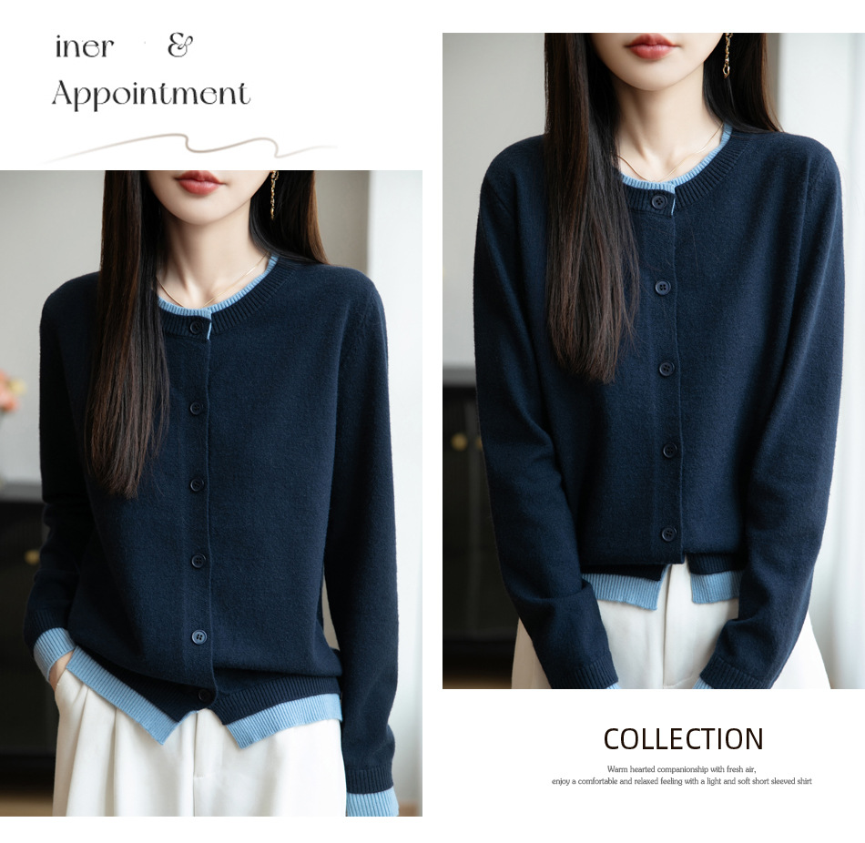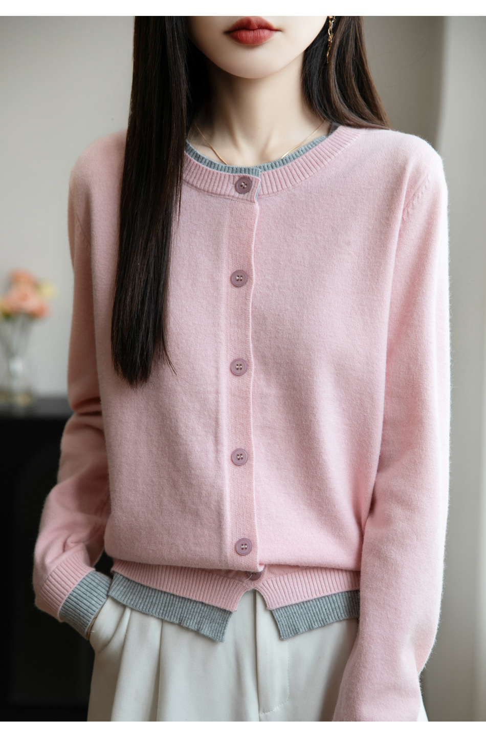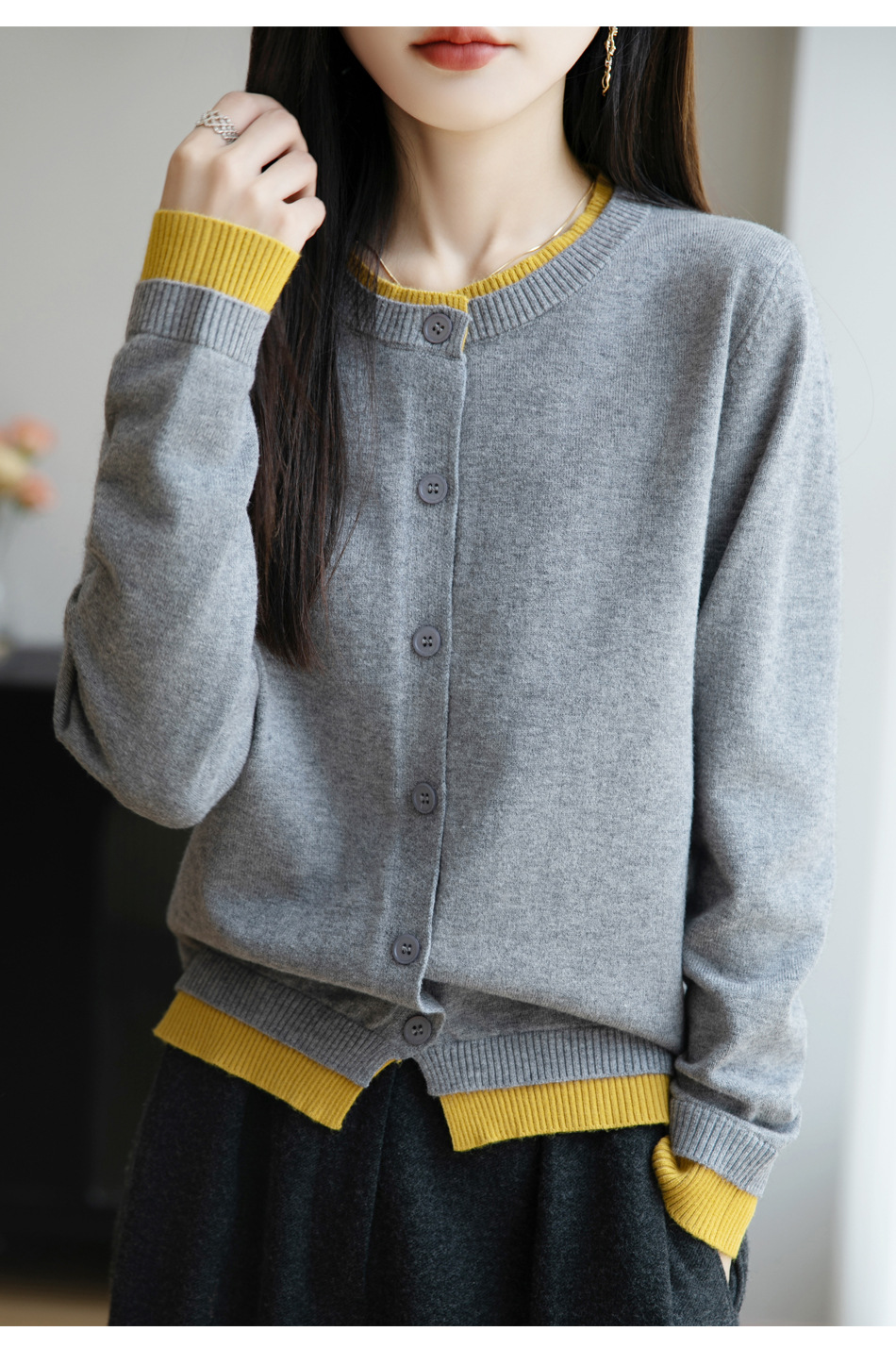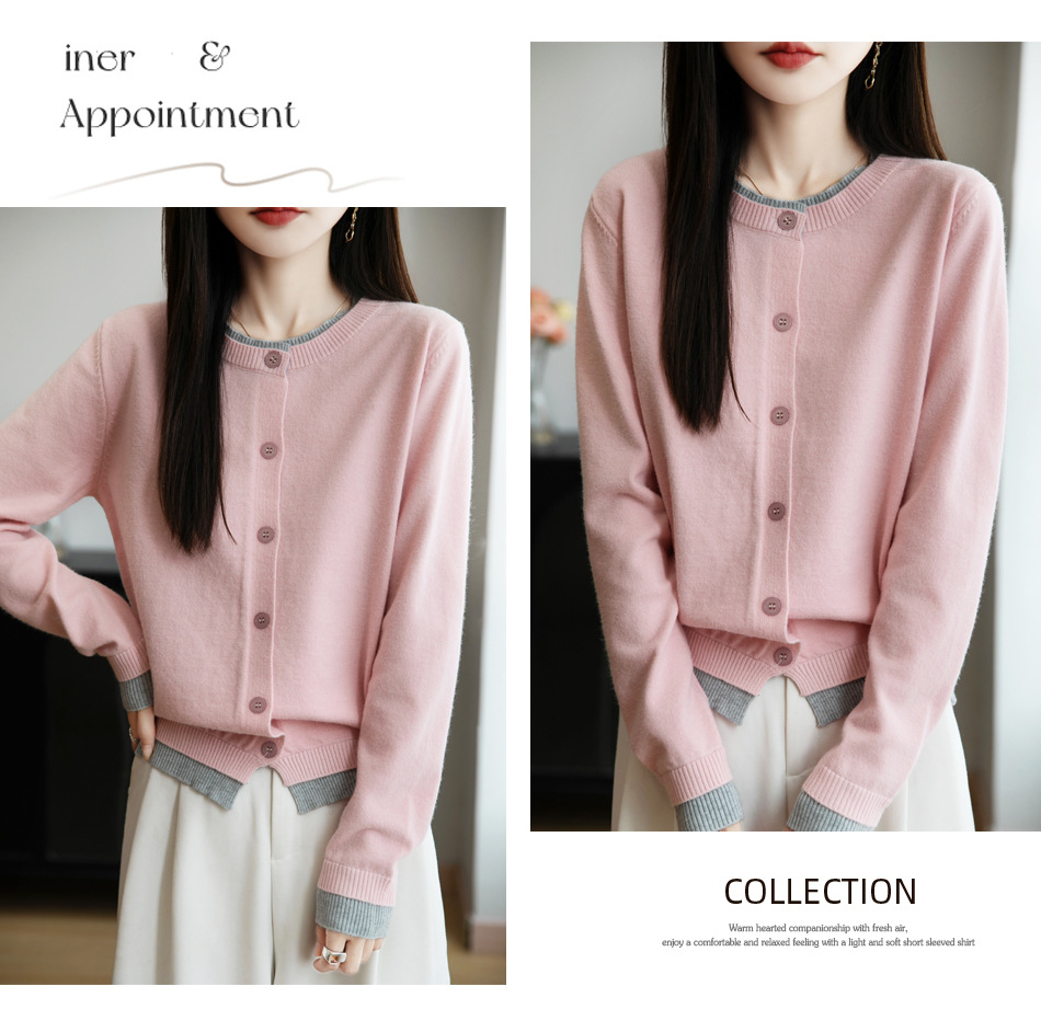 羊毛混纺2025秋冬新女宽松拼色圆领系扣假两件打底外穿针织衫外套