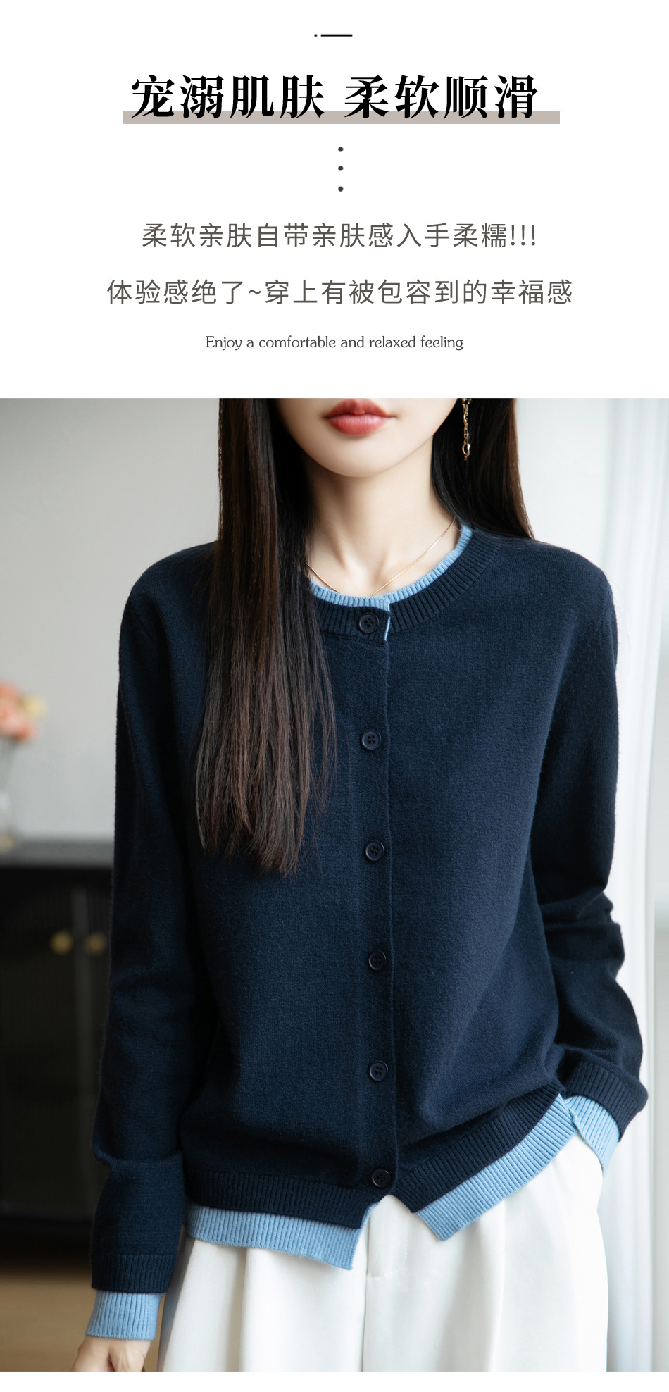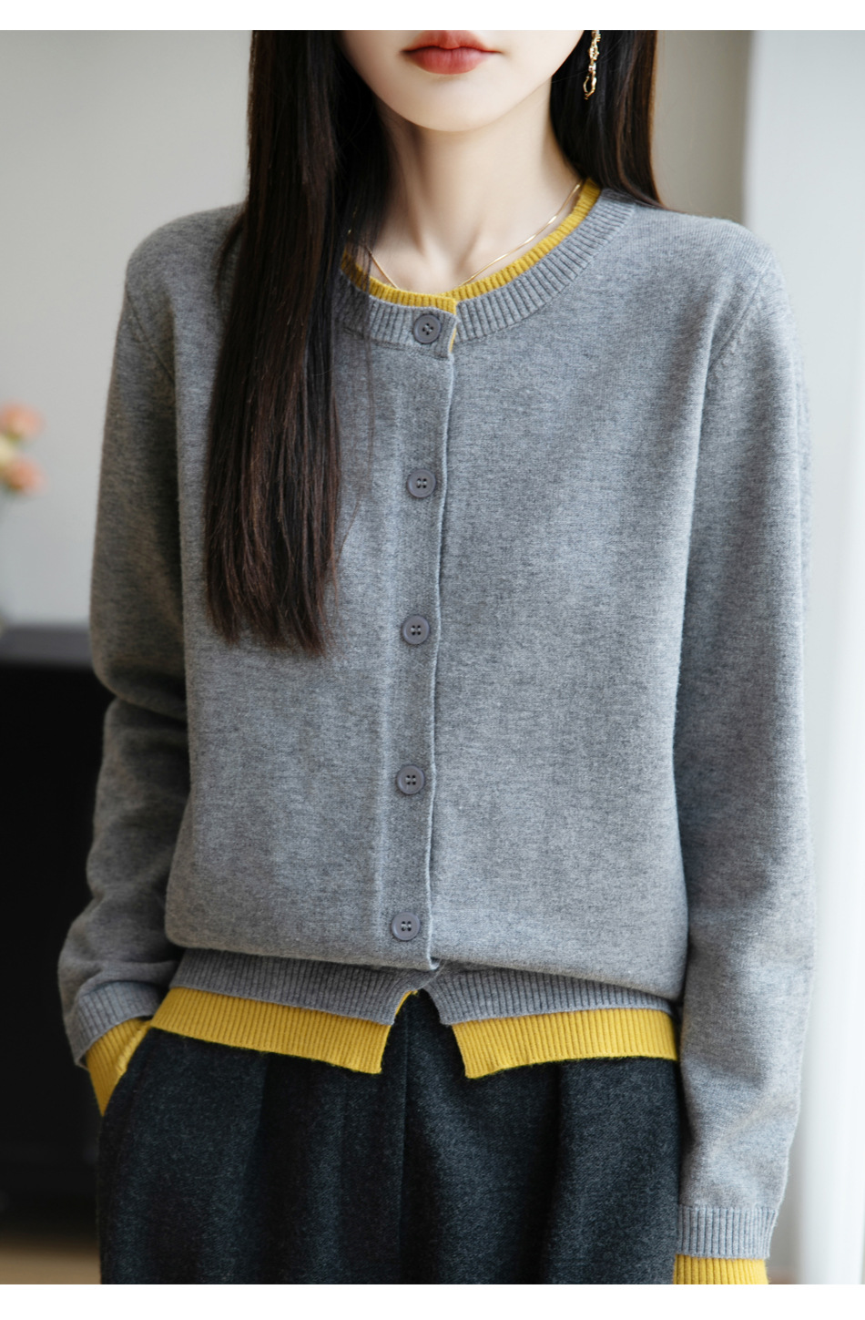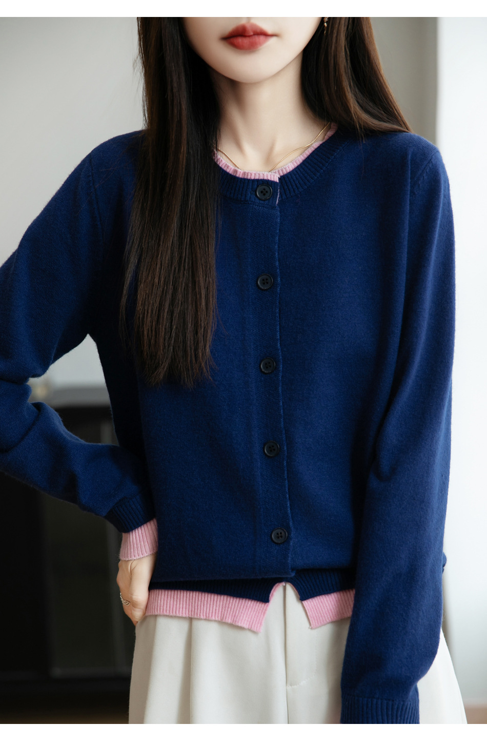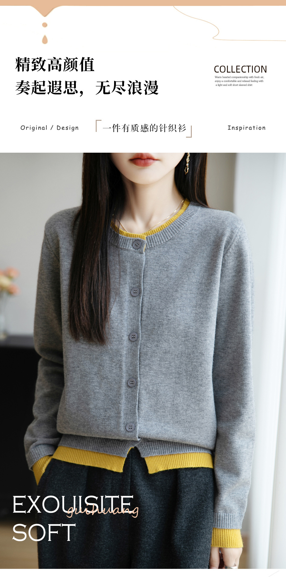 羊毛混纺2025秋冬新女宽松拼色圆领系扣假两件打底外穿针织衫外套