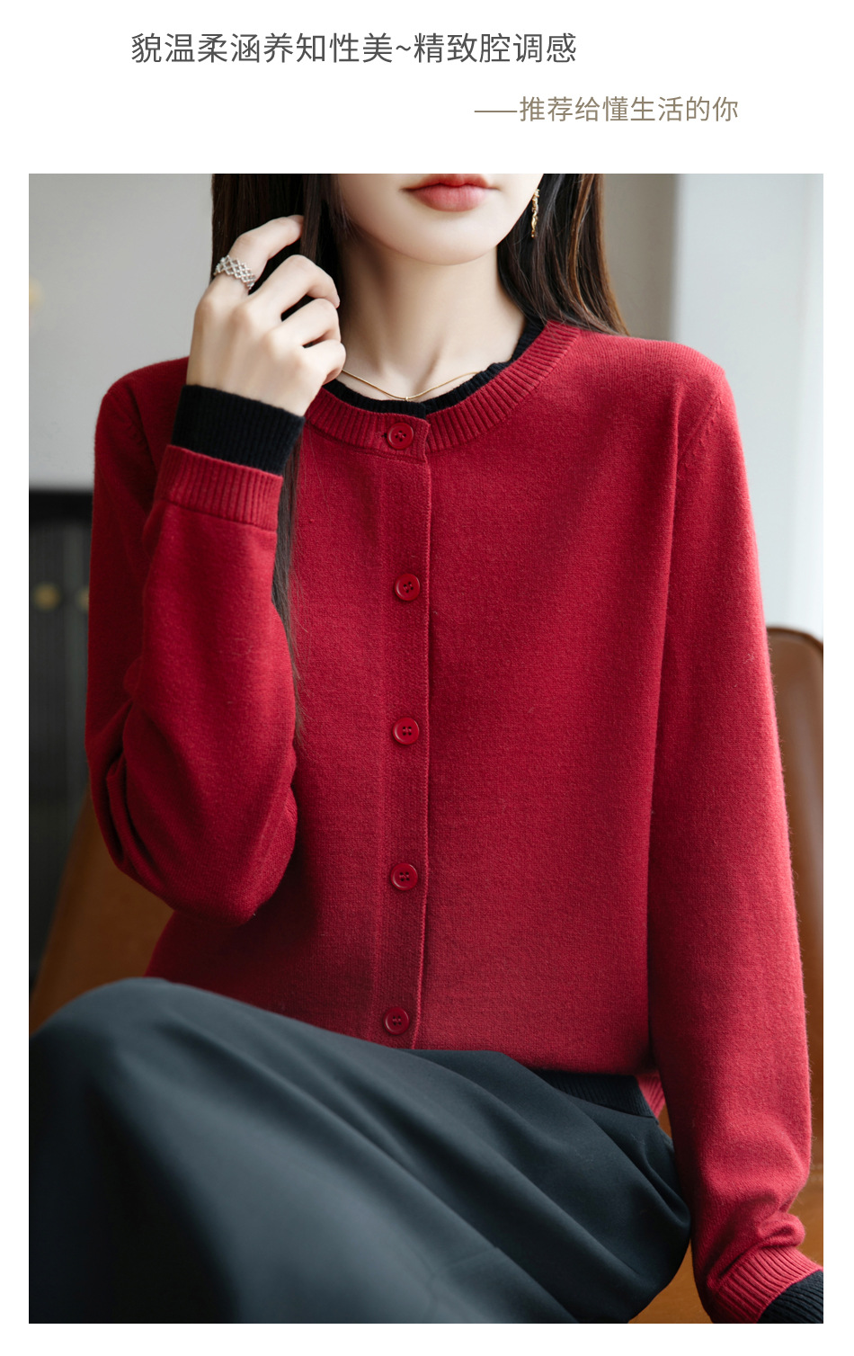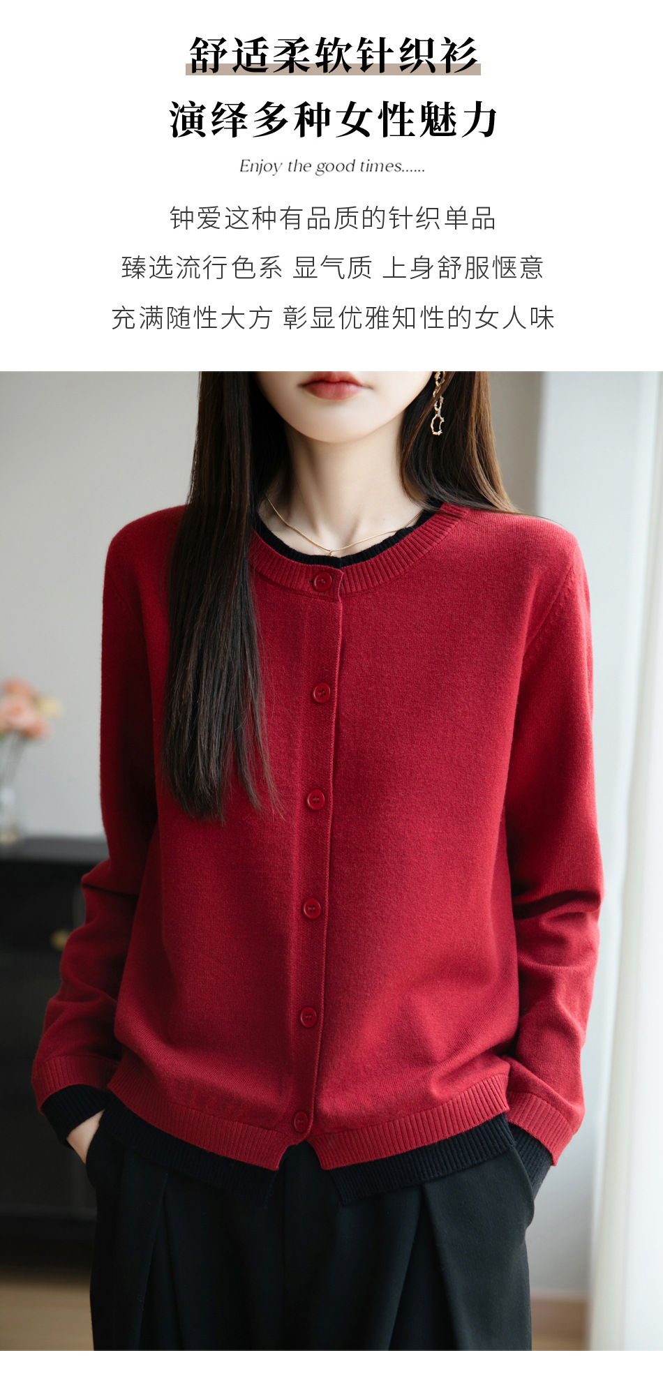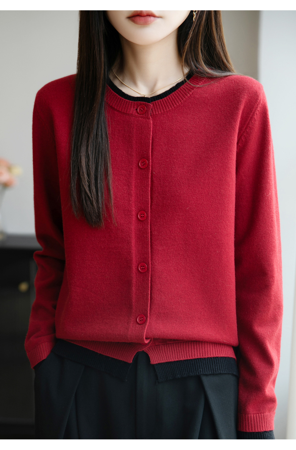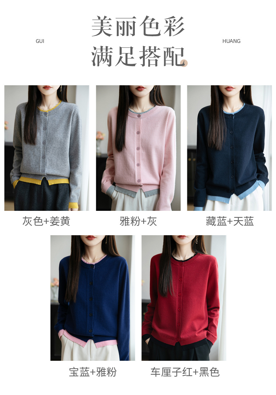 羊毛混纺2025秋冬新女宽松拼色圆领系扣假两件打底外穿针织衫外套