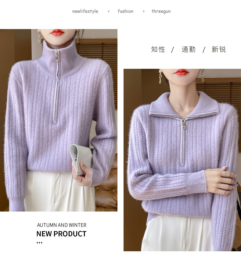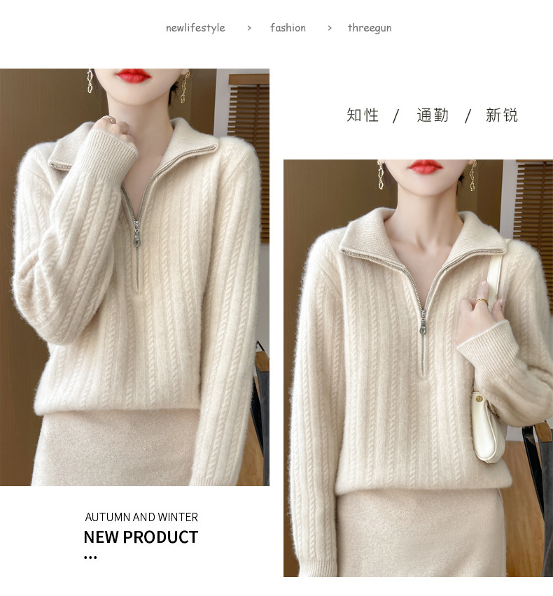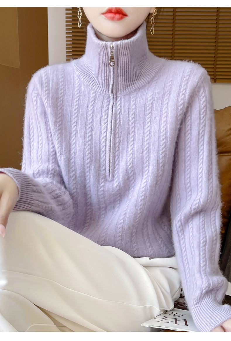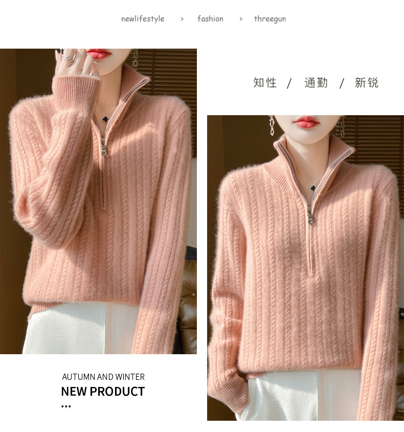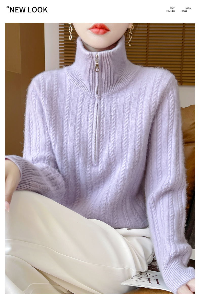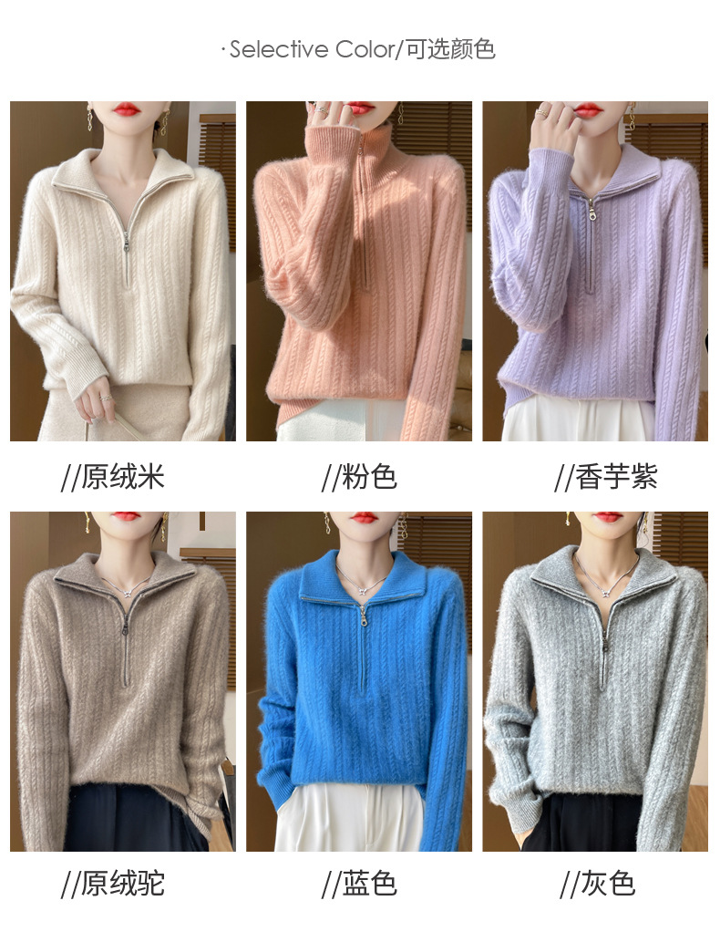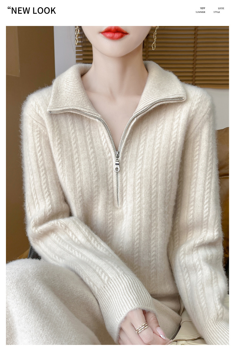 新款加厚翻领半拉链羊毛衫秋冬女软糯小麻花针织毛衣休闲宽松上衣