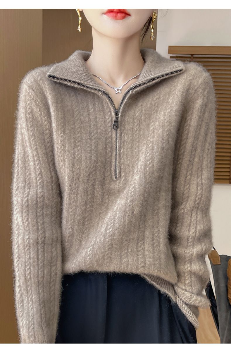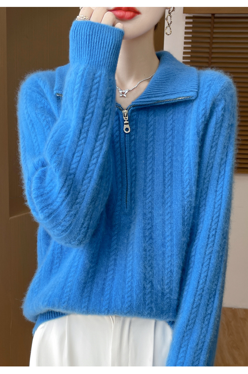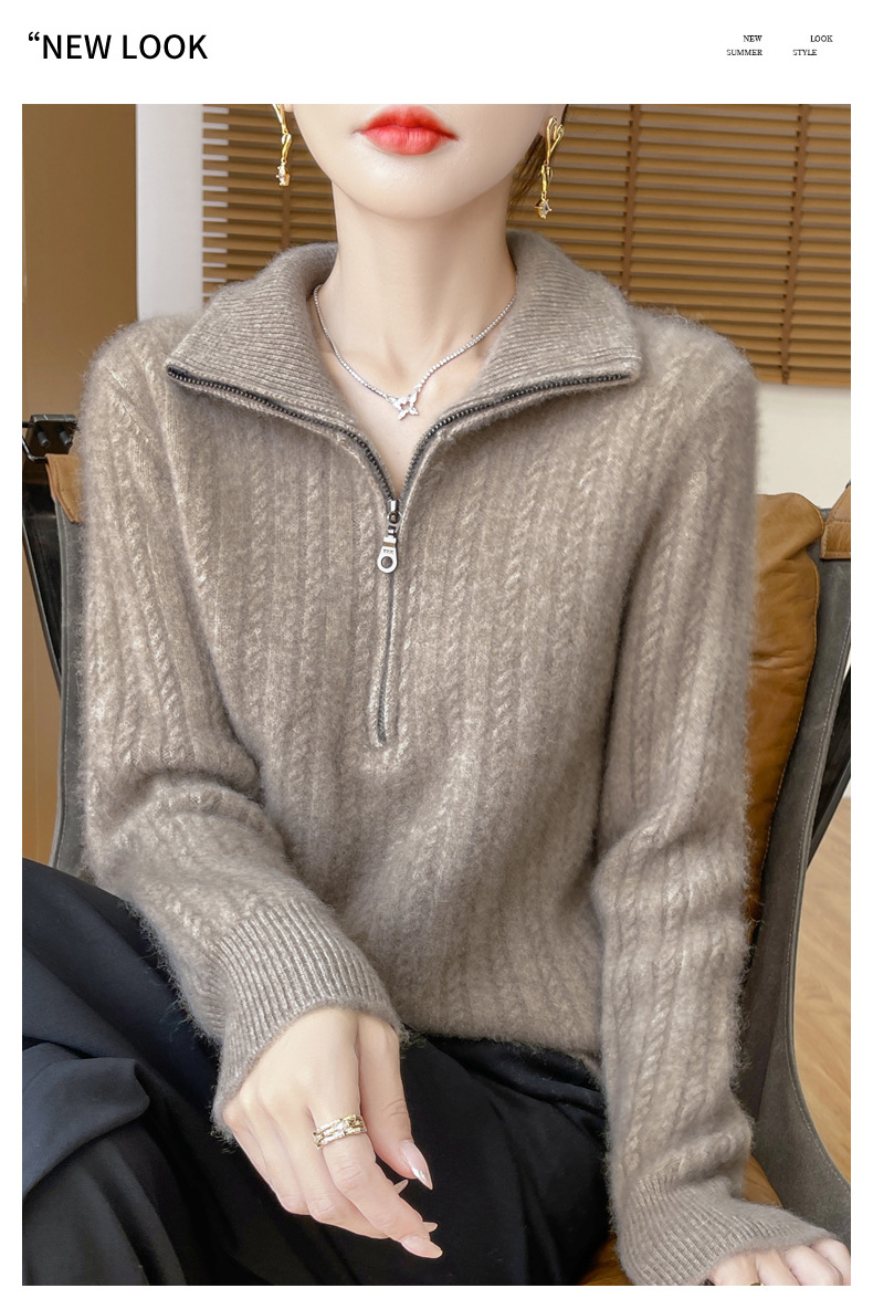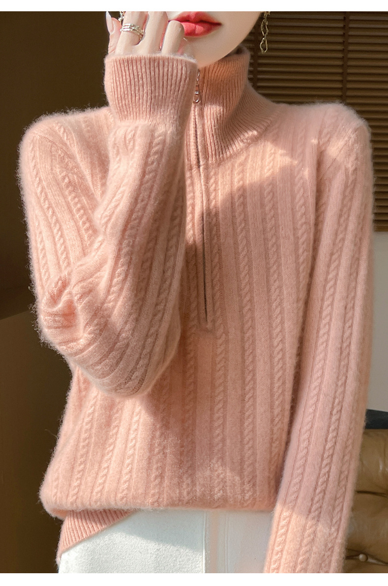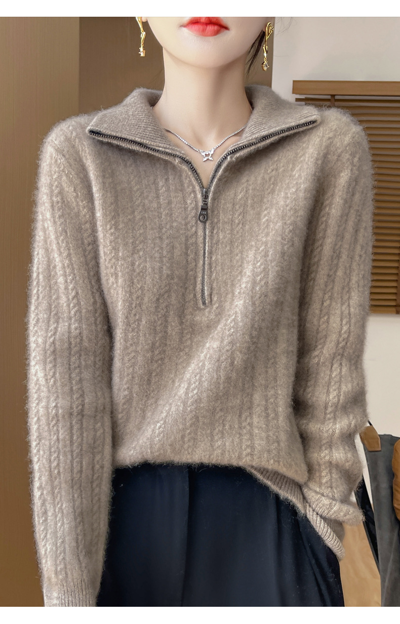 新款加厚翻领半拉链羊毛衫秋冬女软糯小麻花针织毛衣休闲宽松上衣