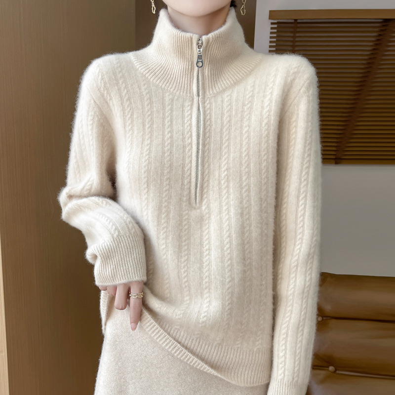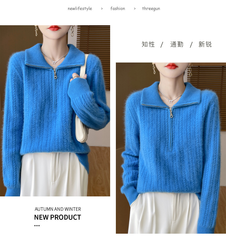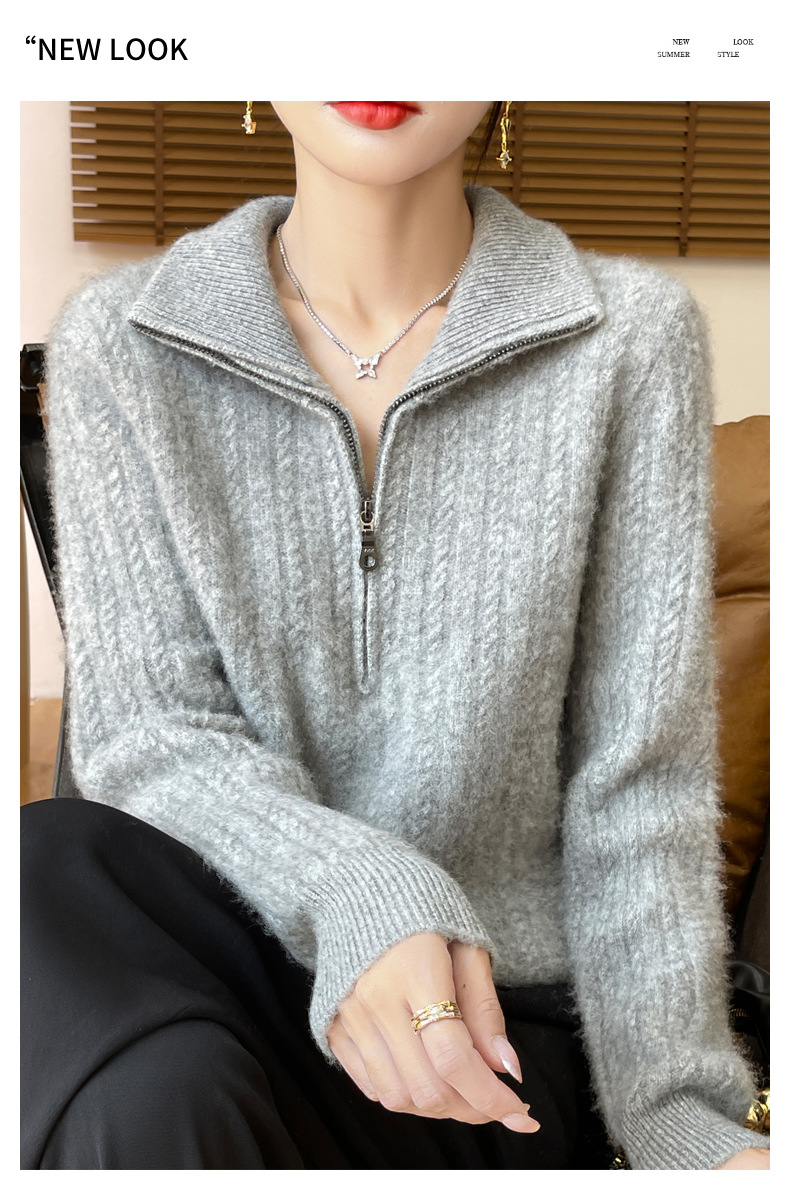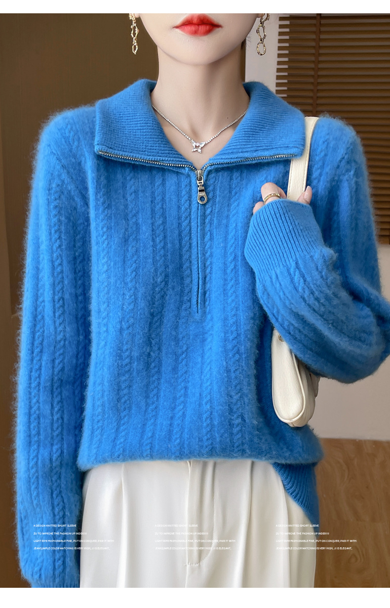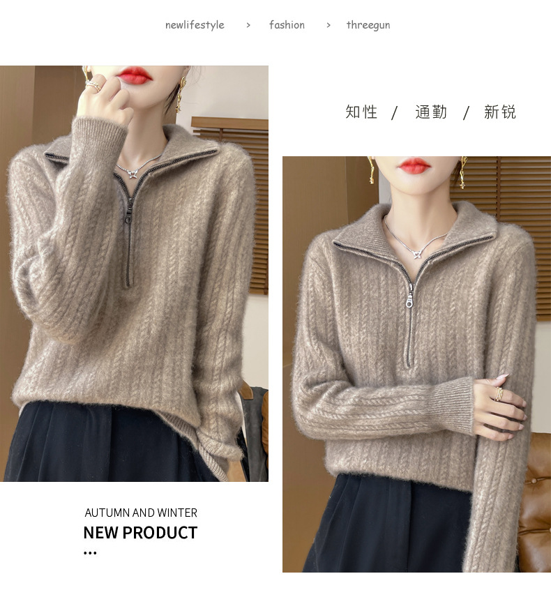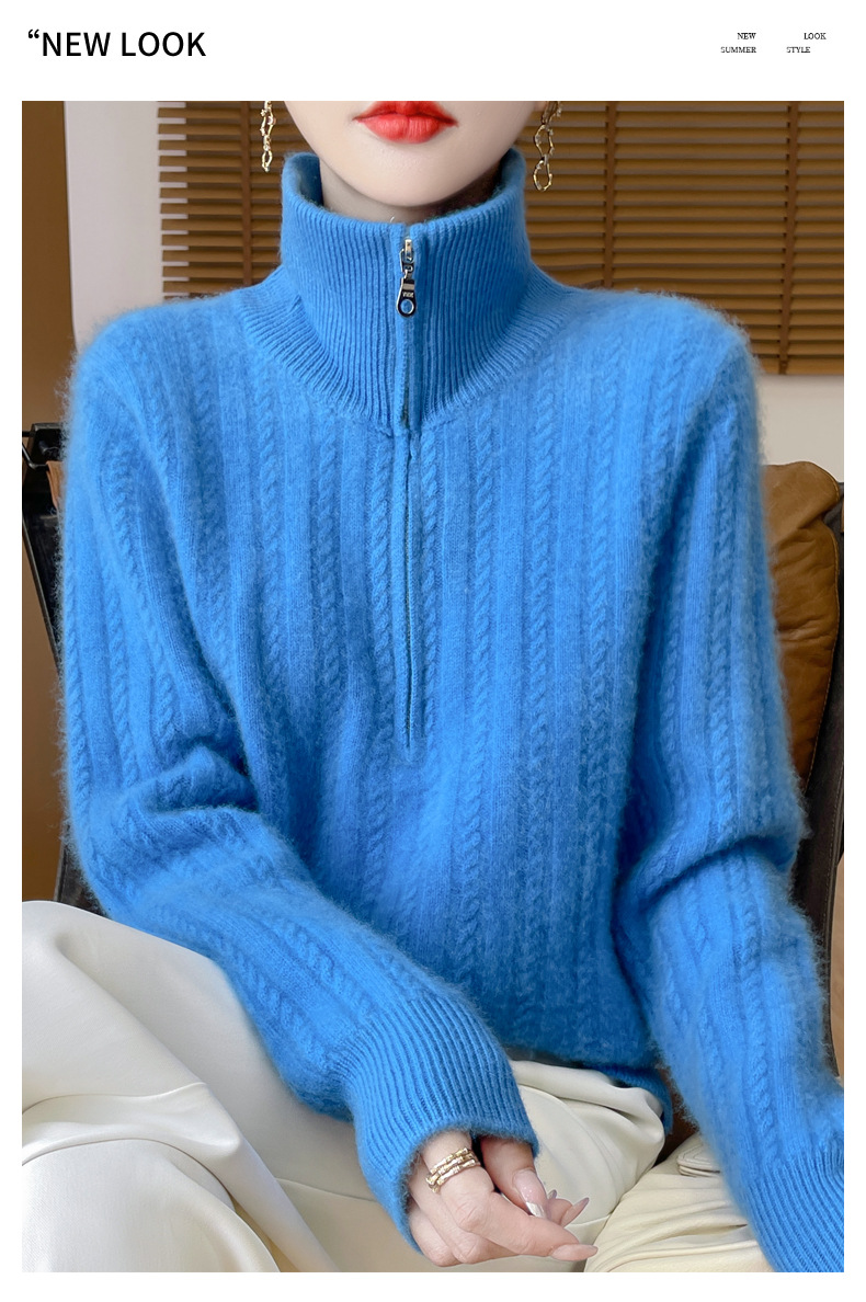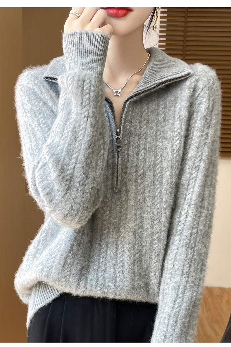 新款加厚翻领半拉链羊毛衫秋冬女软糯小麻花针织毛衣休闲宽松上衣