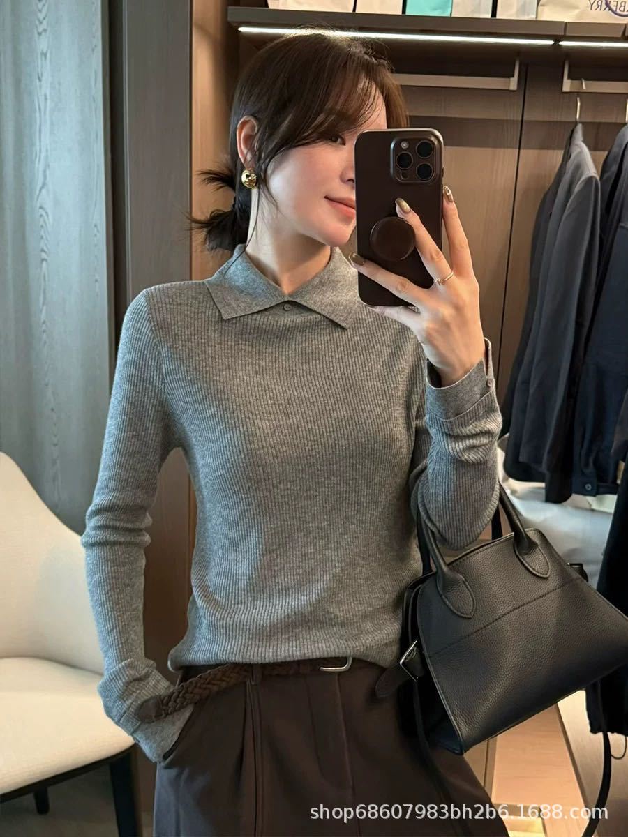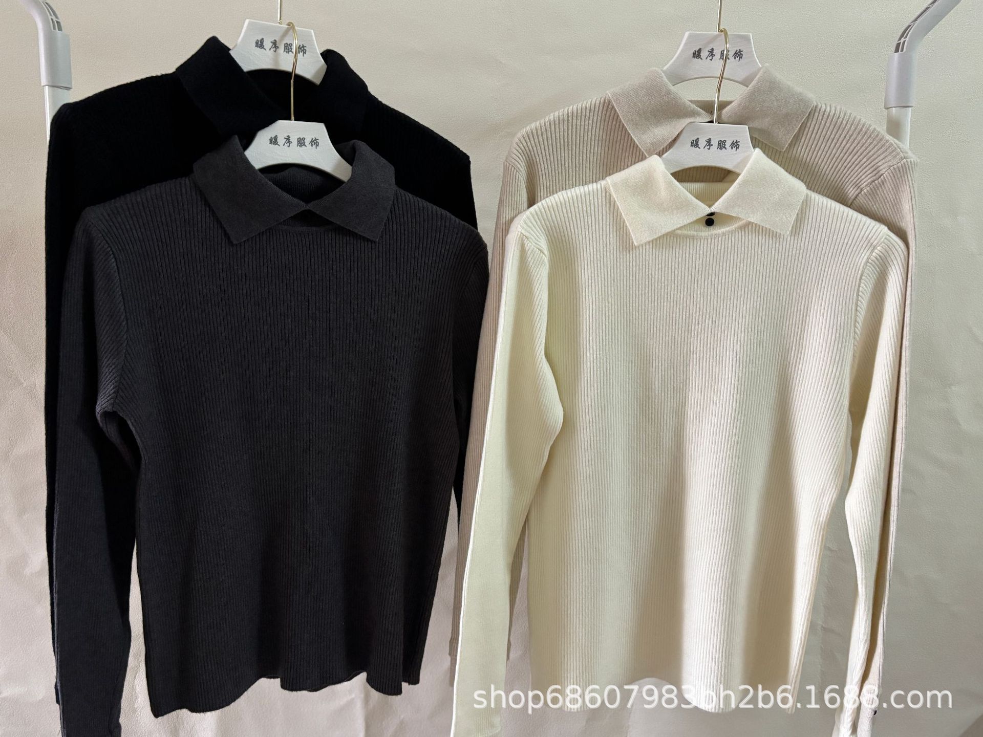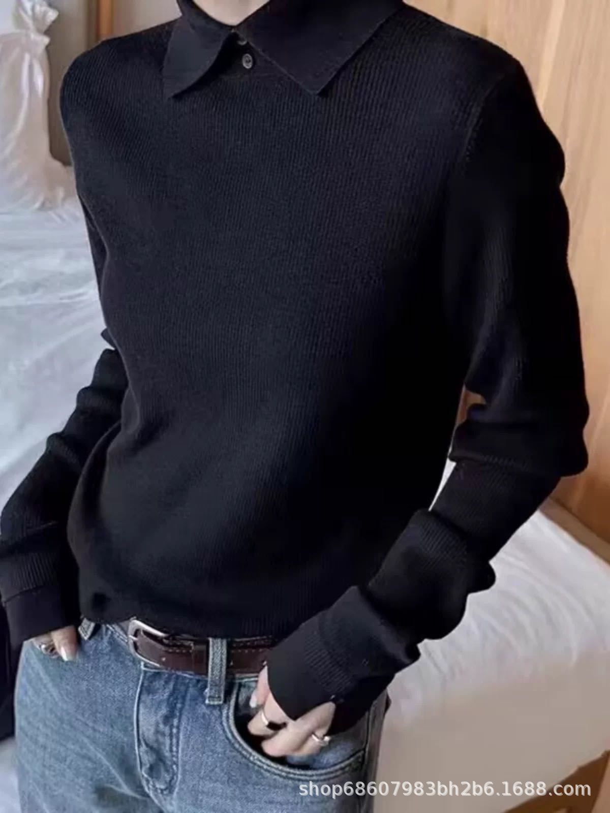 2025新款女装小众设计气质感翻领假两件简约舒适百搭针织毛衣长袖