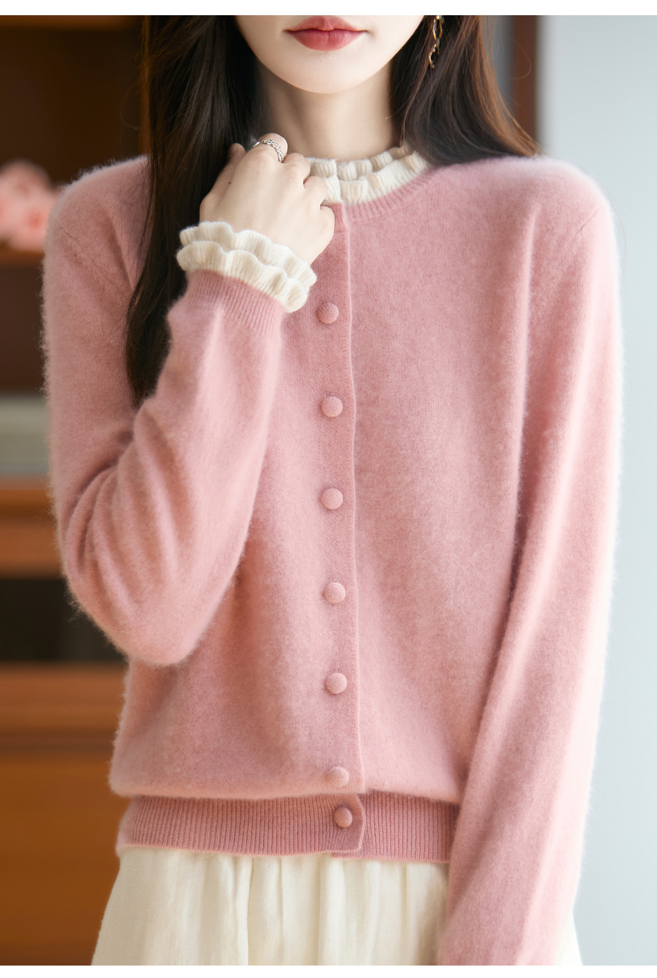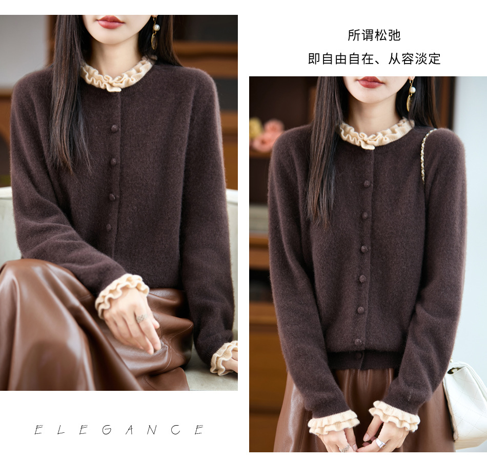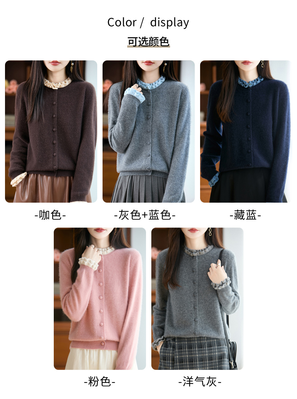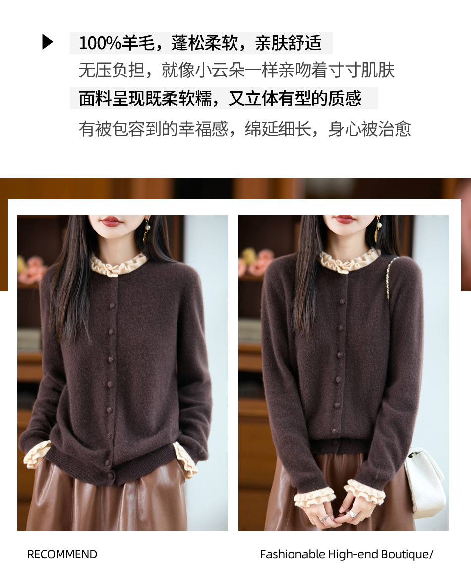 时尚减龄木耳花边羊毛针织衫开衫女秋冬新款毛衣女士包扣拼色外套