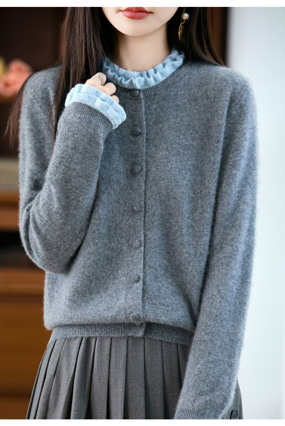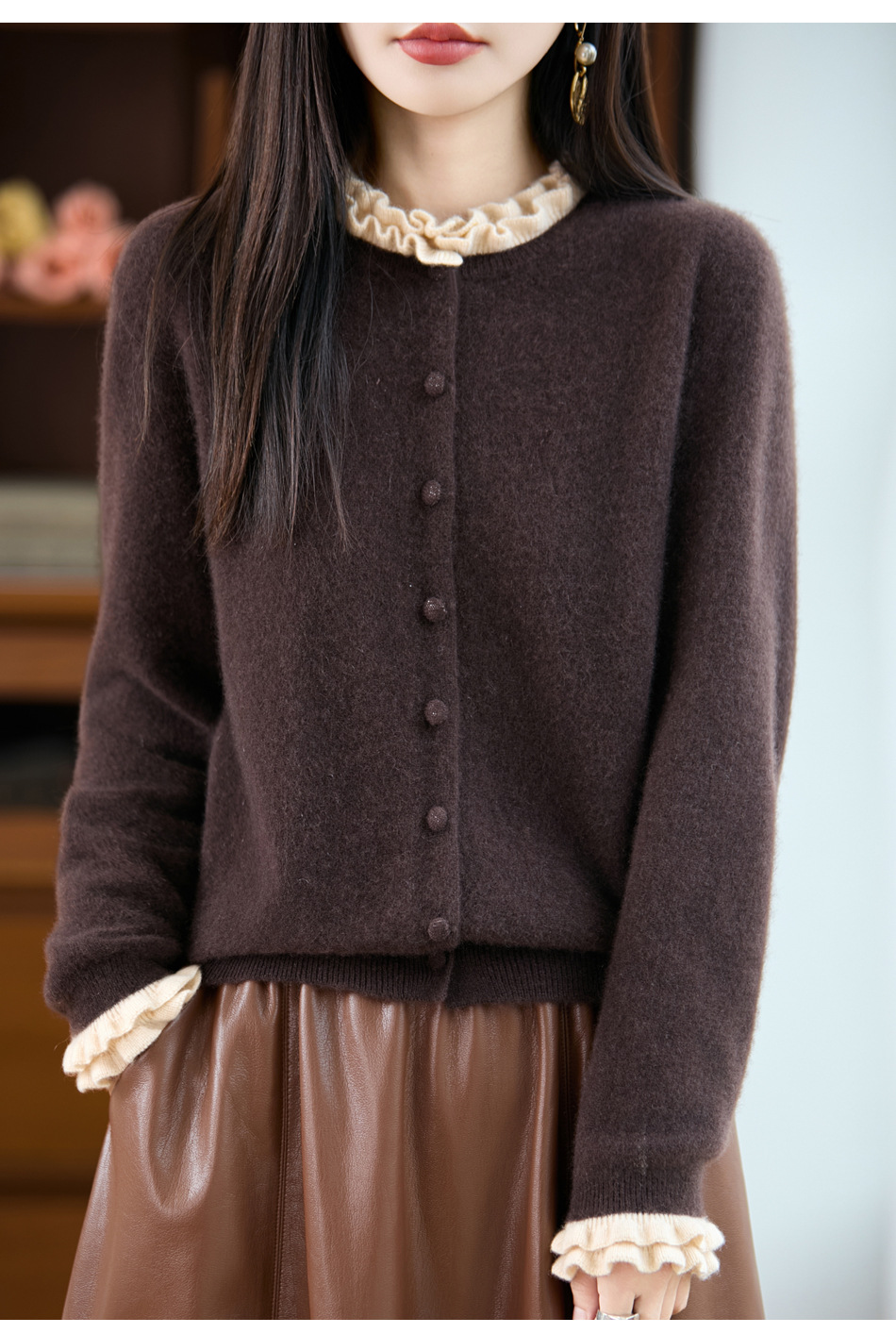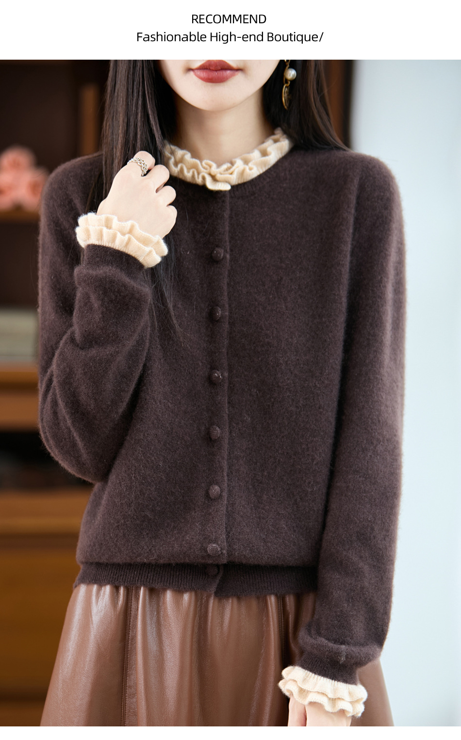 时尚减龄木耳花边羊毛针织衫开衫女秋冬新款毛衣女士包扣拼色外套