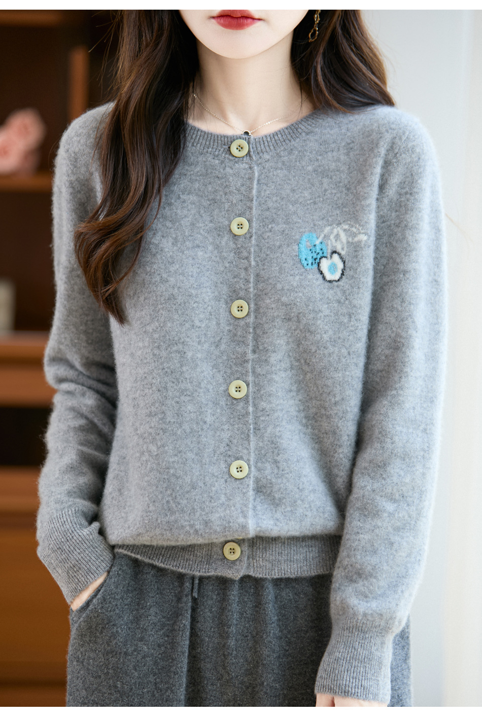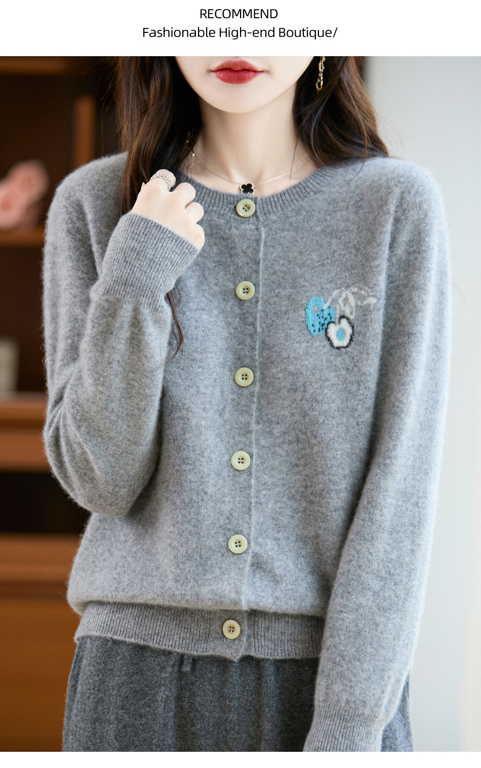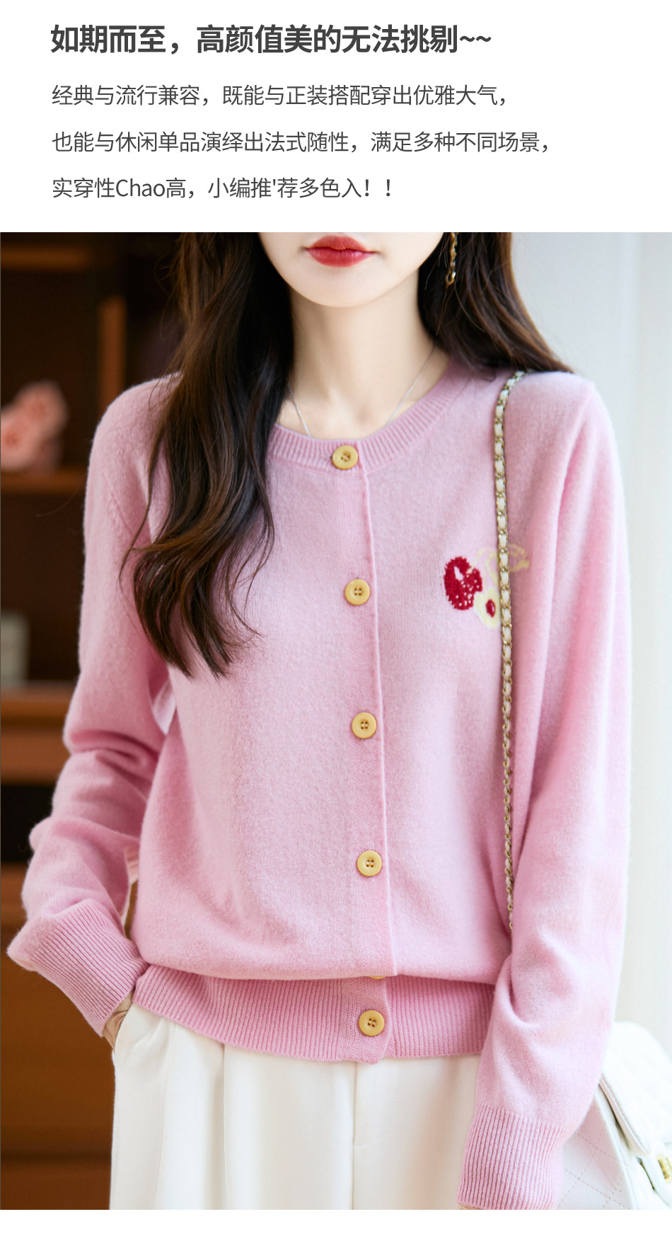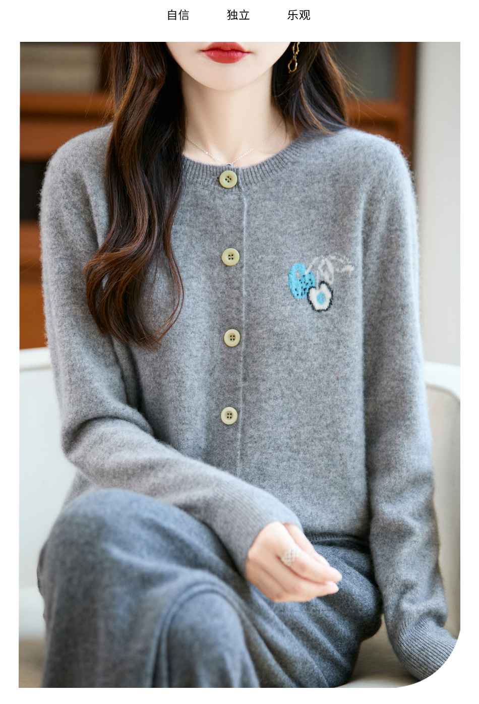 新款100纯羊毛衫女圆领开衫外穿上衣针织打底衫秋冬百搭女装外套