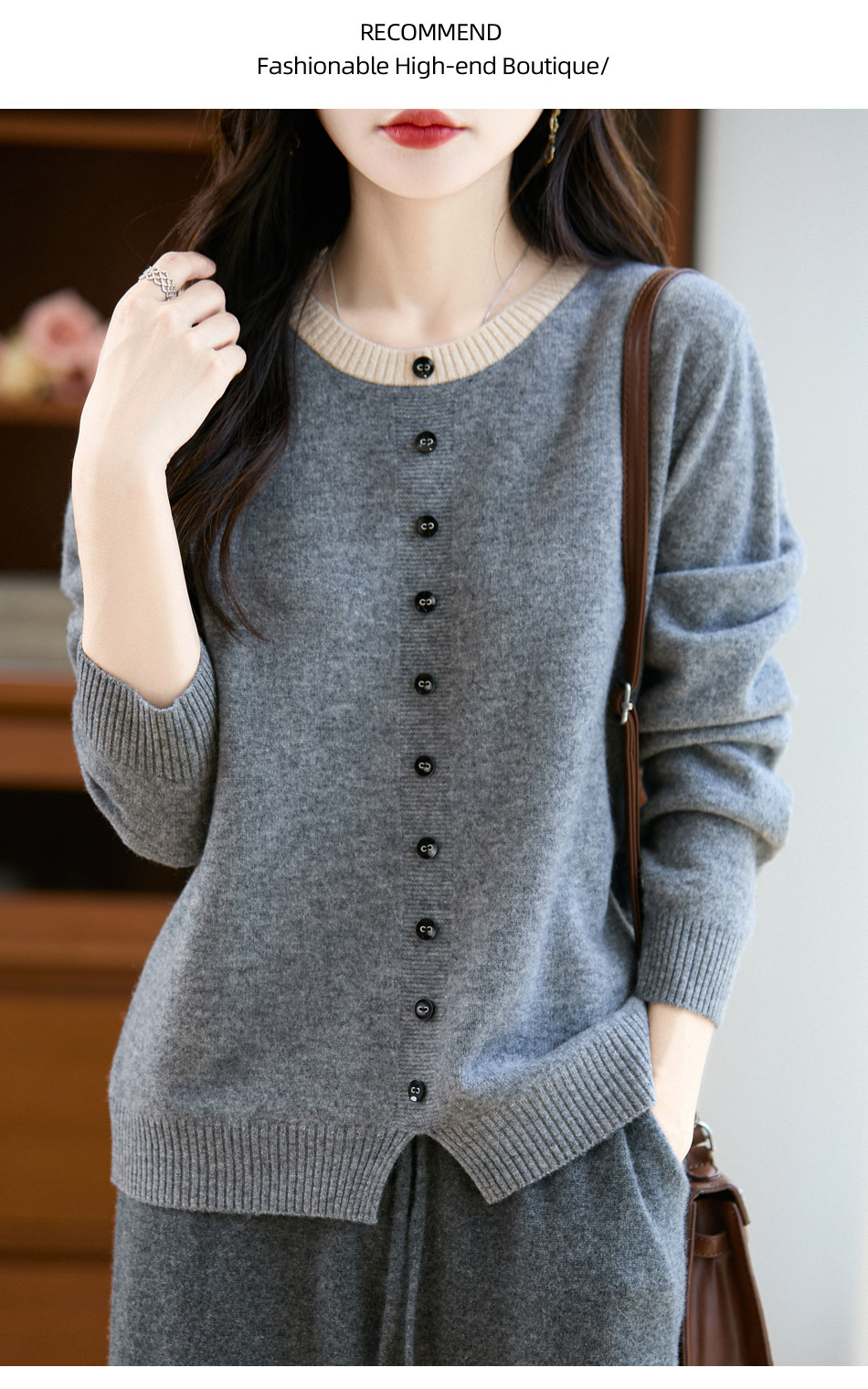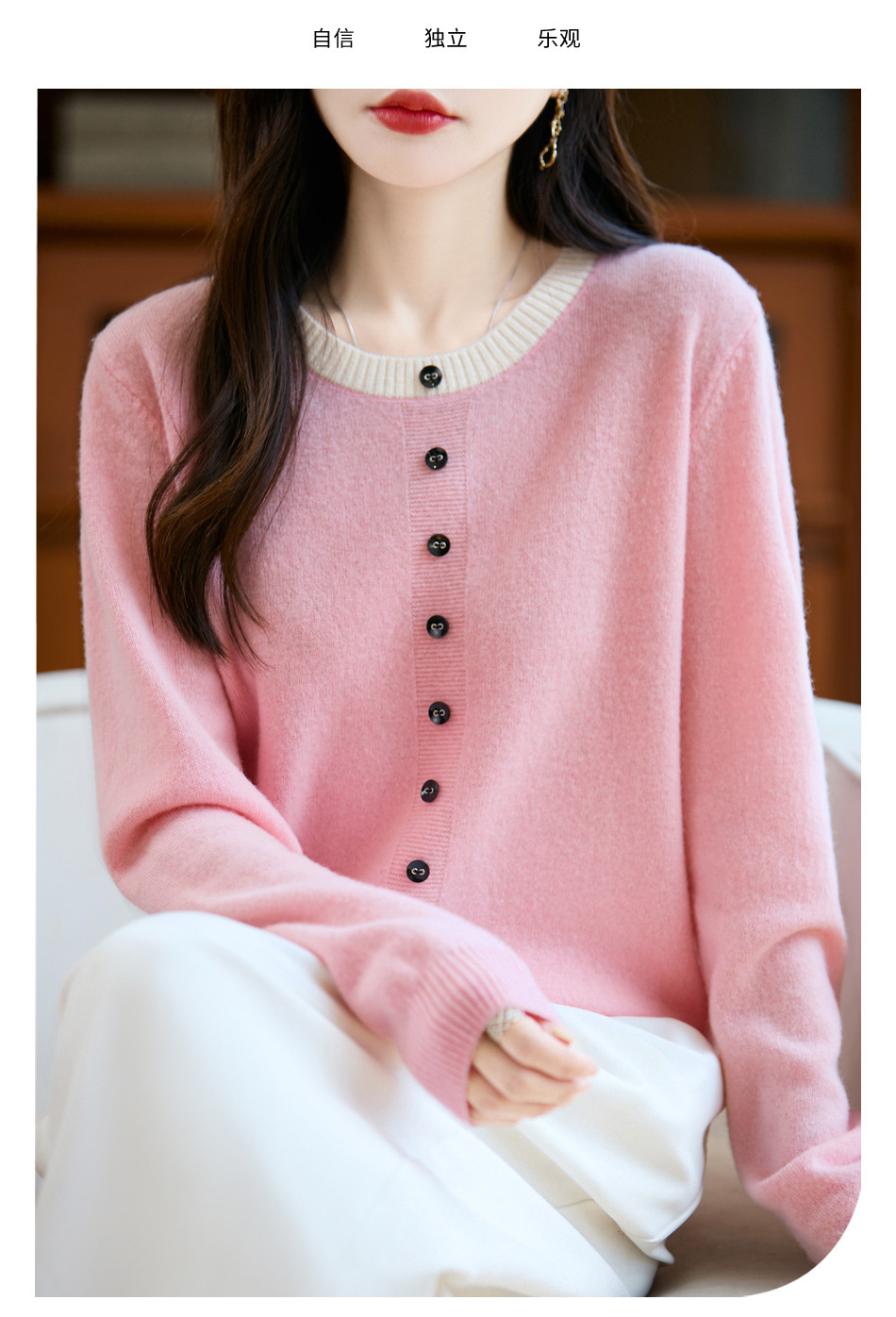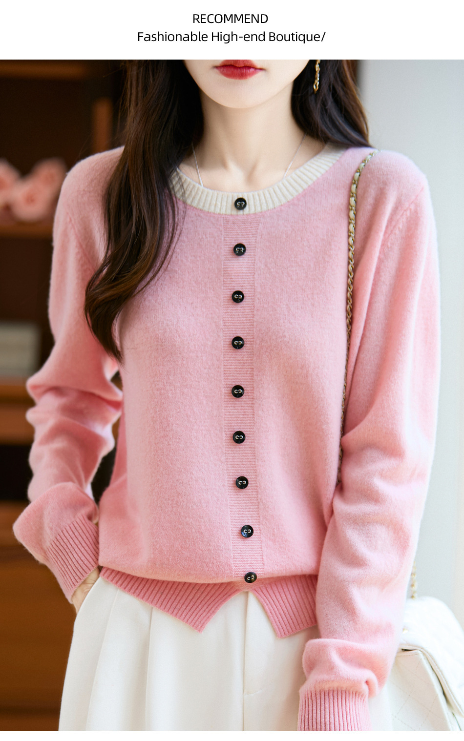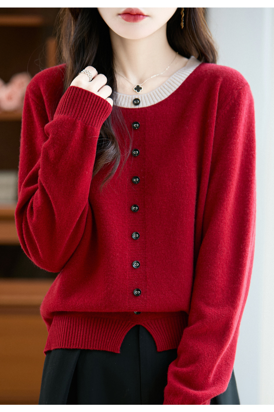100%羊毛2025秋冬新款女式宽松圆领假两件拼色套头打底针织衫毛衣