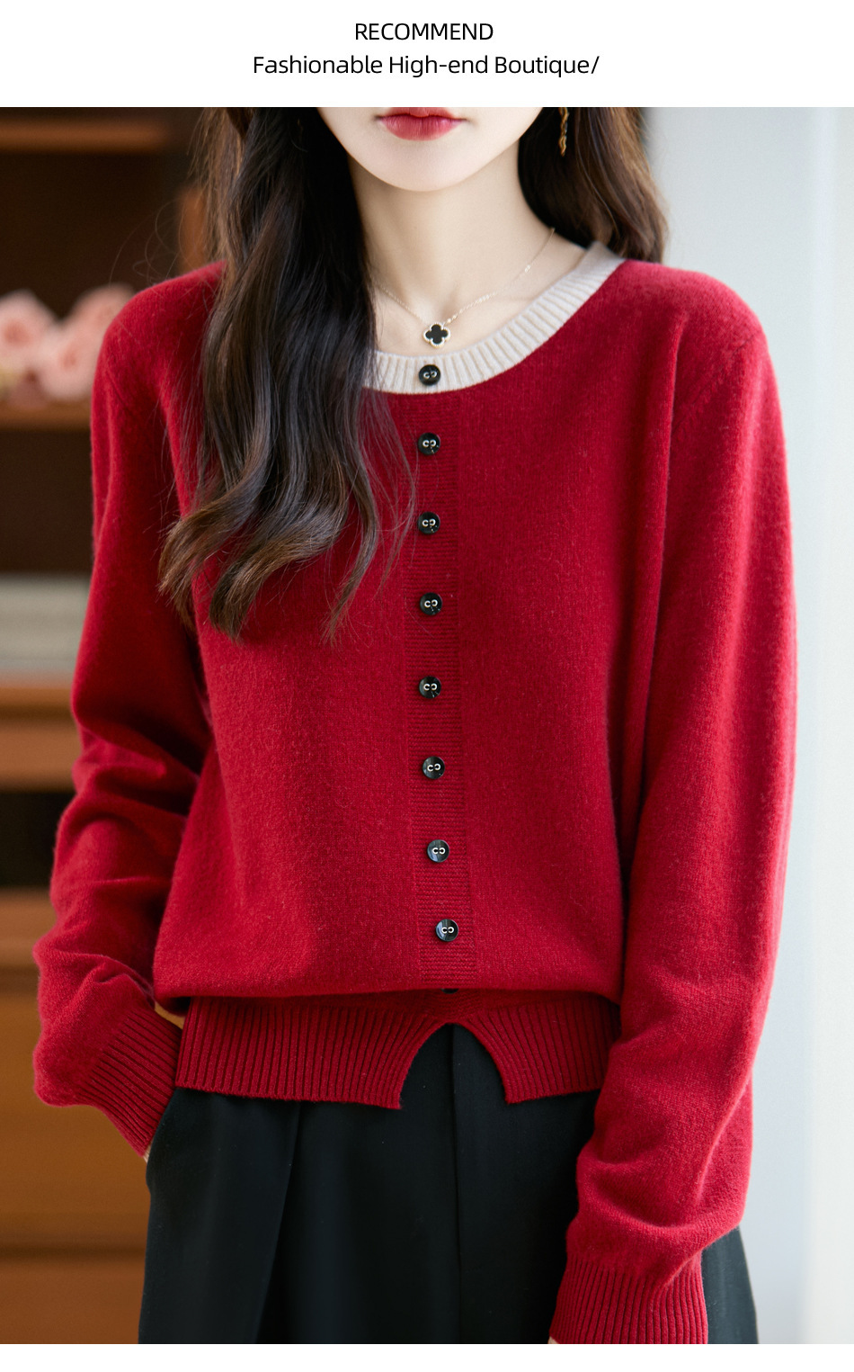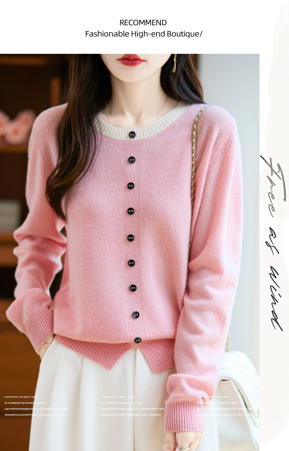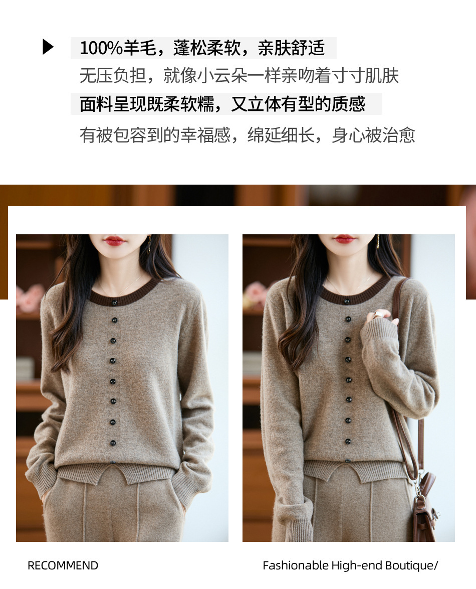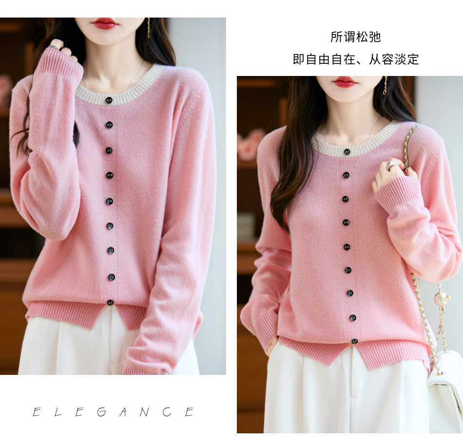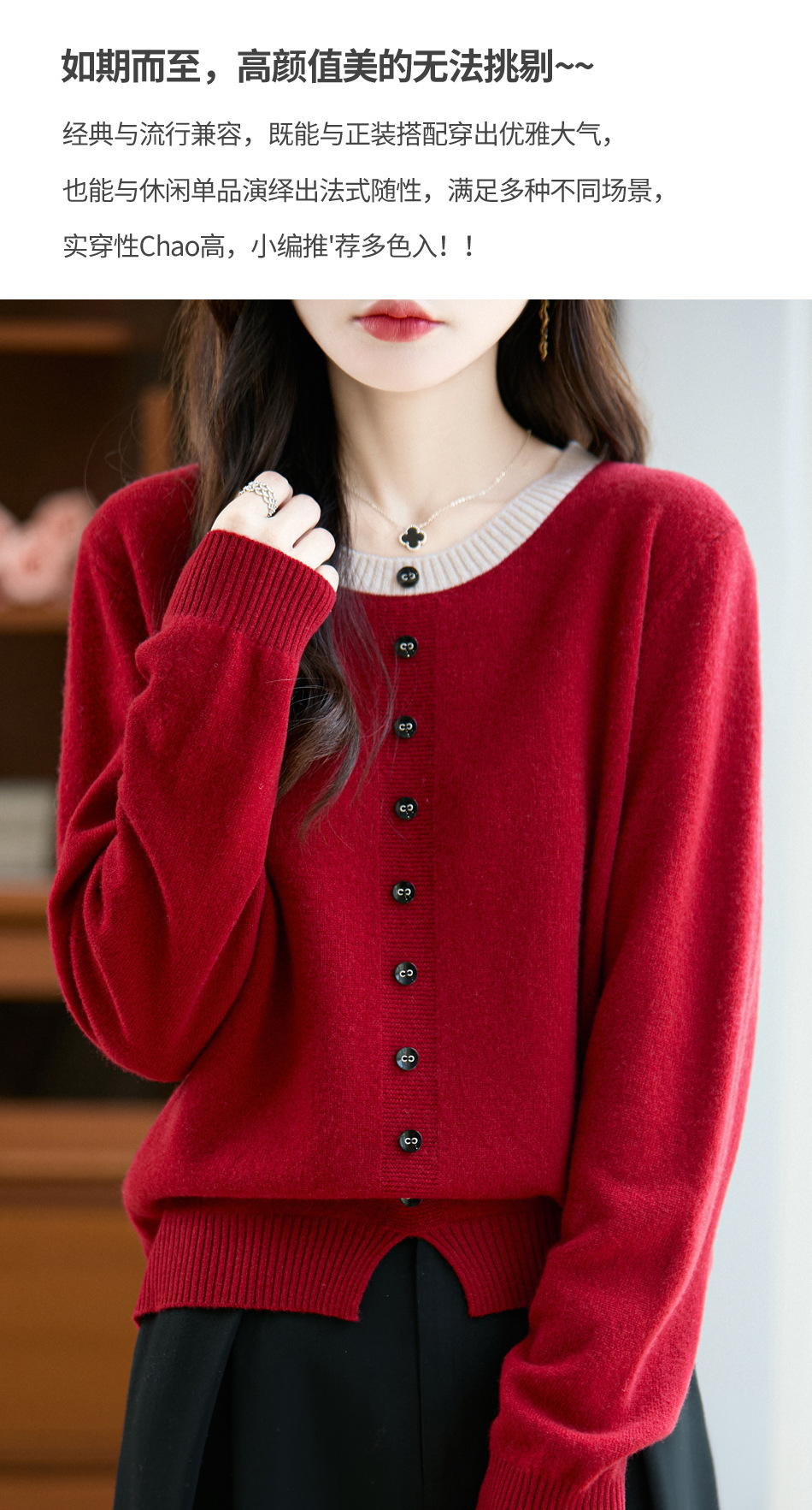 100%羊毛2025秋冬新款女式宽松圆领假两件拼色套头打底针织衫毛衣