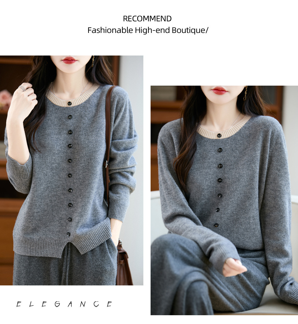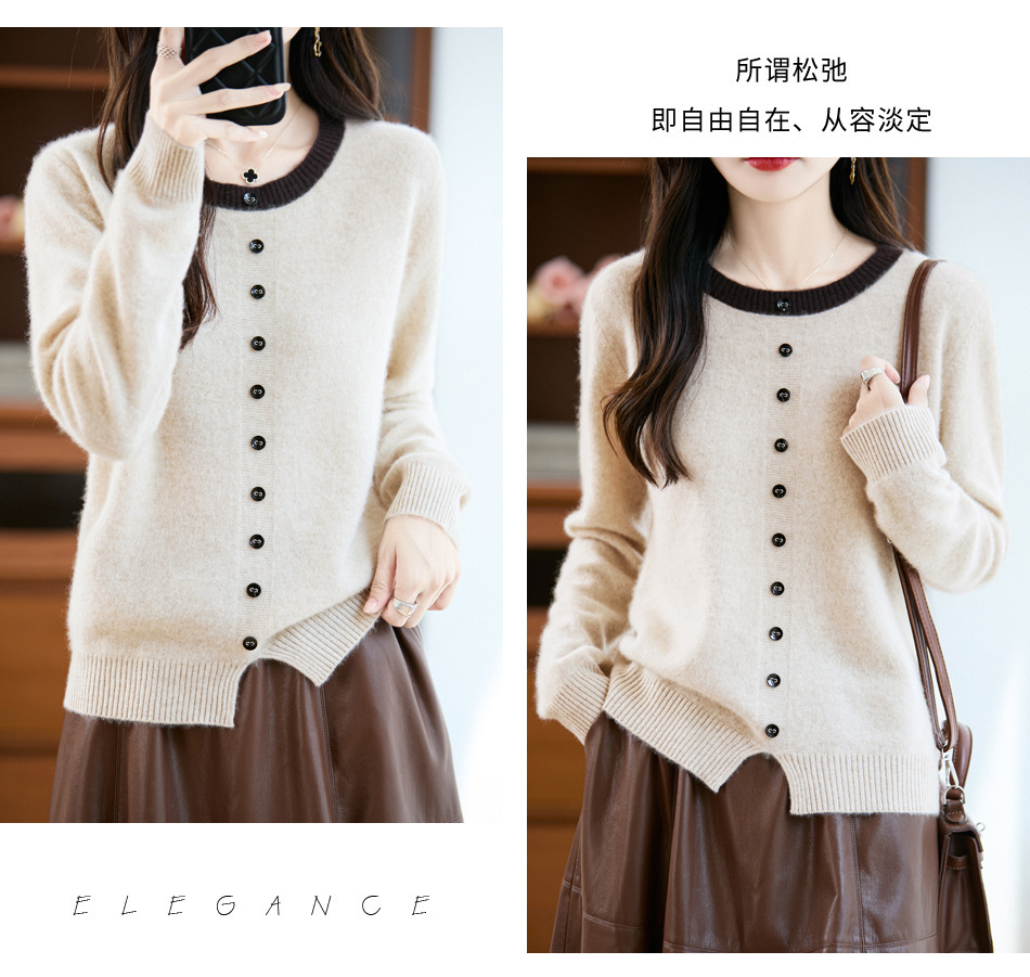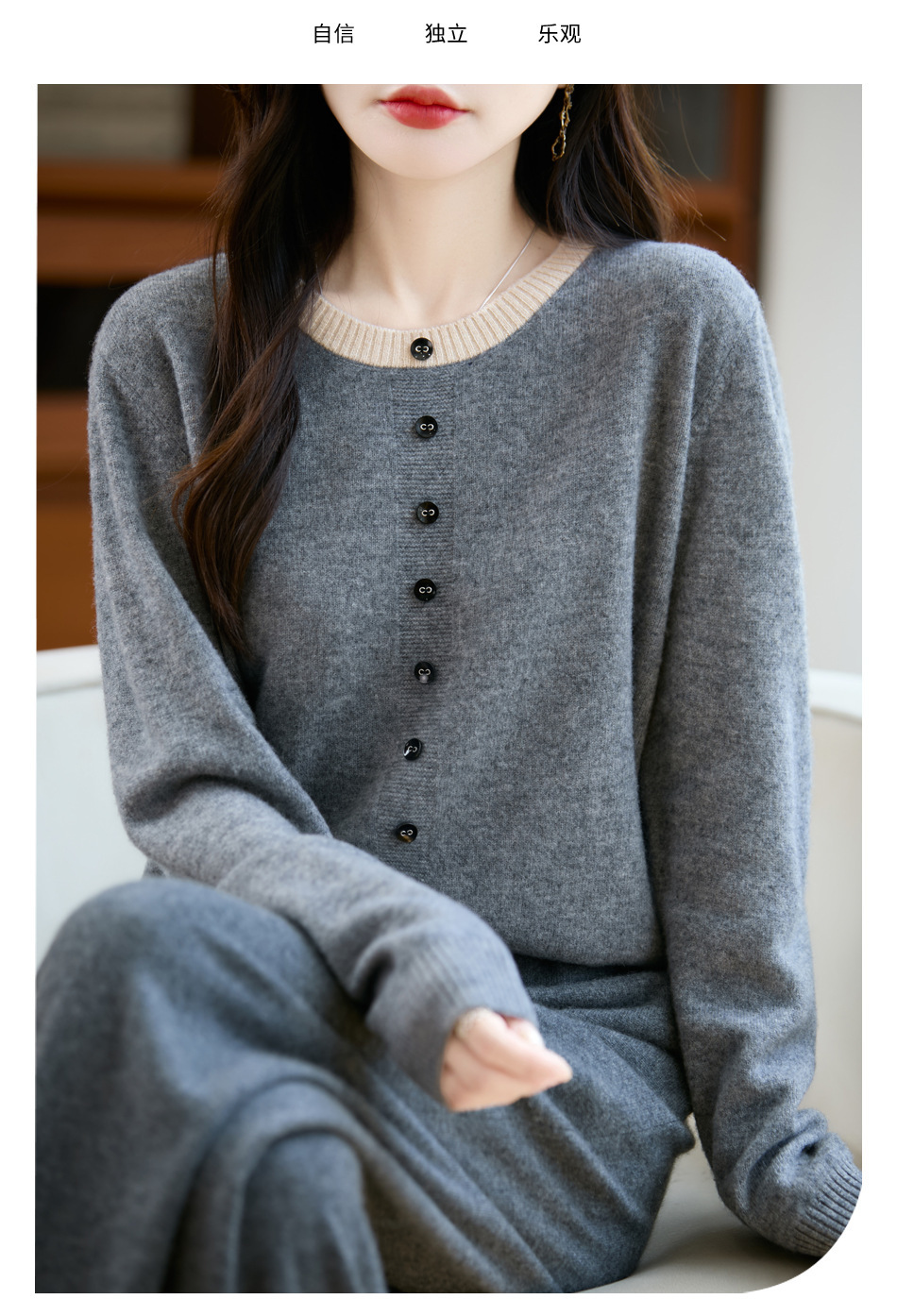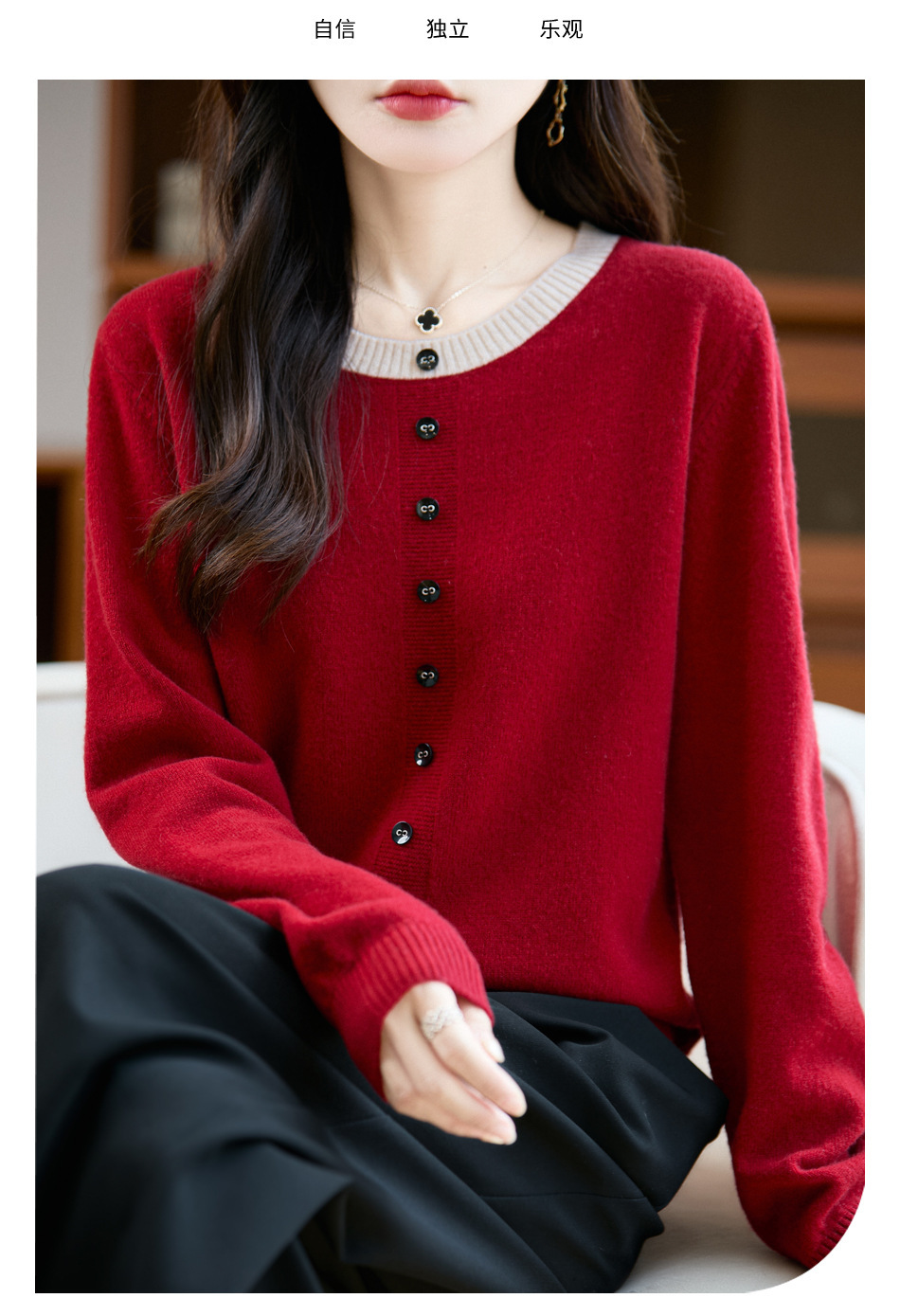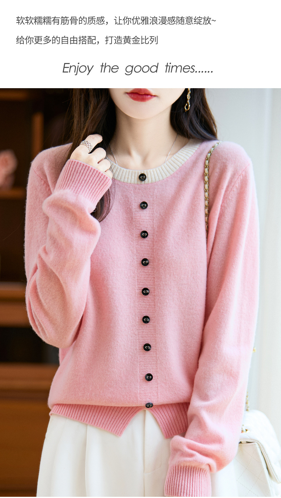 100%羊毛2025秋冬新款女式宽松圆领假两件拼色套头打底针织衫毛衣