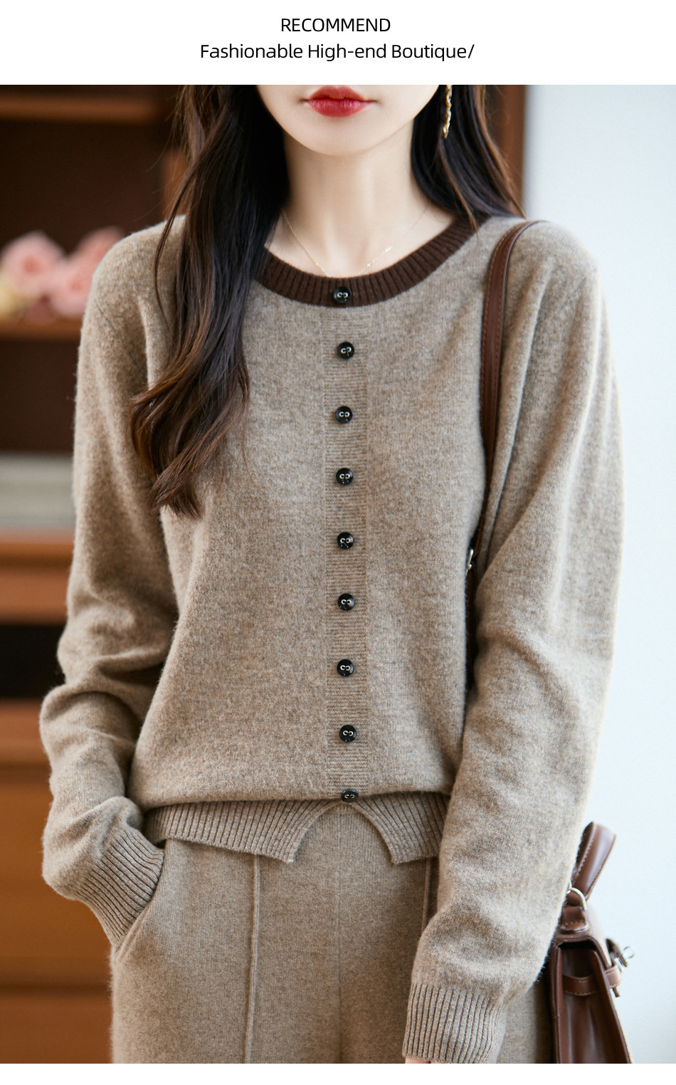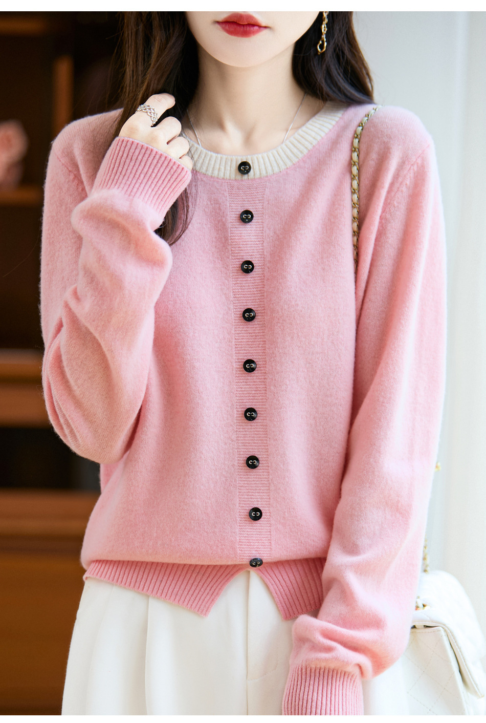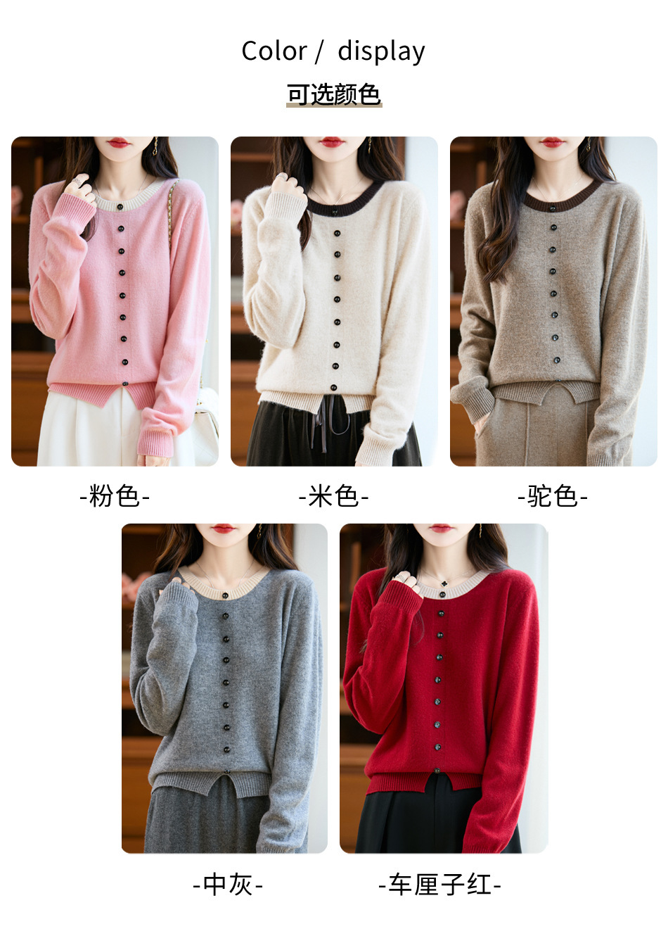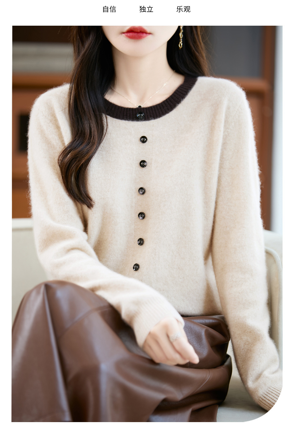 100%羊毛2025秋冬新款女式宽松圆领假两件拼色套头打底针织衫毛衣