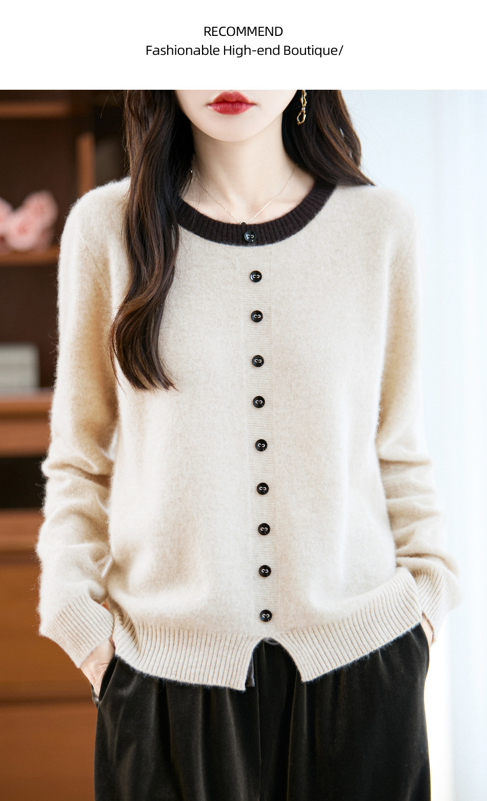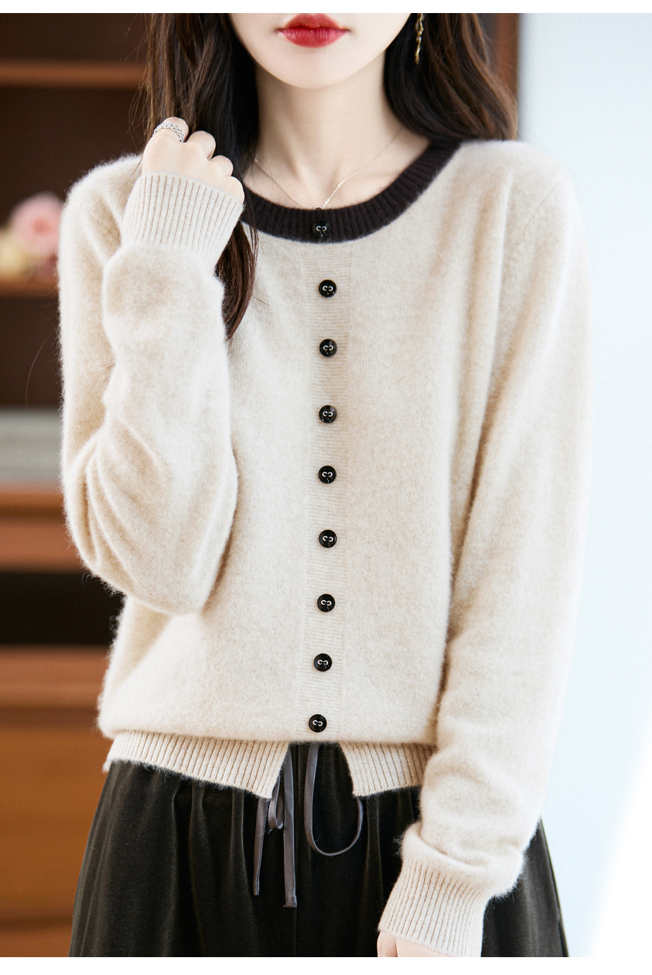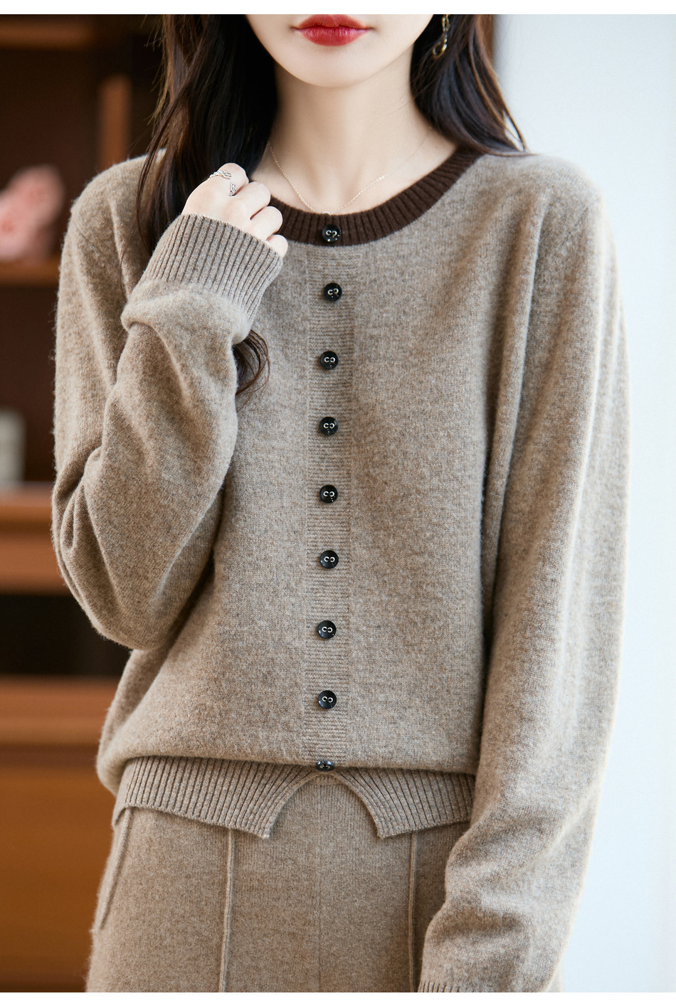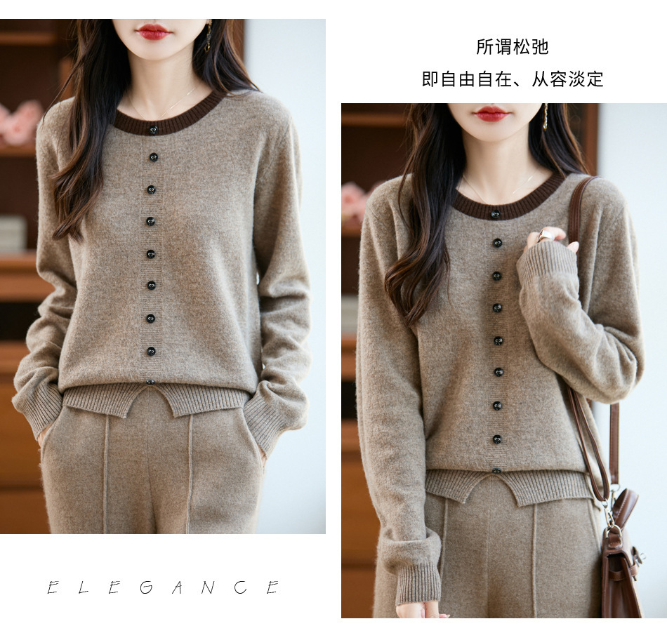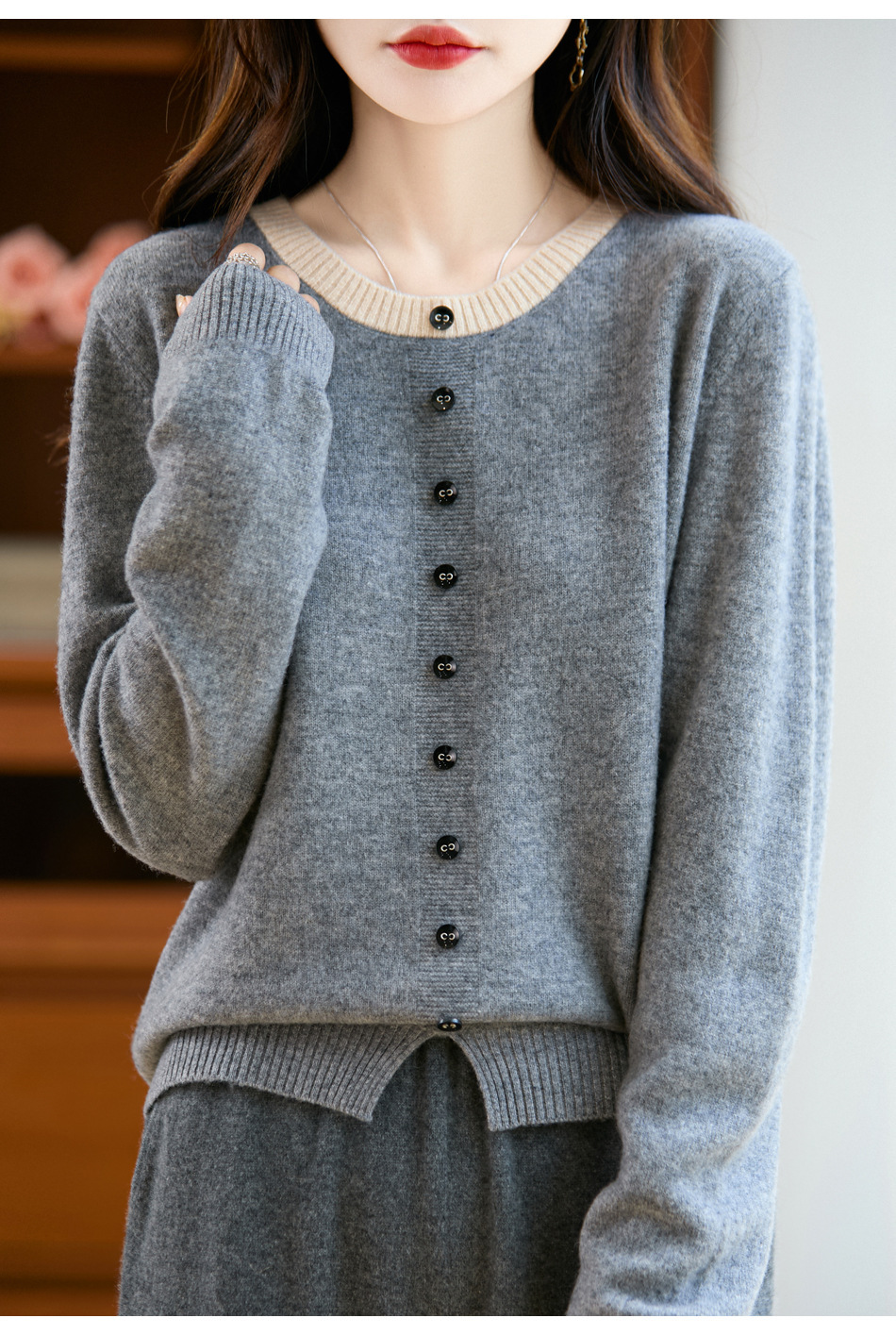 100%羊毛2025秋冬新款女式宽松圆领假两件拼色套头打底针织衫毛衣