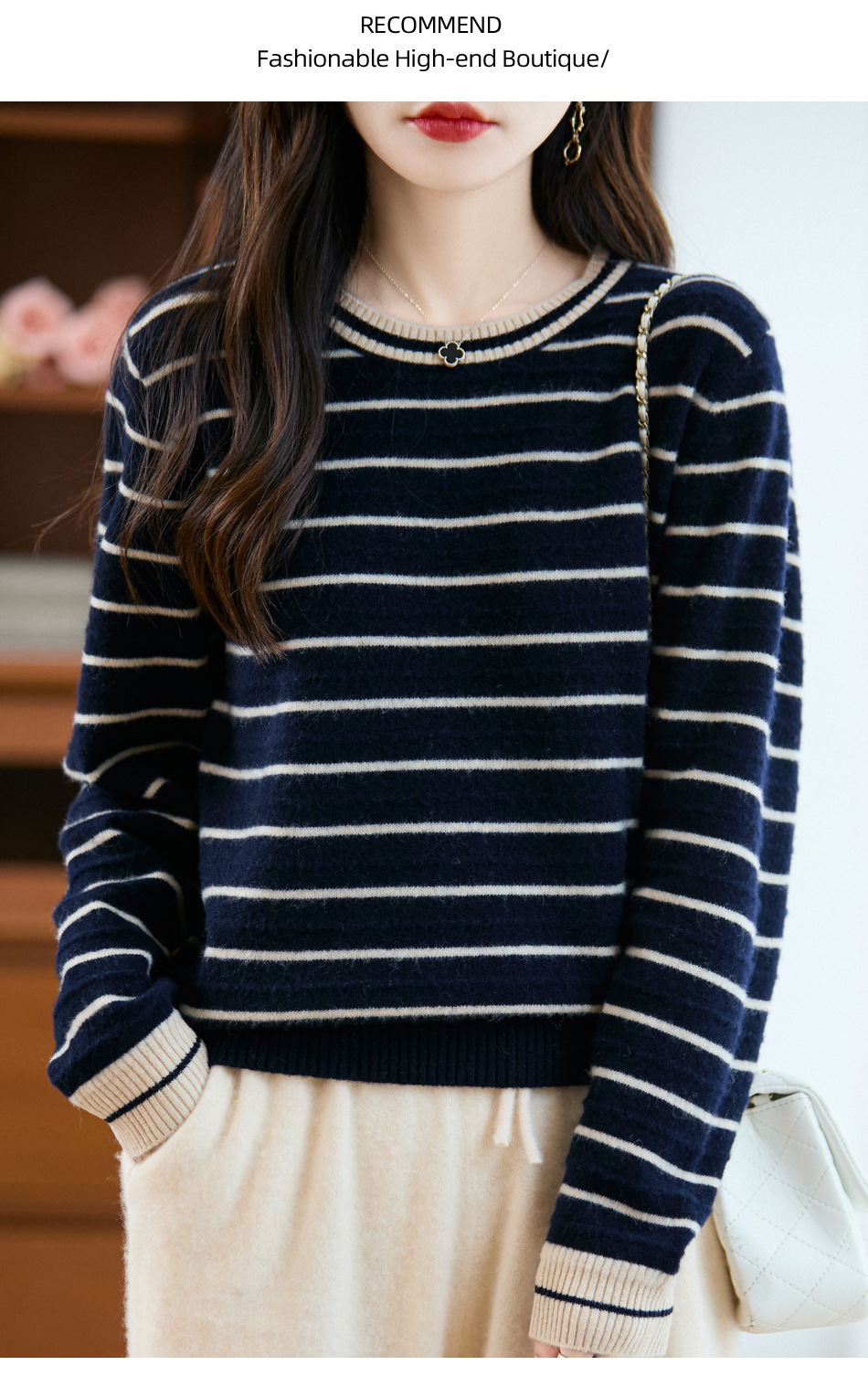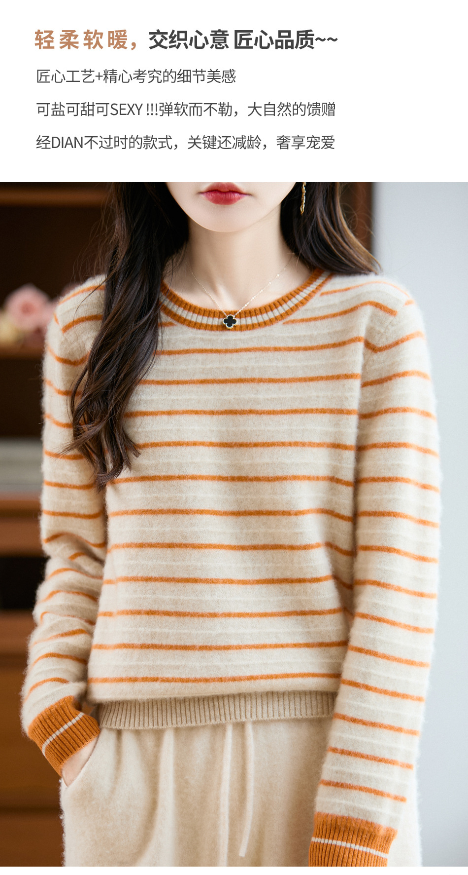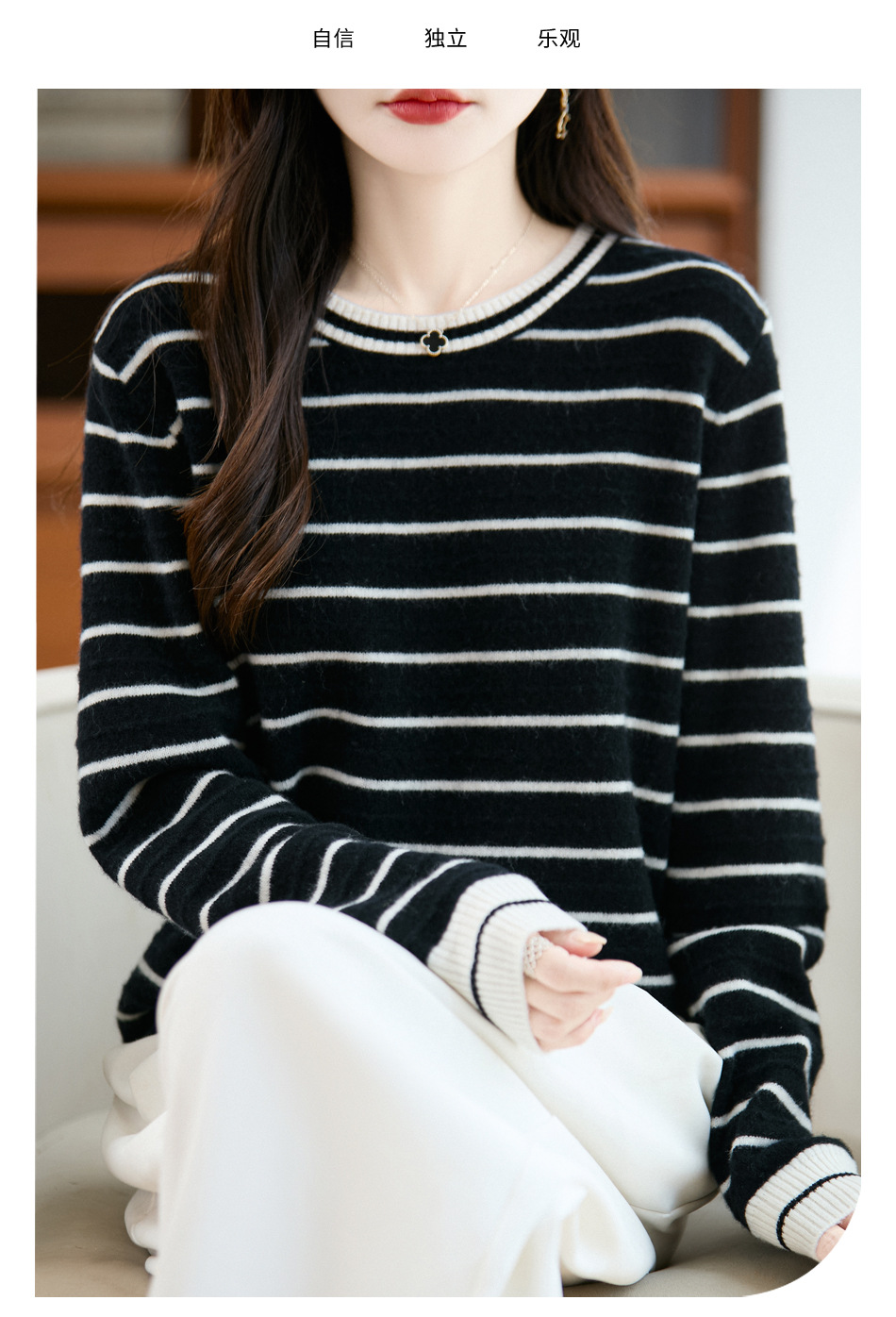 100%纯羊毛2025秋冬新款女式宽松圆领拼色短款上衣打底针织衫毛衣