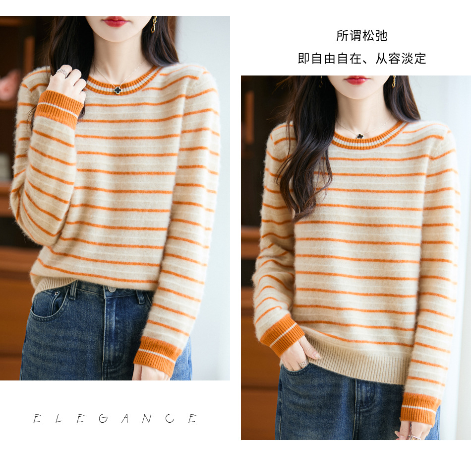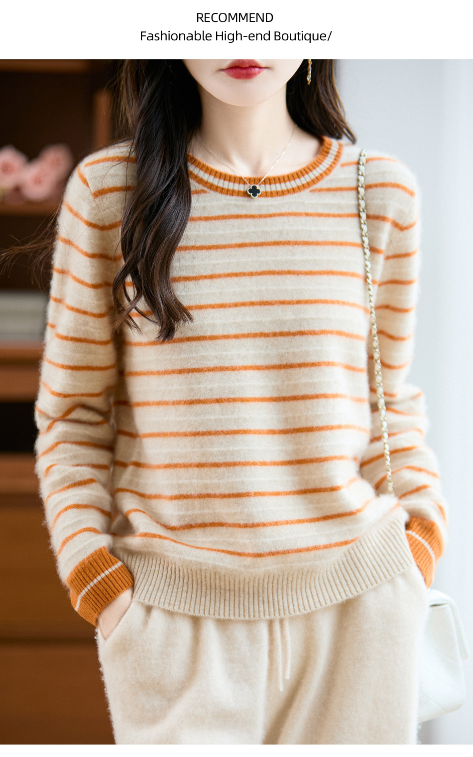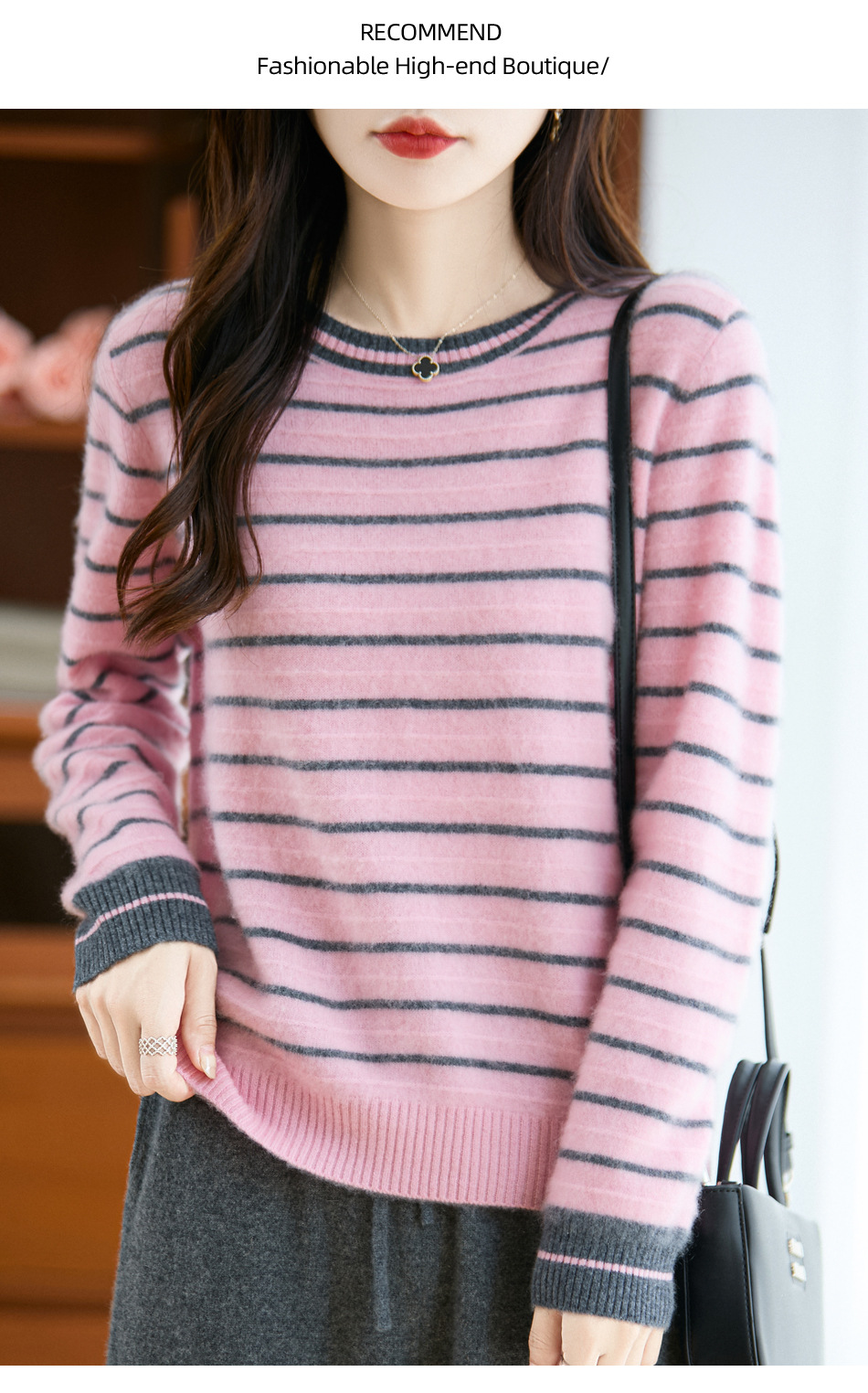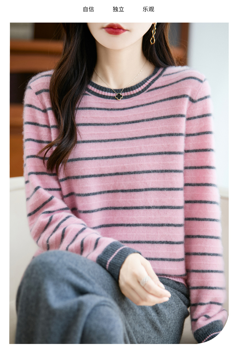100%纯羊毛2025秋冬新款女式宽松圆领拼色短款上衣打底针织衫毛衣