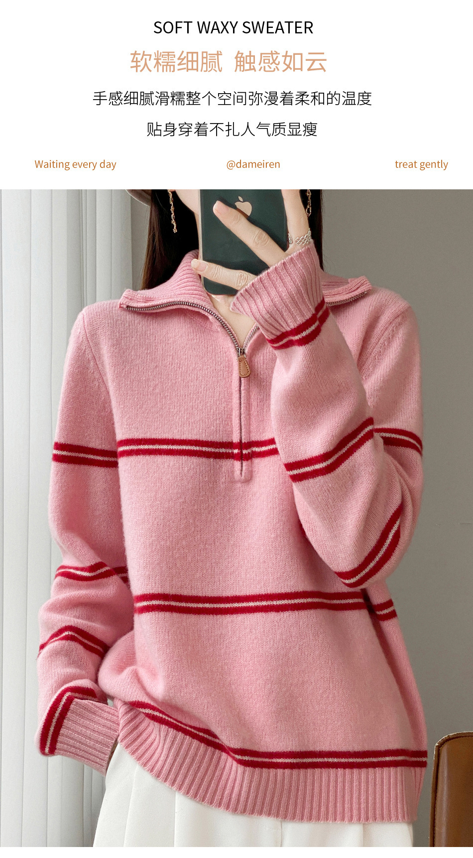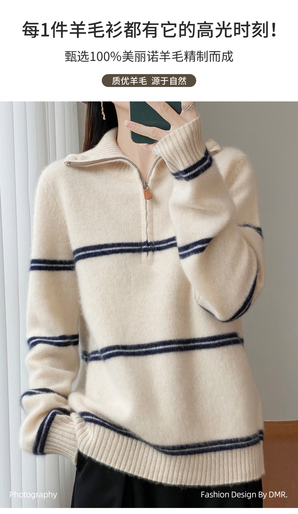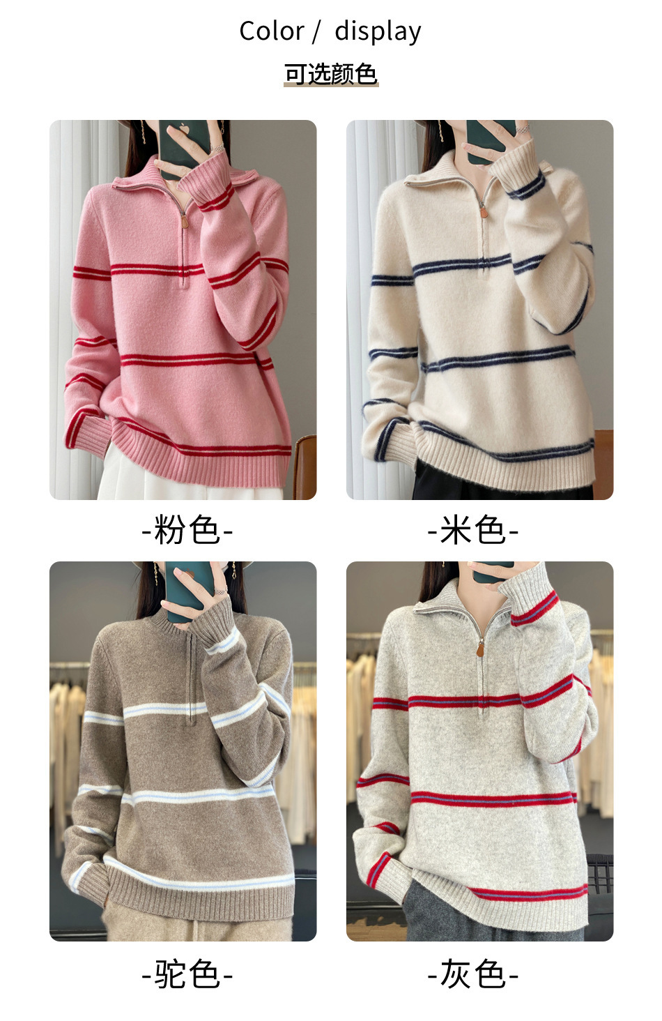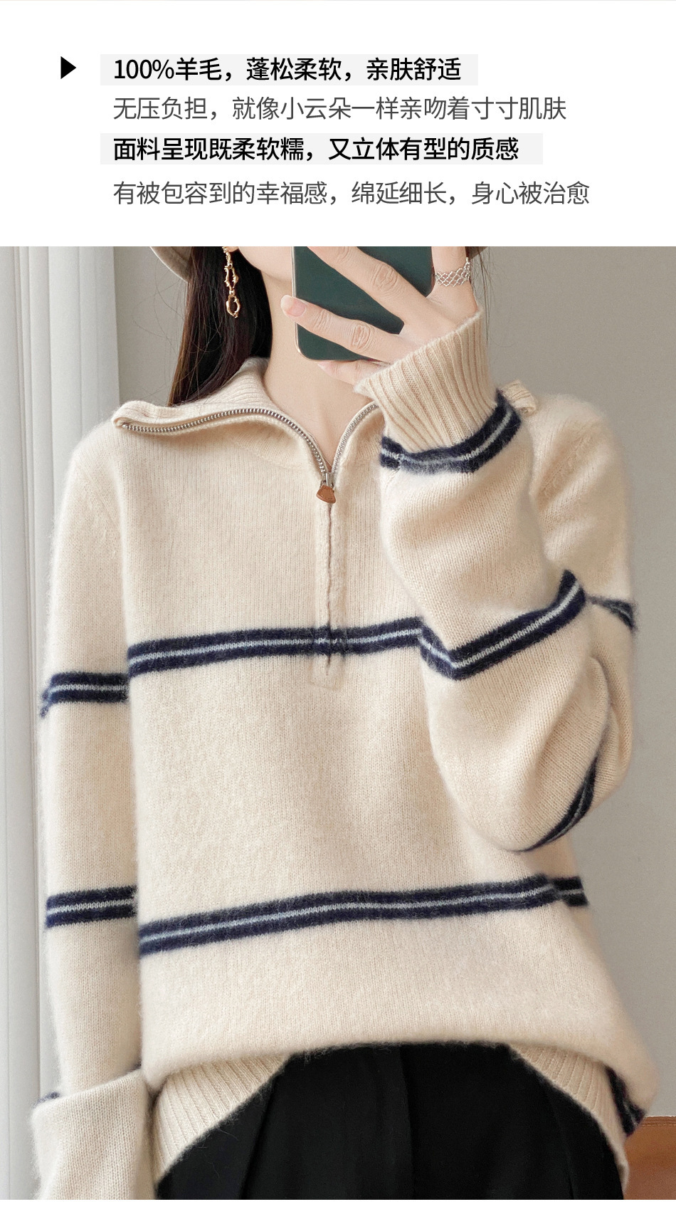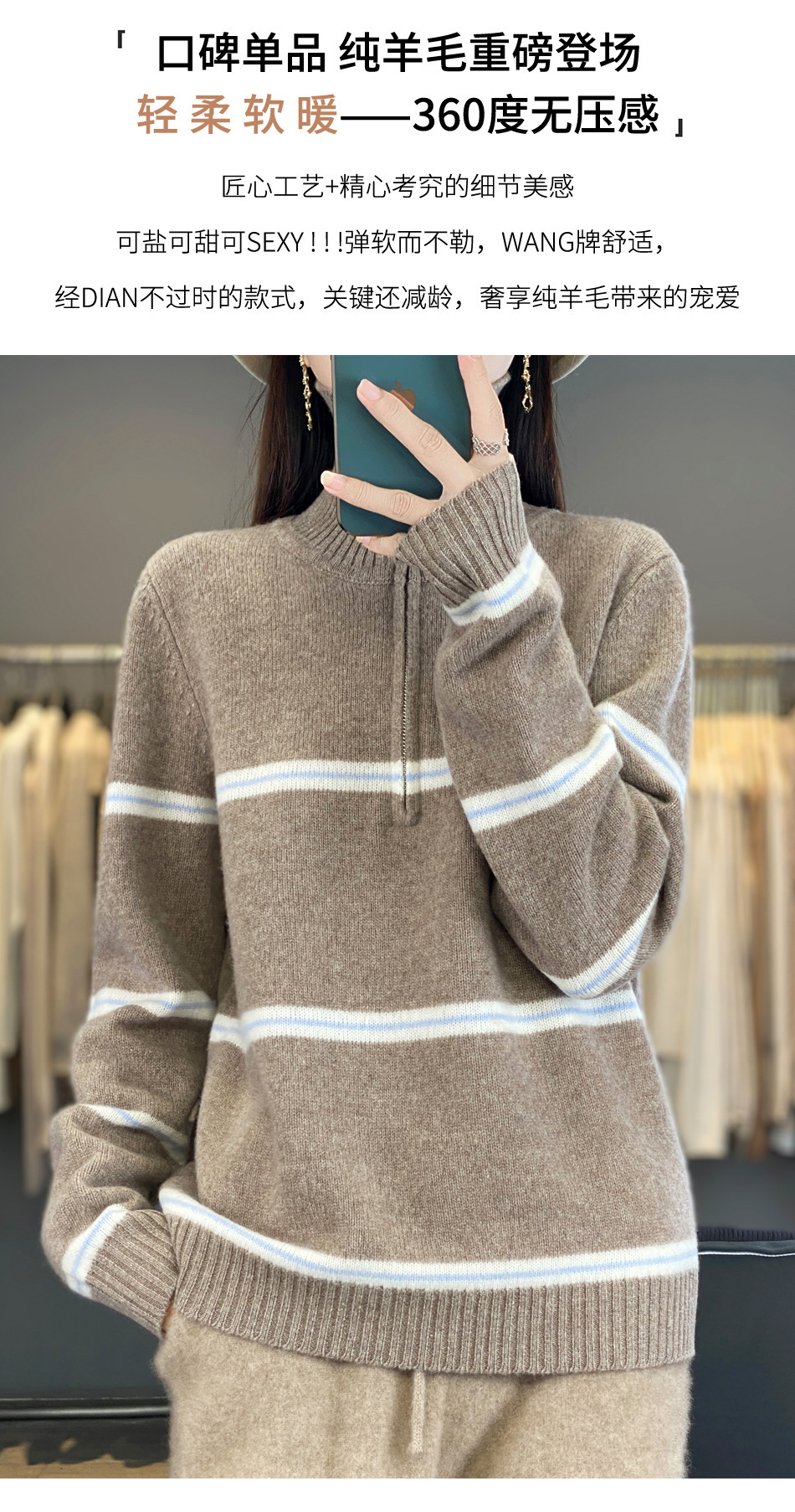 100%纯羊毛2025秋冬新款女式宽松Polo领半拉链套头卫衣针织衫毛衣