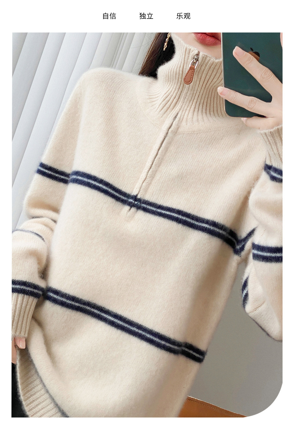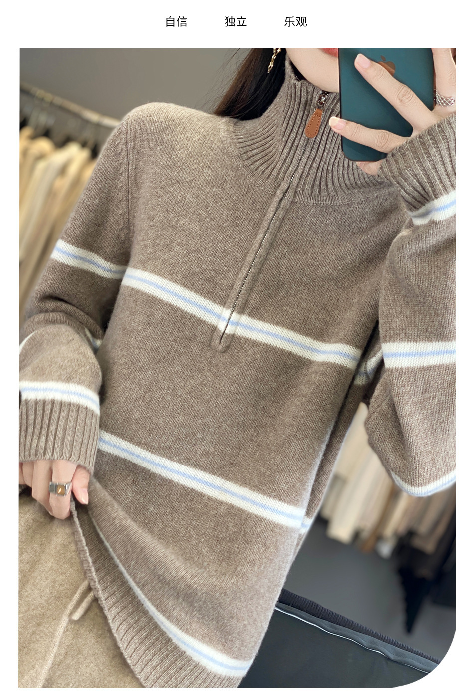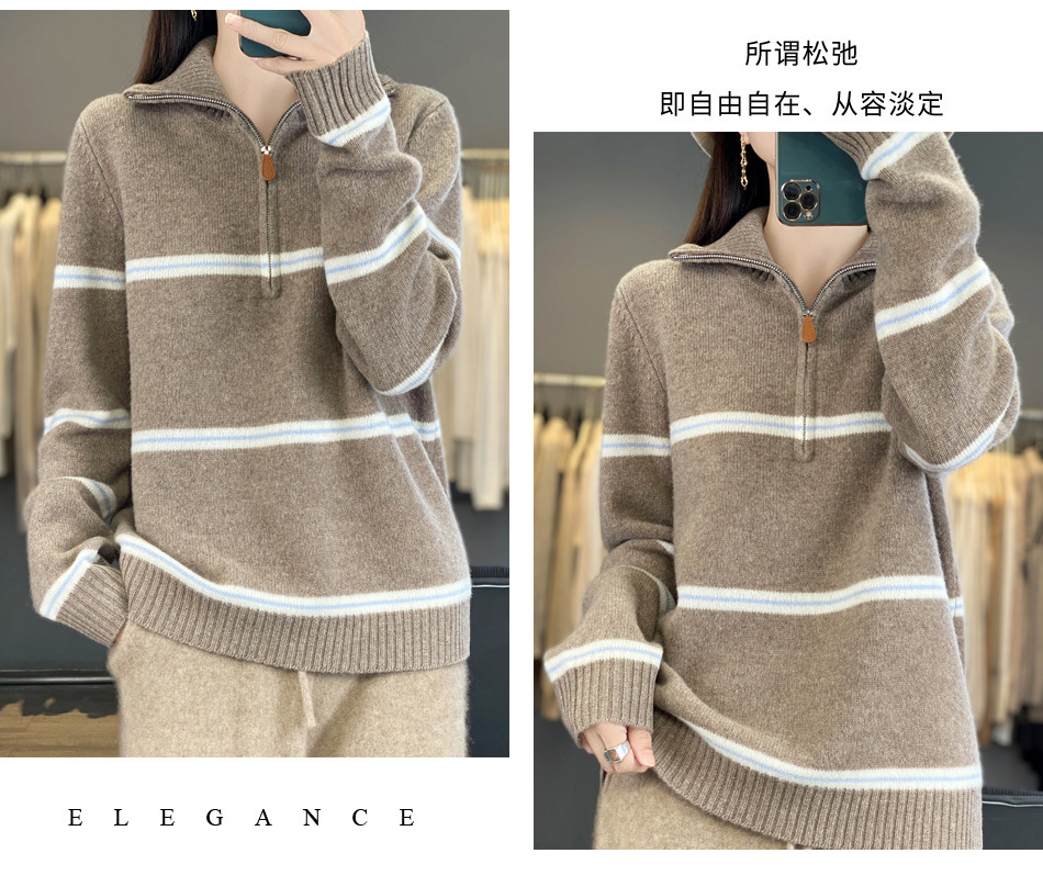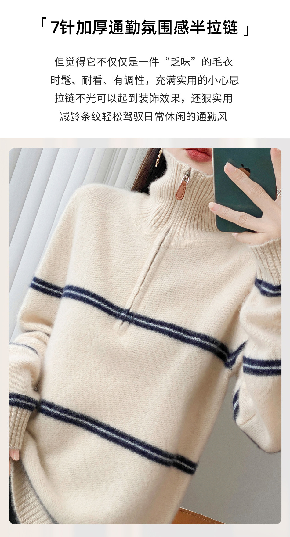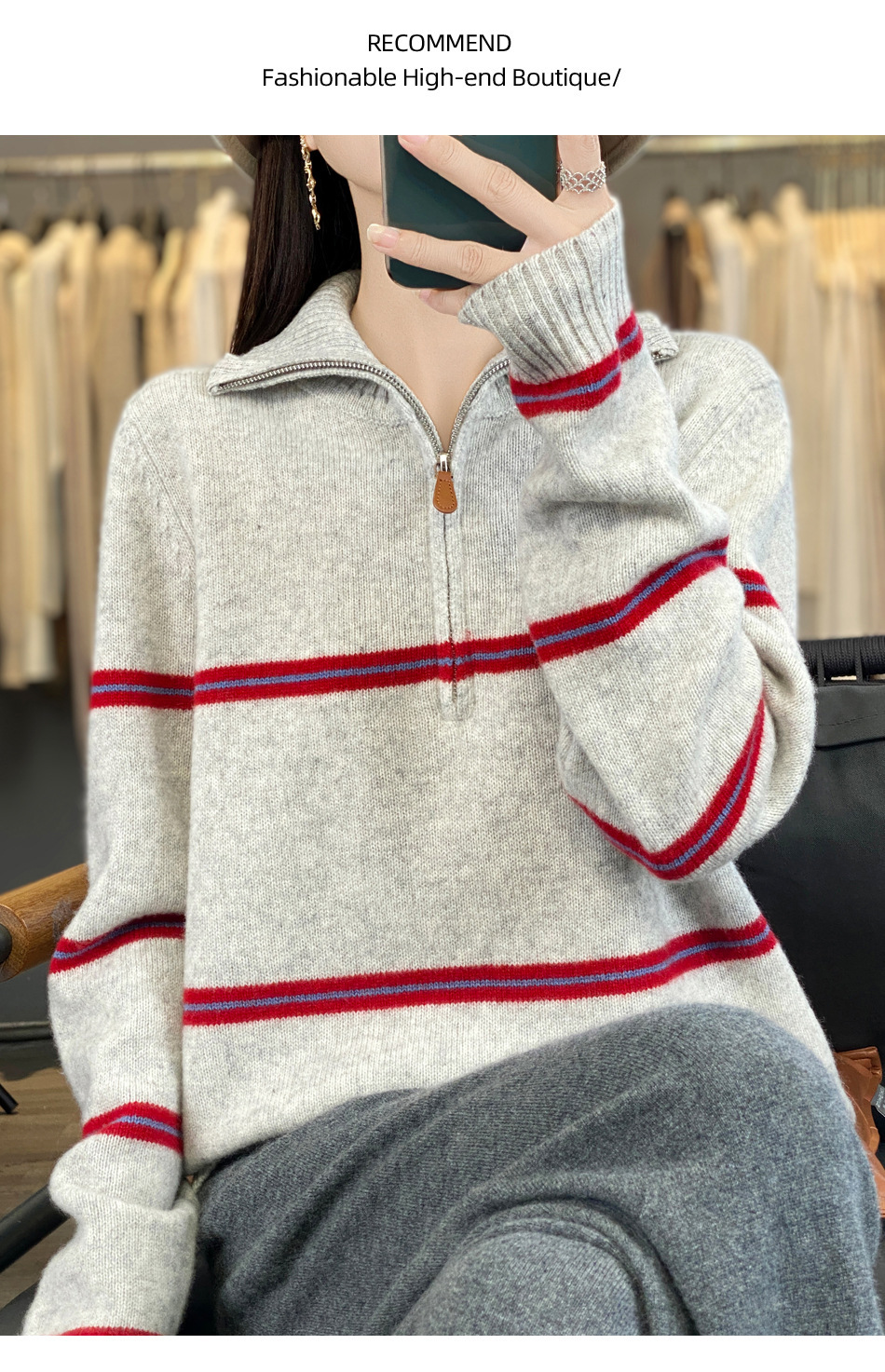 100%纯羊毛2025秋冬新款女式宽松Polo领半拉链套头卫衣针织衫毛衣