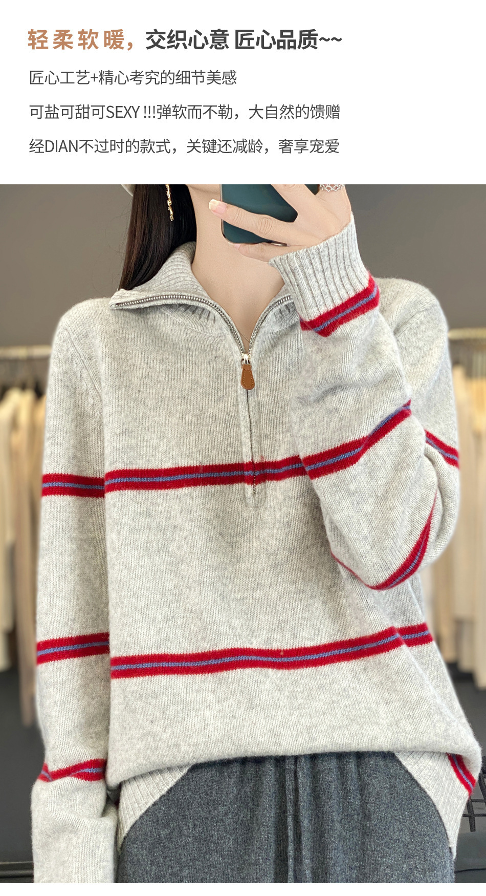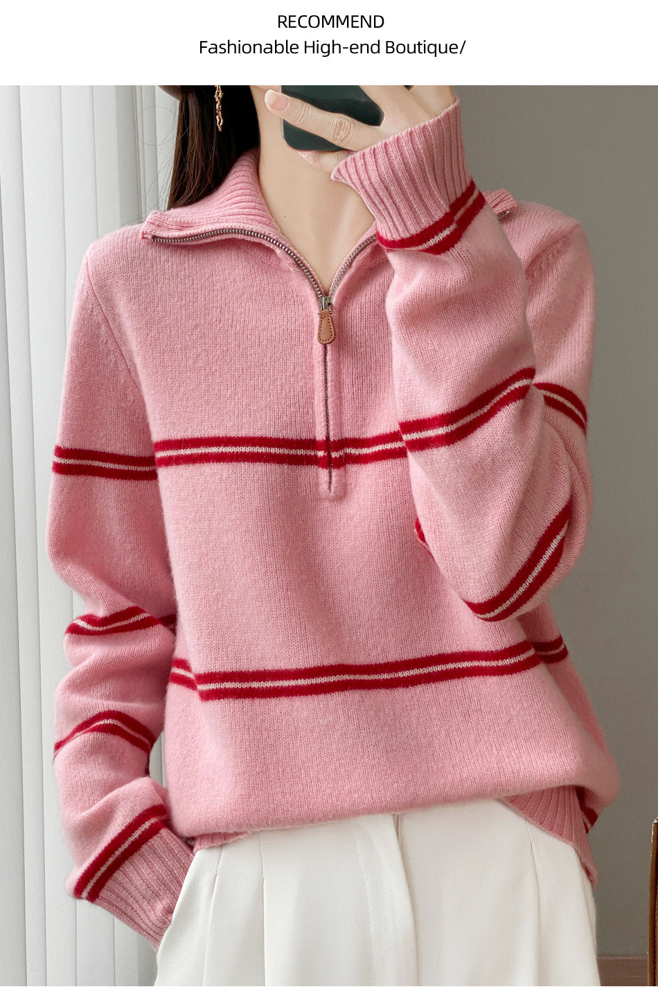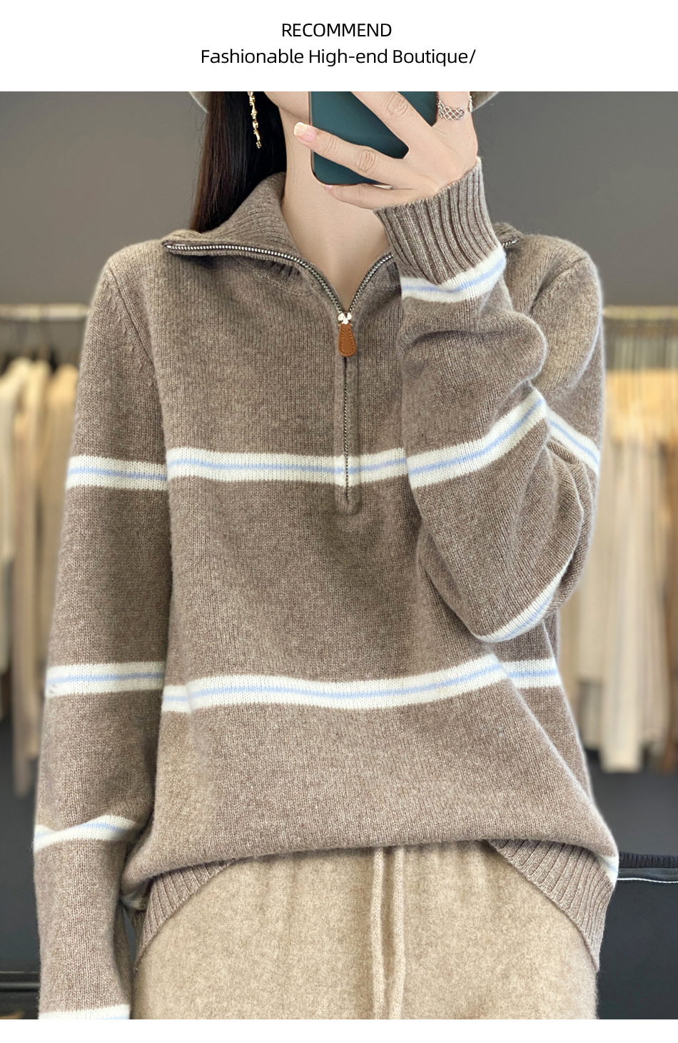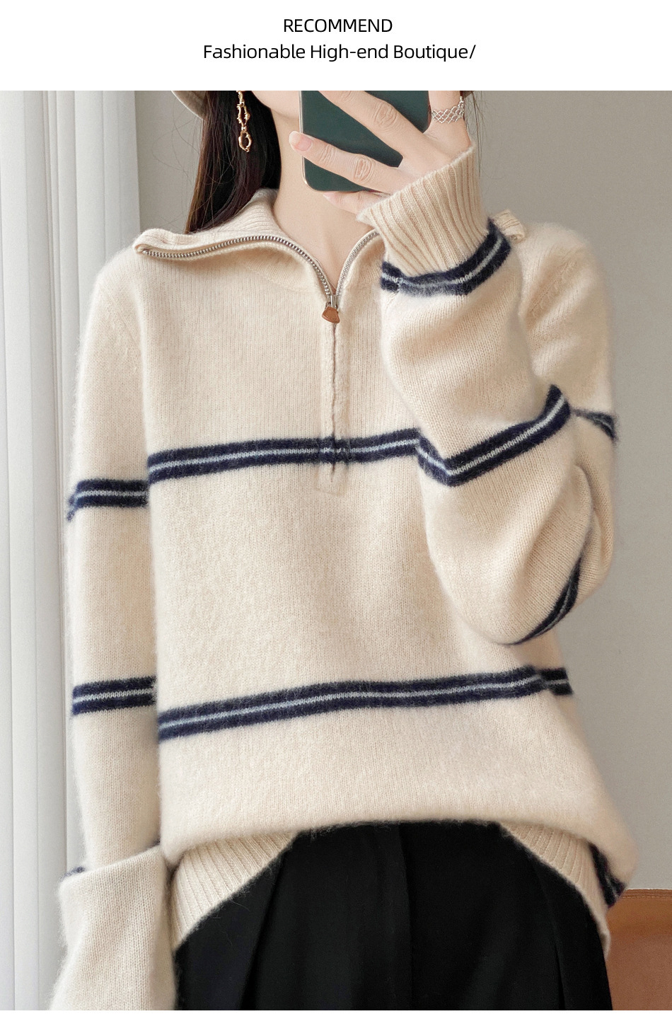 100%纯羊毛2025秋冬新款女式宽松Polo领半拉链套头卫衣针织衫毛衣
