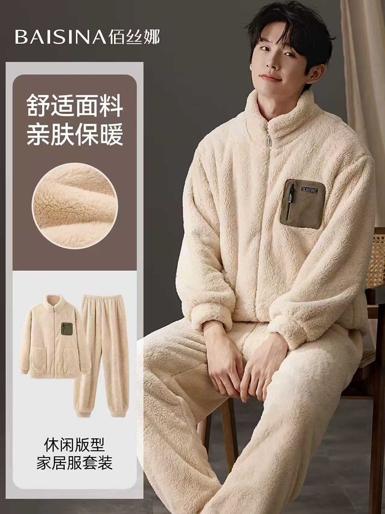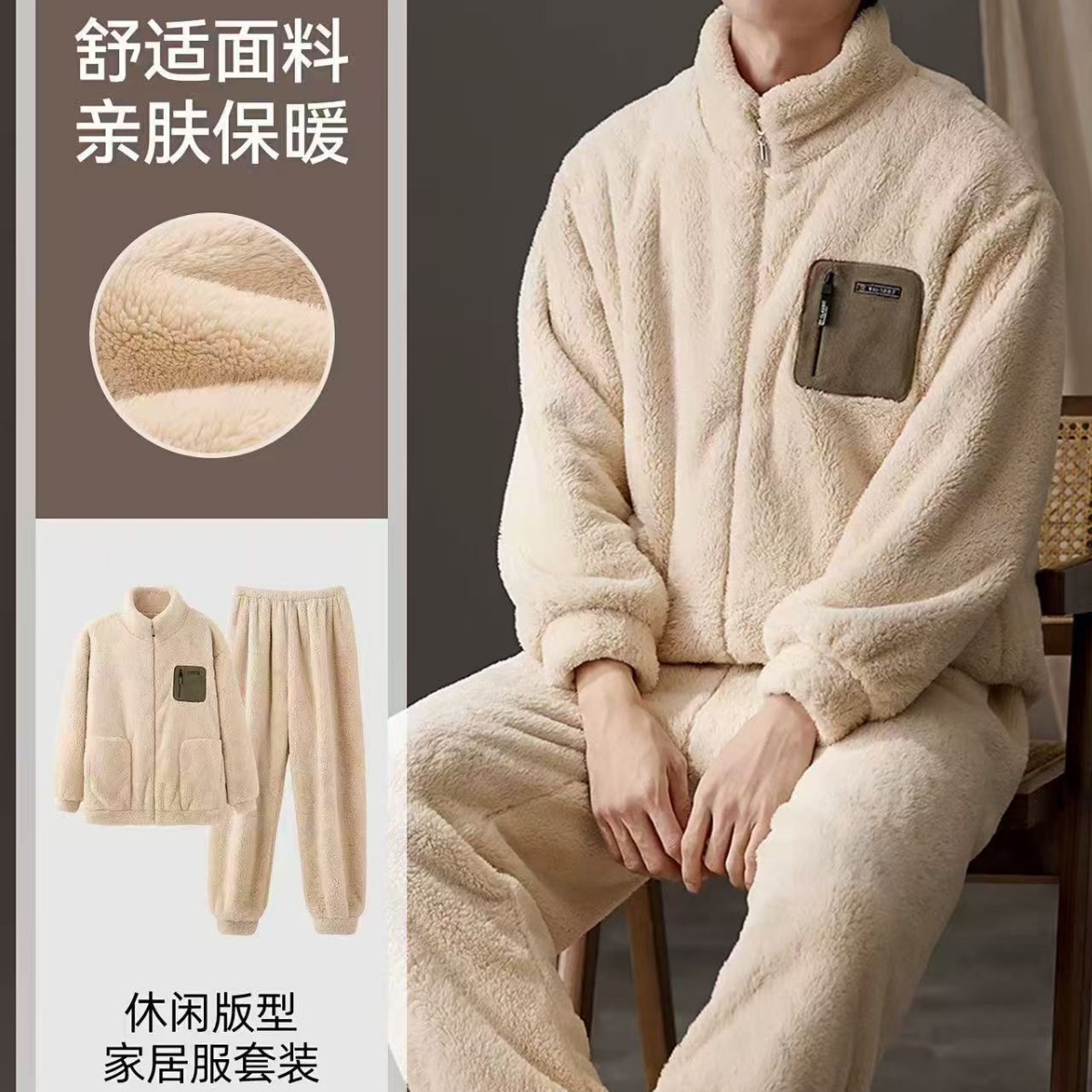 新款保暖珊瑚绒情侣套装睡衣冬季加大码加绒加厚套装家居服