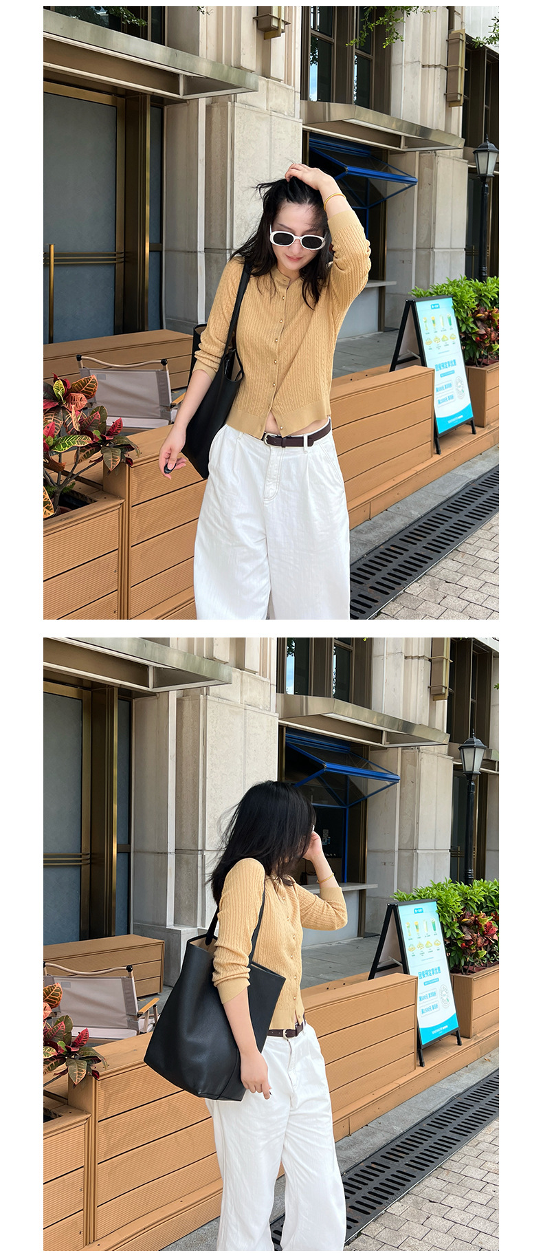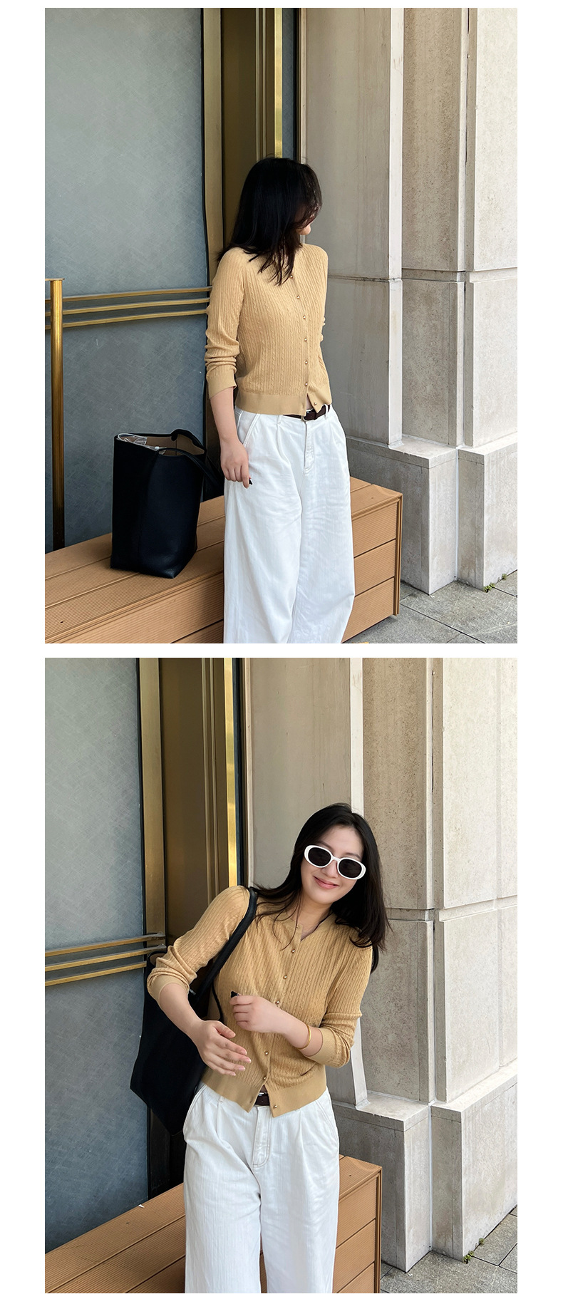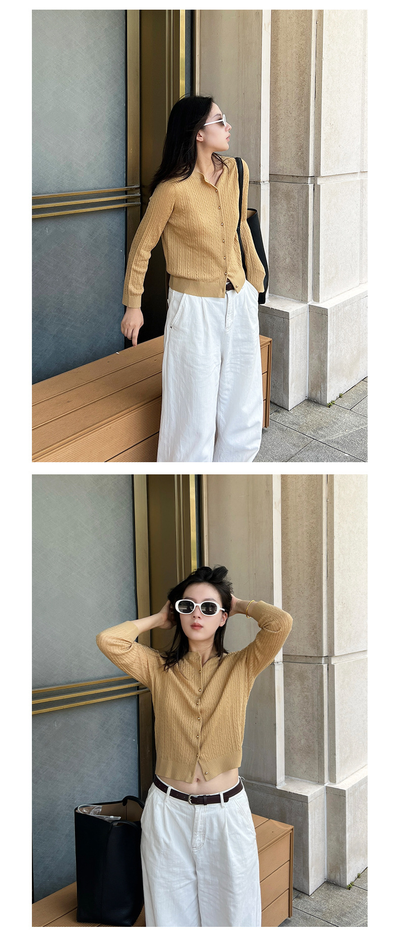2025新款早秋纯羊毛圆领开衫绞花中袖针织衫舒适通勤修身上衣女