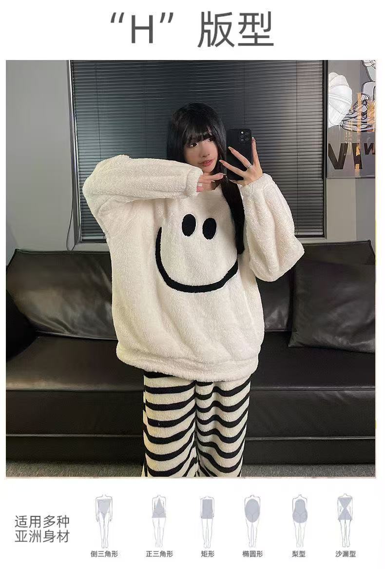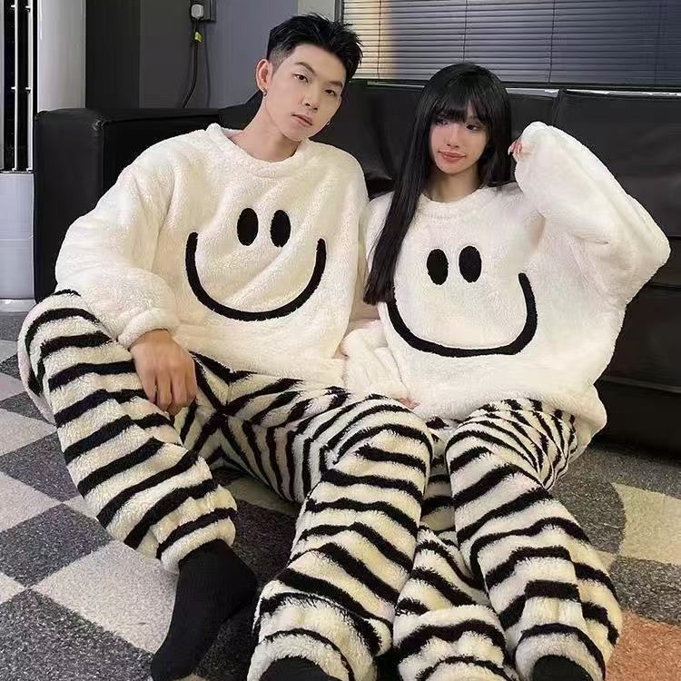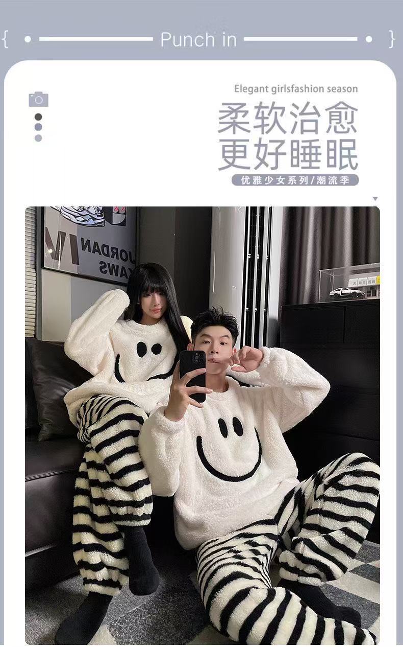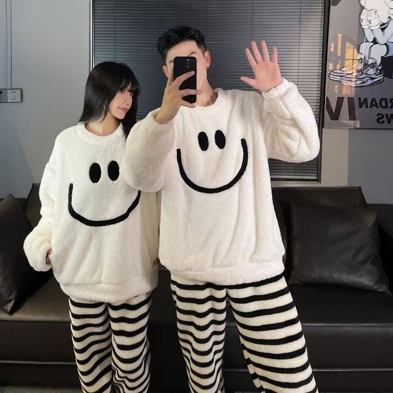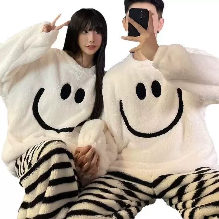 秋冬珊瑚绒笑脸睡衣套装加厚加绒情侣法兰绒套头家居服男女同款