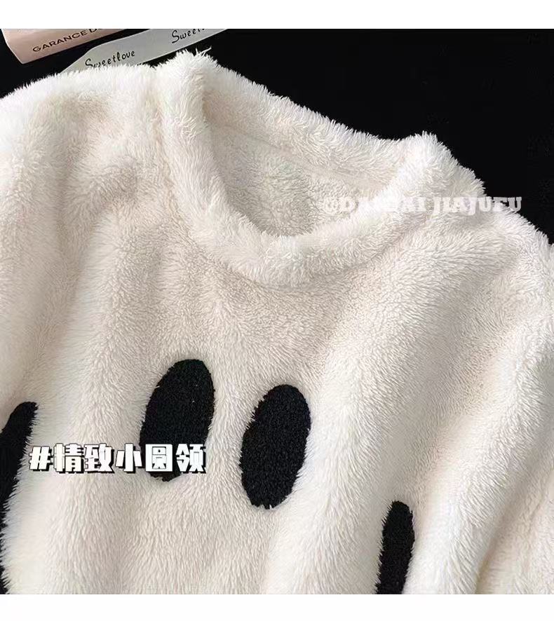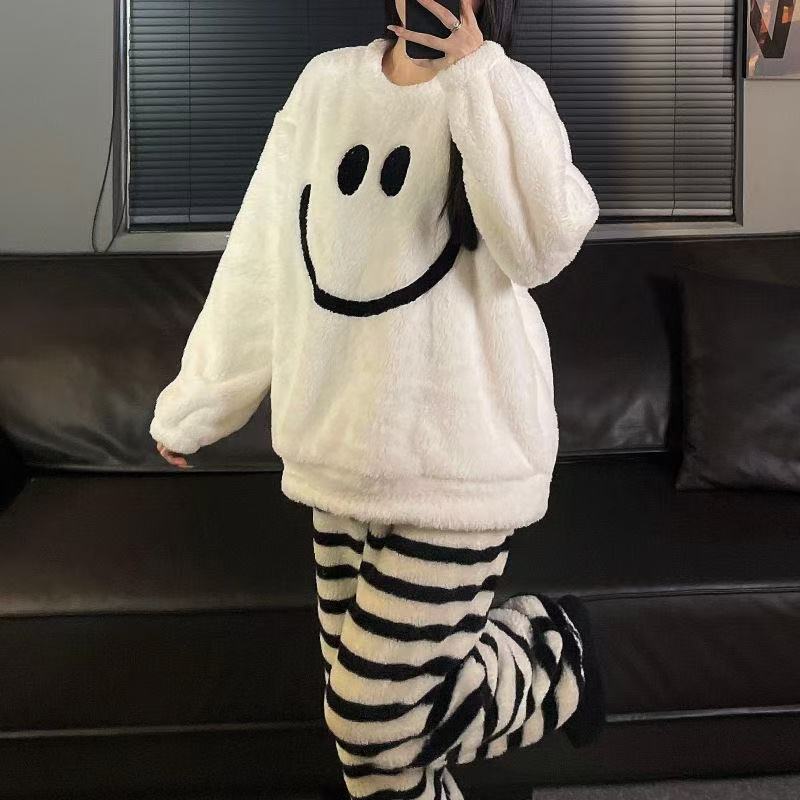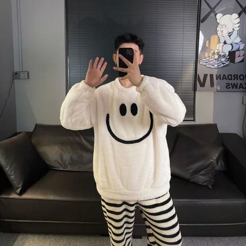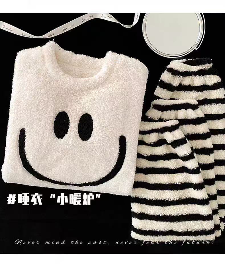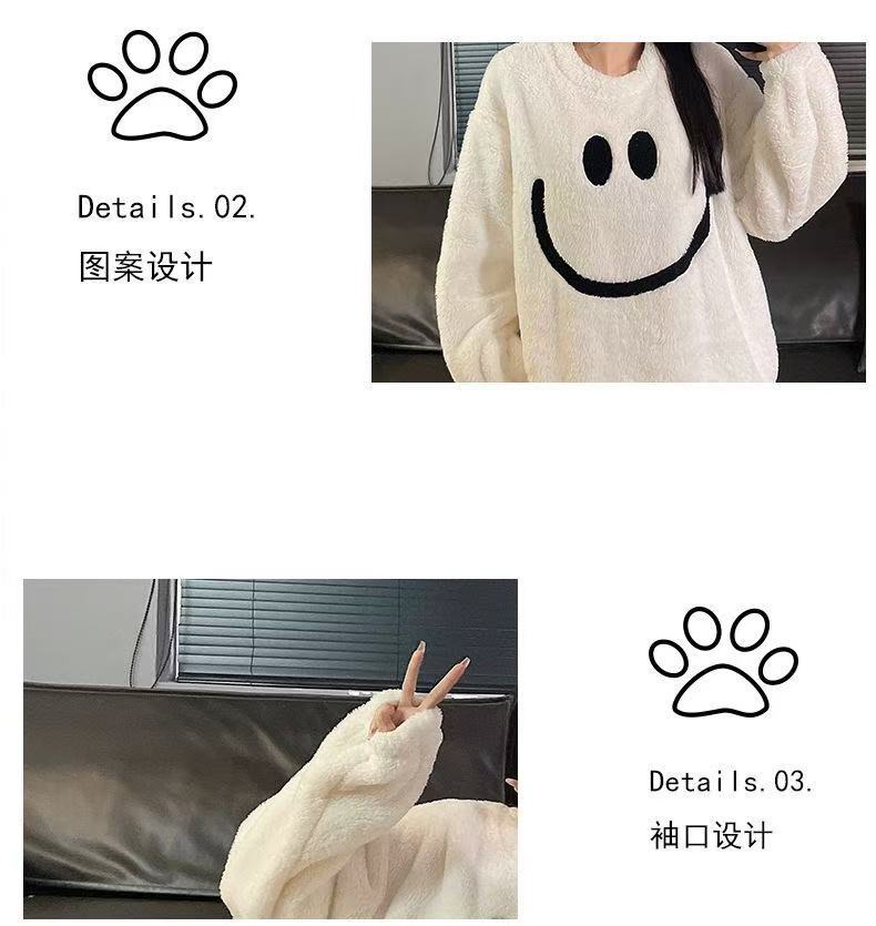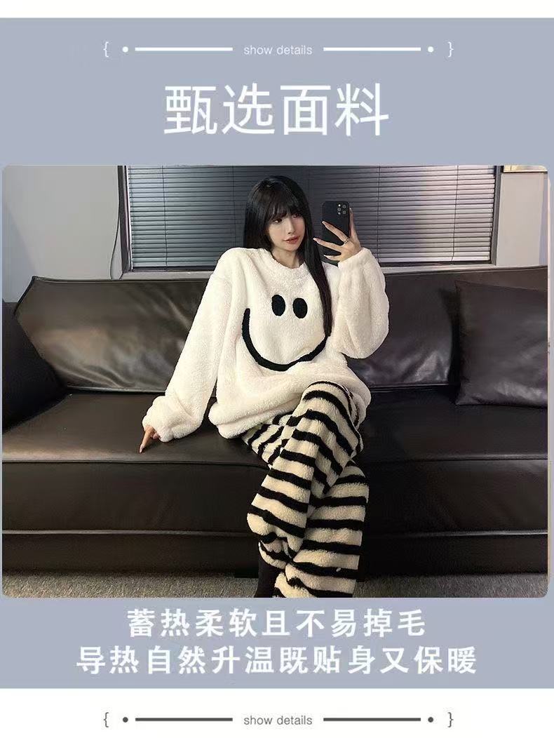 秋冬珊瑚绒笑脸睡衣套装加厚加绒情侣法兰绒套头家居服男女同款