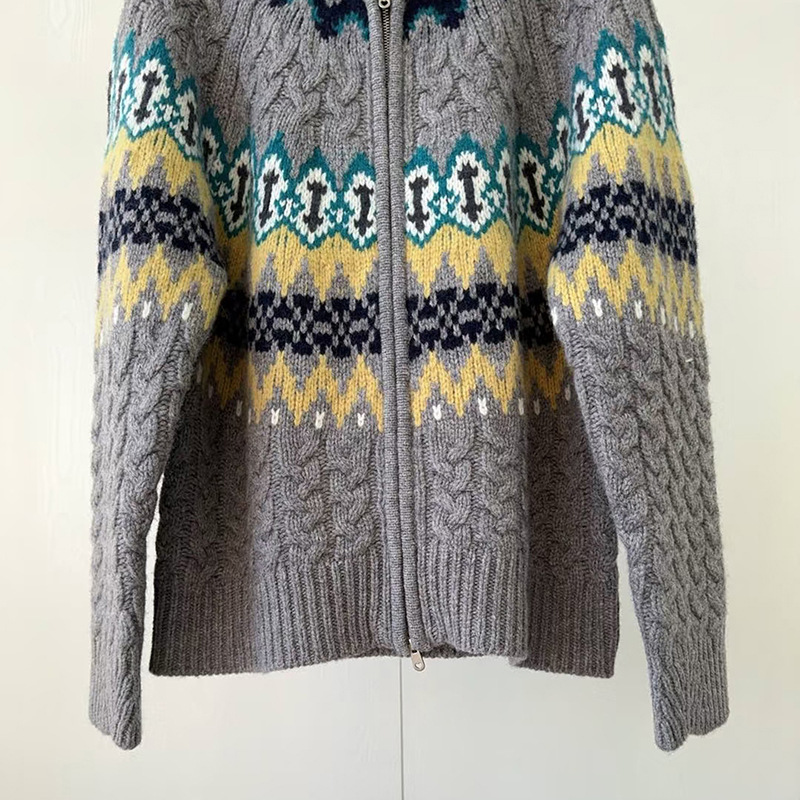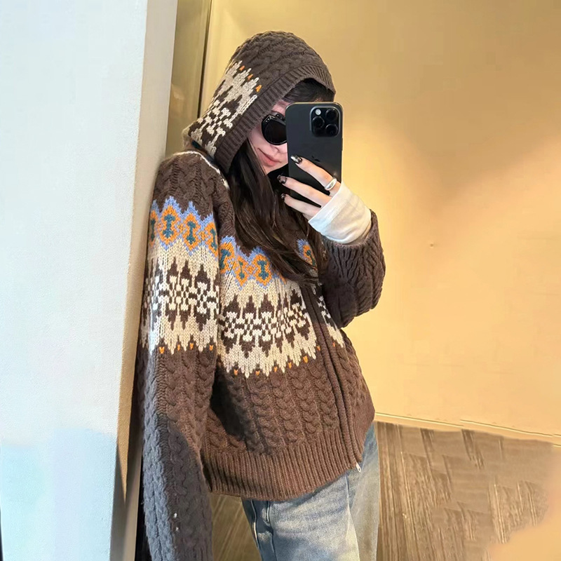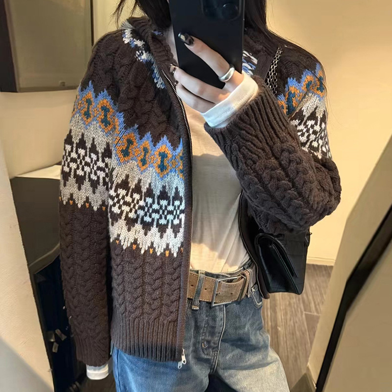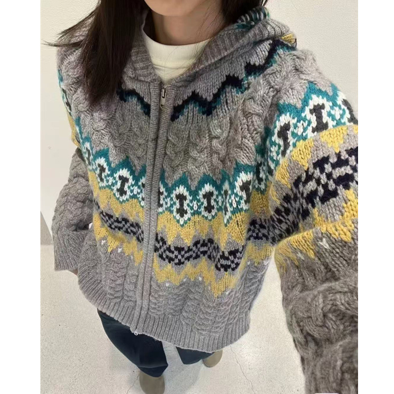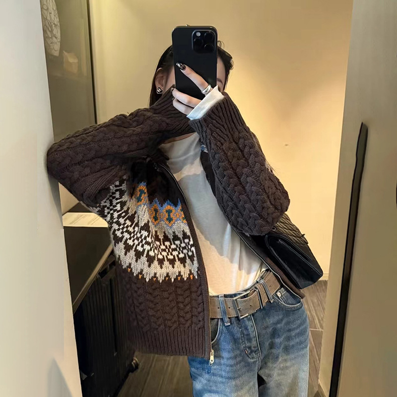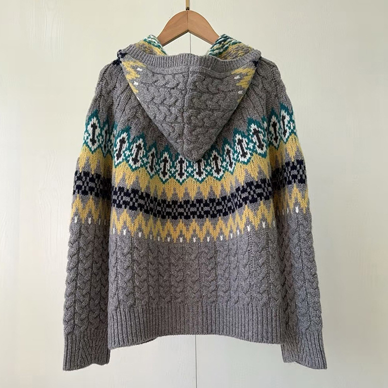 2025纯羊毛开衫女立领撞色提花加厚毛衣外套潮流风山羊绒上衣厂家